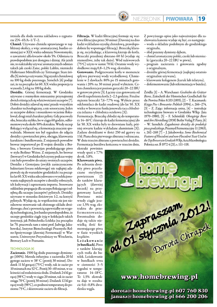 NIEZBĘDNIK PIWOWARA 19 istniała dla słodu norma zakładowa o sygnaturze ZN–65/A–1/T–2. Chmiel. Używano chmielu uprawianego w najbliższej okolicy, a więc aromatycznej, bardzo cenionej już w XIX wieku odmiany Nowotomyski, o zawartości alfa-kwasów około 5%. Odmiana ta prawdopodobnie jest dostępna i dzisiaj. Ale jeżeli nie, to należałoby używać aromatycznych odmian takich jak czeski Zatec, polski Lublin, niemiecki Hallertauer Mittelfrüh czy Tettnanger. Stare źródła [5] mówią o używaniu 3 kg szyszki chmielowej na 100 kg słodu pszennego, Szmelich [6] podaje zaś, że na początku lat 60. XX wieku proporcja ta wynosiła 2,4 kg na 100 kg słodu. Drożdże. Górnej fermentacji. W Grodzisku używano z rozmysłem mieszaniny przynajmniej dwóch różniących się właściwościami szczepów [7]. Dobór drożdży zdawał się mieć przede wszystkim charakter technologiczny, a nie sensoryczny. Jeden ze szczepów dobrze i stosunkowo wcześnie flokulował, drugi miał charakter pylisty. Gdy pracowały oba, brzeczka szybko, bo w ciągu 60 godzin, odfermentowywała około 50% ekstraktu. Wtedy szczep flokujący wyłączał się, a fermentacja znacznie spowalniała. Moment ten był sygnałem do zdjęcia drożdży z powierzchni piwa, obciągu, klarowania karukiem i butelkowania. Z niejasnych powodów browar importował po II wojnie drożdże z Berlina, z browaru Groterjan produkującego piwo w stylu Berliner Weisse. Z niejasnych, bo browar (browary?) w Grodzisku był czynny podczas wojny i nie było powodów do utraty swoistych szczepów. Drożdże z Groterjana (zwykle zanieczyszczone bakteriami kwasu mlekowego) nie najlepiej adaptowały się do warunków grodziskich i na początku lat 60. XX wieku zdecydowano o wyselekcjonowaniu najlepszych szczepów z drożdży roboczych, ich kultywacji i zaprzestania importu. Stosowano oddzielnie propagacje dla szczepu flokującego i odrębną dla szczepu (szczepów) pylistych. Drożdży używano w stosunku ilościowym 1:2, na korzyść pylistych. Wydaje się, że współcześnie nie jest nieodzowne stosowanie tak złożonego układu drożdżowego, choć z pewnością zapewniałby on wygodę technologiczną. Jest bardzo prawdopodobne, że szczepy grodziskie ciągle żyją w kolekcjach takich instytucji, jak Politechnika Łódzka (na początku lat 70. pracowała tam z nimi prof. Jadwiga Jakubowska), Instytut Biotechnologii Przemysłu Rolno-Spożywczego (dawniej Fermentacji) w Warszawie, Uniwersytet Przyrodniczy we Wrocławiu, Browary Lech w Poznaniu. TECHNOLOGIA [4] Zacieranie. 1500 kg słodu pszennego dymionego (100%). Metoda infuzyjna: z zaciernika 20 hl gęstego zacieru w 38o C (postój 30 minut). Dodatek 11 hl gorącej (75oC) wody, tak że zacier po 10 minutach ma 52oC. Postój 30–60 minut, w zależności od rozluźnienia słodu. Dodatek 24 hl gorącej (98oC) wody w ciągu 20 minut, tak że zacier osiąga 70oC (postój 30 minut). Dodatek 12 hl gorącej wody (98oC), co podnosi temperaturę do poziomu 75oC, i skierowanie zacieru do filtracji. Filtracja. W kadzi filtracyjnej formuje się warstwa filtracyjna przez 30 minut (Dawniej na dno kadzi wykładano szyszkę chmielową, prawdopodobnie by wspomagać filtrację). Brzeczkę klaruje się, recyrkulując, a klarowną kieruje do kotła. Brzeczki przedniej zbierano 60 hl (wydaje się niemożliwe, żeby tak dużo). Wód nalewowych (75oC) użyto w sumie 70 hl. Ostatnie wody wysłodkowe mają 0,8–1,2% wag. ekstraktu. Gotowanie. Podgrzewanie kotła w momencie spływu pierwszej wody wysłodkowej. Chmielenie w 2 dawkach: 80% po 15 minutach gotowania i 20% na 30 minut przed wybiciem. Celem chmielenia jest poziom goryczki 20–22 IBU w gotowym piwie [3]. Łączny czas gotowania od chwili napełnienia kotła 2–2,5 godziny. Finalne stężenie brzeczki 7,6–7,7% wag. Wybicie przez odchmielacz do kadzi osadowej (do lat 50. XX wieku w browarze funkcjonowała taca chłodnicza żelazna + chłodnica ociekowa [3]). Fermentacja. Brzeczkę chłodzi się do temperatury 14–16oC i kieruje do kadzi fermentacyjnej (do lat 50. XX wieku były to drewniane kufy, później otwarte kadzie wykładane aluminium [3]). Zadane drożdżami w ilości 250 ml gęstwy na 1 hl. Piana dnia pierwszego zbierana i odrzucana. W dniu trzecim zbierane z powierzchni drożdże. Fermentacja burzliwa kończona w trzecim dniu, ekstrakt powinien wtedy spaść z 7,7% do ok. 3,8%. Klarowanie piwa. Po zebraniu drożdży piwo przetłaczane sterylnym powietrzem (!) do tanków klarujących (dawniej beczek) na przygotowany karuk. Powinno mieć wtedy ciągle jeszcze 1,5% wag. ekstraktu do przefermentowania . Ewentualnie dodaje się także niewielką ilość fermentującego piwa w fazie wysokich krążków. Leżakowanie (w butelkach). Piwo z tanków klarujących trafia do butelek. Leżakowanie w butelkach trwa w ciemności 3–5 tygodni w temperaturze 14–18oC. Te 1,5% ekstraktu daje w rezultacie 0,6–0,8% dwutlenku węgla. Z powyższego opisu jako najważniejsze dla zachowania kanonu wydaje się być, co następuje: – woda o składzie podobnym do grodziskiego oryginału, – słód pszenny dymiony dębem, – chmiel aromatyczny polski, czeski lub niemiecki (goryczka 20–22 IBU w piwie), – program zacierania i gotowania zgodny z oryginalnym, – drożdże górnej fermentacji (najlepiej ostatnio oryginalnie używane), – klarowanie kolagenem (karuk lub żelatyna), – dofermentowanie (lub refermentacja w butelce). Źródła: [1] – A. Warschauer: Geschichte des Grätzer Bieres, Zeitschrift der Historischen Gesellschaft für die Provinz Polen 8:333 (1893), [2] – T. Kaczmarek: Księga Piw i Browarów Polskich (1994), s. 266–274, [3] – Z. Zając: informacja ustna, [4] – instrukcje technologiczne browaru w Grodzisku Wlkp. (lata 1970–1980), [5] – F. Schönfeld: Obergärige Biere und ihre Herstellung (1938) Berlin Verlag P. Parey, [6] – W. Szmelich: Zagadnienie drożdży do produkcji piwa grodziskiego, Przemysł Fermentacyjny 11 (1