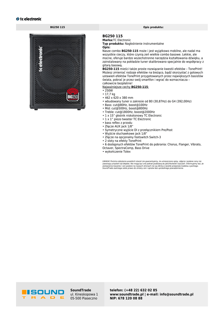 BG250 115 Opis produktu: BG250 115 Marka:TC Electronic Typ produktu: Nagłośnienie instrumentalne Opis: Nasze combo BG250-115 może i jest wyjątkowo mobilne, ale nadal ma wszystkie rzeczy, które czynią zeń wielkie combo basowe. Lekkie, ale mocne, oferuje bardzo wszechstronne narzędzia kształtowania dźwięku, a zainstalowany na pokładzie tuner skalibrowano specjalnie do współpracy z gitarą basową. BG250-115 mieści także proste rozwiązanie kwestii efektów – TonePrint! Możesz zmieniać rodzaje efektów na bieżąco, bądź skorzystać z gotowych ustawień efektów TonePrint przygotowanych przez największych basistów świata, pobrać je przez swój smartfon i wgrać do wzmacniacza – całkowicie bezpłatnie! Najważniejsze cechy BG250-115: • 250W • 17,7 kg • 462 x 620 x 380 mm • wbudowany tuner o zakresie od B0 (30,87Hz) do G4 (392,00Hz) • Bass: cut@80Hz, boost@100Hz • Mid: cut@500Hz, boost@800Hz • Treble: cut@1800Hz, boost@2000Hz • 1 x 15” głośnik niskotonowy TC Electronic • 1 x 1” piezo tweeter TC Electronic • bass reflex z przodu • Złącze AUX jack 1/8” • Symetryczne wyjście DI z przełącznikiem Pre/Post • Wyjście słuchawkowe jack 1/8” • Złącze na opcjonalny footswitch Switch-3 • 2 sloty na efekty TonePrint • 6 dostępnych efektów TonePrint do pobrania: Chorus, Flanger, Vibrato, Octaver, SpectraComp, Bass Drive • wykończenie Tolex UWAGA! Pomimo dołożenia wszelkich starań nie gwarantujemy, że umieszczone opisy, zdjęcia i podane ceny nie zawierają uchybień lub błędów. Nie mogą być one jednak podstawą do jakichkolwiek roszczeń. Informujemy też, że zestawienia towarów i cen podane na naszych stronach nie są ofertą w świetle przepisów kodeksu cywilnego. SoundTrade zastrzega sobie prawo do zmiany cen i opisów bez uprzedniego powiadomienia. SoundTrade ul. Kineskopowa 1 05-500 Piaseczno telefon: (+48 22) 632 02 85 www:soundtrade.pl | e-mail: [email protected] NIP: 678 120 08 88