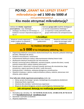 PO FIO „GRANT NA LEPSZY START” mikrodotacje od 1 500 do 5000 zł www.grantnalepszystart.pl Kto może otrzymać mikrodotację? Jeśli tworzysz grupę osób wspólnie działających należysz do młodej organizacji na terenie województwa łódzkiego * pozarządowej z woj. łódzkiego * • działająca nie dłużej niż 18 miesięcy i o • co najmniej 3 osoby pełnoletnie jako budżecie rocznym nieprzekraczającym 25 grupa nieformalna lub samopomocowa tys. zł i chciałbyś: Wspierać rozwój organizacji dzięki środkom na szkolenia i zakup sprzętu Działać na rzecz lokalnej społeczności Wspólnie realizować swoje pasje lub pomagać sobie wzajemnie to możesz otrzymać do 5 • • • • • • • • 000 zł na inicjatywę oddolną, np.: Organizację lokalnych uroczystości okolicznościowych (np. dożynek, pokazów lokalnego dorobku, Mikołajek dla dzieci), Działania charytatywne i wolontariat Kultywowanie lokalnych tradycji, dokumentowanie lokalnej historii ludzi Wydawanie lokalnych biuletynów lub informatorów Rozwój i promocję kultury (biblioteki, wymiana książek, czytanie dla dzieci, rozwój teatrów amatorskich, pokazy lokalnej twórczości) Rozwój sportu i aktywności ruchowej (zawody sportowe dla mieszkańców, biegi tematyczne, zajęcia sportowe dla dzieci i osób starszych) Edukację dzieci i młodzieży, edukację ekologiczną i prozdrowotną Wspólne inicjatywy z zakresu małej architektury (altany, zieleńce, plenerowe mini siłownie, place zabaw) Oraz tylko jako młoda organizacja pozarządowa, m.in. na: • Zakup sprzętu biurowego i sprzętu niezbędnego do prowadzenia działalności • Adaptację lokalu organizacji • Szkolenia dla członków i wolontariuszy organizacji • Wsparcie doradcze (księgowe, prawne, psychologiczne, biznesowe itp.) Jak otrzymać dotację na realizację pomysłów? KROK 1 • Skontaktuj się z doradcą: Tel. 42 719 90 64; 42 231 31 01; 24 388 14 49, 44 732 32 34 email [email protected]; [email protected] • Opowiedz o pomyśle na działania • Wyjaśnij wątpliwości KROK 2 Dla młodej organizacji pozarządowej Wypełnij formularz – wniosek o mikrodotację (pobierz ze strony grantnalepszystart.pl) KROK 2 Dla grupy nieformalnej lub samopomocowej Wypełnij formularz – wniosek o mikrodotację (pobierz ze strony grantnalepszystart.pl) ubiegając się: Wspólnie z samodzielnie minimum 3 osoby organizacją, podpisują wniosek, (np. z fundacją lub umowę na stowarzyszeniem), realizację projektu która udzieli Ci oraz zabezpieczenie osobowości w postaci weksla In prawnej i pomoże blanco w realizacji i rozliczeniu finansowym) KROK 3 Wyślij wypełniony i podpisany wniosek listem poleconym na adres operatora obejmującego swoim działaniem Twój powiat lub złóż osobiście w biurze operatora: Powiaty Łęczycki - Zgierski - Łowicki – Poddębicki - Skierniewicki - Miasto Skierniewice - Brzeziński - Zduńskowolski - Rawski Stowarzyszenie LGD „POLCENTRUM” Pl. Łukasińskiego 4 95-010 Stryków Powiaty Miasto Łódź - Miasto Piotrków Trybunalski – Piotrkowski - Pabianicki - Bełchatowski Kutnowski - Radomszczański - Opoczyński - Tomaszowski – Pajęczański – Łaski – Sieradzki – Wieluński – Wieruszowski - Łódzki Wschodni Centrum Promocji i Rozwoju Inicjatyw Obywatelskich OPUS PL. Wolności 2 91-415 Łódź W latach 2014-2016 wsparcie trafi do co najmniej 268 młodych organizacji pozarządowych i grup nieformalnych z województwa łódzkiego Terminy realizacji projektu „Grant na lepszy start” - edycji na rok 2014: 1 sierpnia 2014 – ogłoszenie konkursu i naboru wniosków 1 sierpnia - 15 września 2014 – czas składania wniosków 30 września 2014 – ogłoszenie wyników konkursu na rok 2014 i listy organizacji i grup nieformalnych, które otrzymają mikrodotacje od 1 500 zł – 5 000 zł 1 października – 10 grudnia 2014 – czas realizacji zadania 20 grudnia 2014 – ostateczne rozliczenie mikrodotacji (sprawozdanie finansowe i merytoryczne)