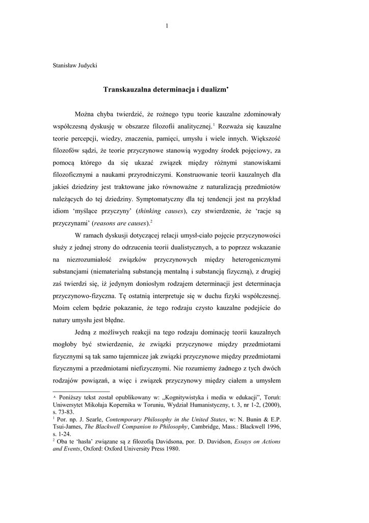 1 Stanisław Judycki Transkauzalna determinacja i dualizm∗ Można chyba twierdzić, że rożnego typu teorie kauzalne zdominowały współczesną dyskusję w obszarze filozofii analitycznej. 1 Rozważa się kauzalne teorie percepcji, wiedzy, znaczenia, pamięci, umysłu i wiele innych. Większość filozofów sądzi, że teorie przyczynowe stanowią wygodny środek pojęciowy, za pomocą którego da się ukazać związek między różnymi stanowiskami filozoficznymi a naukami przyrodniczymi. Konstruowanie teorii kauzalnych dla jakieś dziedziny jest traktowane jako równoważne z naturalizacją przedmiotów należących do tej dziedziny. Symptomatyczny dla tej tendencji jest na przykład idiom ‘myślące przyczyny’ (thinking causes), czy stwierdzenie, że ‘racje są przyczynami’ (reasons are causes).2 W ramach dyskusji dotyczącej relacji umysł-ciało pojęcie przyczynowości służy z jednej strony do odrzucenia teorii dualistycznych, a to poprzez wskazanie na niezrozumiałość związków przyczynowych między heterogenicznymi substancjami (niematerialną substancją mentalną i substancją fizyczną), z drugiej zaś twierdzi się, iż jedynym doniosłym rodzajem determinacji jest determinacja przyczynowo-fizyczna. Tę ostatnią interpretuje się w duchu fizyki współczesnej. Moim celem będzie pokazanie, że tego rodzaju czysto kauzalne podejście do natury umysłu jest błędne. Jedną z możliwych reakcji na tego rodzaju dominację teorii kauzalnych mogłoby być stwierdzenie, że związki przyczynowe między przedmiotami fizycznymi są tak samo tajemnicze jak związki przyczynowe między przedmiotami fizycznymi a przedmiotami niefizycznymi. Nie rozumiemy żadnego z tych dwóch rodzajów powiązań, a więc i związek przyczynowy między ciałem a umysłem Poniższy tekst został opublikowany w: „Kognitywistyka i media w edukacji”, Toruń: Uniwersytet Mikołaja Kopernika w Toruniu, Wydział Humanistyczny, t. 3, nr 1-2, (2000), s. 73-83. 1 Por. np. J. Searle, Contemporary Philosophy in the United States, w: N. Bunin & E.P. Tsui-James, The Blackwell Companion to Philosophy, Cambridge, Mass.: Blackwell 1996, s. 1-24. 2 Oba te ‘hasła’ związane są z filozofią Davidsona, por. D. Davidson, Essays on Actions and Events, Oxford: Oxford University Press 1980. 2 (duszą) nie może przedstawiać tu żadnej szczególnej trudności. Wydaje się, że tak myślał też Kant, gdy w odniesieniu do determinacji przyczynowo-fizycznej stwierdził: Jak zaś coś w ogóle mogłoby być zmienione, w jaki sposób byłoby możliwe, żeby po pewnym stanie w pewnej chwili mógł następować stan przeciwny w innej chwili, o tym a priori nie posiadamy nawet najmniejszego pojęcia.3 A priori nie posiadamy najmniejszego pojęcia na temat ‘jak’ interakcji między przedmiotami fizycznymi, nie możemy też jednak bezpośrednio spostrzegać relacji przyczynowych. Tym, co możemy spostrzegać, jest tylko regularnie powracające następowanie po sobie przedmiotów (zdarzeń). Ten zarzut zwolennicy teorii kauzalnych mogliby jednak odeprzeć mówiąc, że „należy unikać proliferacji tajemnic, chyba że rzeczywiście potrzebujemy czegoś tajemniczego, aby wyjaśnić coś bardzo doniosłego”.4 Nie możemy mieć dwóch rzeczy jednocześnie. Musimy więc odrzucić dualistyczną interpretację natury ludzkiej stosując brzytwę Ockhama w sensie metodologicznej decyzji ‘unikania proliferacji tajemnic’. Kauzalne teorie reprezentacji umysłowych, kauzalne teorie znaczenia terminów mentalnych, kauzalne teorie psychodynamiki - wszystkim tym teoriom, jak sądzę, nie udało się wyjaśnić natury tego, co mentalne. Mimo tego ciągle wielu filozofów umysłu próbuje bronić tego rodzaju stanowisk. Być może główny powód przywiązania do czysto kauzalnych interpretacji umysłu dobrze jest streszczony w stwierdzeniu Fodora, że „...dzisiaj wszyscy jesteśmy materialistami z tego samego powodu, który Churchill podawał za główny powód bycia demokratą: wszystkie inne alternatywy wydają się jeszcze gorsze”. 5 Jeżeli, jak przypuszczam, ekskluzywnie kauzalne podejście do natury umysłu jest błędne, to należy wnioskować, iż umysł poddany jest innemu rodzajowi determinacji niż determinacja przyczynowo-fizyczna, a związek między ciałem a umysłem (duszą) niej jest kauzalny, lecz transkauzalny. Teraz, wykorzystując najczęściej dyskutowane trzy grupy zagadnień, tzn. zagadnienia relacji umysł-umysł, umysłciało i ciało-umysł, postaram się ukazać, na czym polega ta niewystarczalność 3 I. Kant, Krytyka czystego rozumu (tłum. R. Ingarden), Warszawa 1957, B 252. B. Hannan, Subjectivity and Reduction. An Introduction to the Mind-Body Problem, Boulder: Westview Press, 1994, s. 12. 5 J.A. Fodor, Fodor Jerry A., w: S. Guttenplan (wyd.) A Companion to the Philosophy of Mind, Oxford: Blackwell, 1994, s. 292. 4 3 przyczynowości w wyjaśnianiu natury umysłu i przedstawić racje, dla których podstawowa aktywność umysłu ludzkiego może być nazwana aktywnością transkauzalną.6 Pierwszy problem dotyczy relacji umysł - umysł. Jest to tzw. zagadnienie psychodynamiki a główne pytanie brzmi tu następująco: jak różne stany mentalne powiązane są między sobą? Wydaje się bowiem, że zachodzi ogromna różnica między wydaniem na przykład sądu „W Polsce są krowy”, a wytworzeniem zwykłego zbioru szumów czy dźwięków. Różnica ta wydaje się całkowicie przekraczać zwykłą różnicę między przyczynami i skutkami. Najbardziej dzisiaj dyskutowana funkcjonalistyczna reprezentacjonistyczno-komputacyjna sformułowana po to, aby wyjaśnić teoria teoria stanów umysłu mentalnych, (RKTU) czyli została naturę psychodynamiki umysłu ludzkiego. Według RKTU każdy stan intencjonalny, np. przekonanie, że w Polsce są krowy, da się zdefiniować funkcjonalnie. Oznacza to, że z punktu widzenia funkcjonalnego stan ten należy do rodzaju mentalnego ‘przekonanie