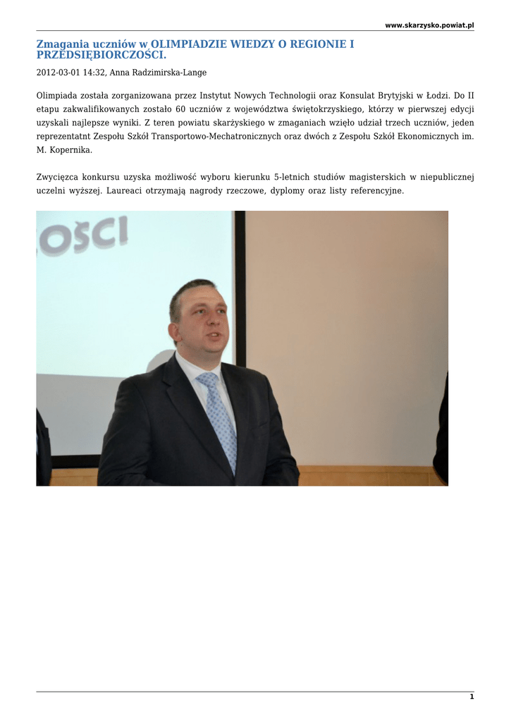 www.skarzysko.powiat.pl Zmagania uczniów w OLIMPIADZIE WIEDZY O REGIONIE I PRZEDSIĘBIORCZOŚCI. 2012-03-01 14:32, Anna Radzimirska-Lange Olimpiada została zorganizowana przez Instytut Nowych Technologii oraz Konsulat Brytyjski w Łodzi. Do II etapu zakwalifikowanych zostało 60 uczniów z województwa świętokrzyskiego, którzy w pierwszej edycji uzyskali najlepsze wyniki. Z teren powiatu skarżyskiego w zmaganiach wzięło udział trzech uczniów, jeden reprezentatnt Zespołu Szkół Transportowo-Mechatronicznych oraz dwóch z Zespołu Szkół Ekonomicznych im. M. Kopernika. Zwycięzca konkursu uzyska możliwość wyboru kierunku 5-letnich studiów magisterskich w niepublicznej uczelni wyższej. Laureaci otrzymają nagrody rzeczowe, dyplomy oraz listy referencyjne. 1 www.skarzysko.powiat.pl 2 www.skarzysko.powiat.pl 3 www.skarzysko.powiat.pl 4