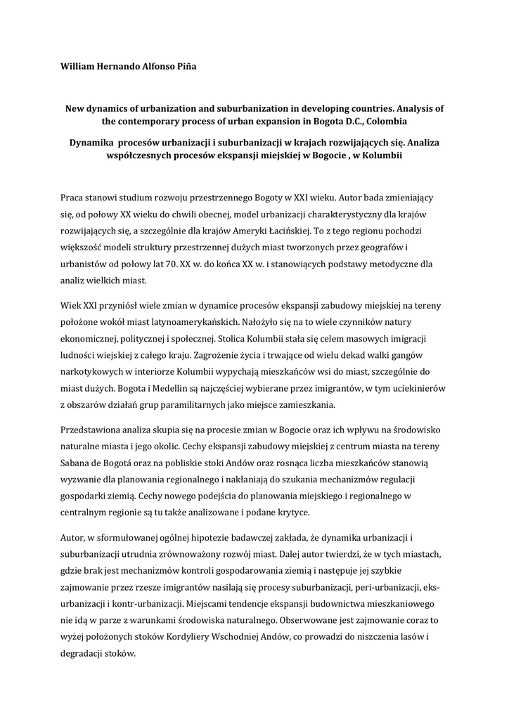 William Hernando Alfonso Piña New dynamics of urbanization and suburbanization in developing countries. Analysis of the contemporary process of urban expansion in Bogota D.C., Colombia Dynamika procesów urbanizacji i suburbanizacji w krajach rozwijających się. Analiza współczesnych procesów ekspansji miejskiej w Bogocie , w Kolumbii Praca stanowi studium rozwoju przestrzennego Bogoty w XXI wieku. Autor bada zmieniający się, od połowy XX wieku do chwili obecnej, model urbanizacji charakterystyczny dla krajów rozwijających się, a szczególnie dla krajów Ameryki Łacińskiej. To z tego regionu pochodzi większość modeli struktury przestrzennej dużych miast tworzonych przez geografów i urbanistów od połowy lat 70. XX w. do końca XX w. i stanowiących podstawy metodyczne dla analiz wielkich miast. Wiek XXI przyniósł wiele zmian w dynamice procesów ekspansji zabudowy miejskiej na tereny położone wokół miast latynoamerykańskich. Nałożyło się na to wiele czynników natury ekonomicznej, politycznej i społecznej. Stolica Kolumbii stała się celem masowych imigracji ludności wiejskiej z całego kraju. Zagrożenie życia i trwające od wielu dekad walki gangów narkotykowych w interiorze Kolumbii wypychają mieszkańców wsi do miast, szczególnie do miast dużych. Bogota i Medellin są najczęściej wybierane przez imigrantów, w tym uciekinierów z obszarów działań grup paramilitarnych jako miejsce zamieszkania. Przedstawiona analiza skupia się na procesie zmian w Bogocie oraz ich wpływu na środowisko naturalne miasta i jego okolic. Cechy ekspansji zabudowy miejskiej z centrum miasta na tereny Sabana de Bogotá oraz na pobliskie stoki Andów oraz rosnąca liczba mieszkańców stanowią wyzwanie dla planowania regionalnego i nakłaniają do szukania mechanizmów regulacji gospodarki ziemią. Cechy nowego podejścia do planowania miejskiego i regionalnego w centralnym regionie są tu także analizowane i podane krytyce. Autor, w sformułowanej ogólnej hipotezie badawczej zakłada, że dynamika urbanizacji i suburbanizacji utrudnia zrównoważony rozwój miast. Dalej autor twierdzi, że w tych miastach, gdzie brak jest mechanizmów kontroli gospodarowania ziemią i następuje jej szybkie zajmowanie przez rzesze imigrantów nasilają się procesy suburbanizacji, peri-urbanizacji, eksurbanizacji i kontr-urbanizacji. Miejscami tendencje ekspansji budownictwa mieszkaniowego nie idą w parze z warunkami środowiska naturalnego. Obserwowane jest zajmowanie coraz to wyżej położonych stoków Kordyliery Wschodniej Andów, co prowadzi do niszczenia lasów i degradacji stoków. Analiza wspomnianych procesów prowadzi do konkluzji dotyczącej ewolucji modelu rozwoju przestrzennego Bogoty od połowy lat 50. XX wieku do chwili obecnej. Po fazie wzrostu aglomeracji miasta, od 1994 r. można mówić intensywnym procesie metropolizacji, zaś od początków XXI wieku o tworzeniu się regionu miejskiego. Ekspansja zabudowy następuje na tereny otaczających Bogotę municypiów, przy utrzymującej się silnej stratyfikacji społecznoprzestrzennej związanej z polityką regulacji wprowadzaną od ponad 20 lat na terenach miast.