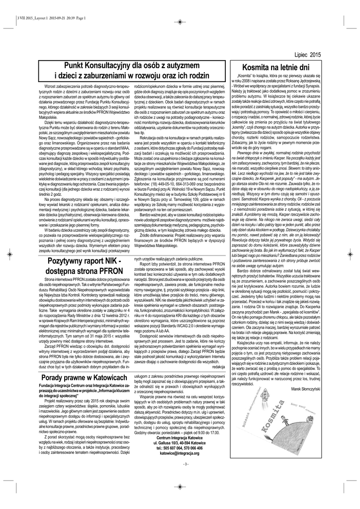 3 VII 2015_Layout 1 2015-09-21 20:39 Page 1 Punkt Konsultacyjny dla osób z autyzmem i dzieci z zaburzeniami w rozwoju oraz ich rodzin Wzrost zabezpieczenia potrzeb diagnostyczno-terapeutycznych rodzin z dziećmi z zaburzeniami rozwoju oraz osób z rozpoznaniem zaburzeń ze spektrum autyzmu to główny cel działania prowadzonego przez Fundację Punktu Konsultacyjnego, którego działalność w zakresie bieżących 3 sesji konsultacyjnych wspiera aktualnie ze środków PFRON Województwo Małopolskie. Dzięki temu wsparciu działalność diagnostyczno-terapeutyczna Punktu może być skierowana do rodzin z terenu Małopolski, ze szczególnym uwzględnieniem mieszkańców powiatu Nowy Sącz, nowosądeckiego i powiatów sąsiednich - gorlickiego oraz limanowskiego. Organizowane przez nas badania diagnostyczne przeprowadzane są w oparciu o standard MAA, obejmujący diagnozę zespołową i wielospecjalistyczną. Podczas konsultacji każde dziecko w sposób indywidualny poddawane jest diagnozie, którą przeprowadza zespół konsultacyjny (diagnostyczny), w skład którego wchodzą: lekarz psychiatra, psycholog i pedagog specjalny. Wszyscy specjaliści posiadają wieloletnie doświadczenie w pracy z osobami z autyzmem i praktykę w diagnozowaniu tego schorzenia. Czas trwania pojedynczej konsultacji (dla jednego dziecka wraz z rodzicami) wynosi średnio 2 godz. Na proces diagnostyczny składa się: obszerny i szczegółowy wywiad lekarski z rodzicami/ opiekunami, analiza dokumentacji medycznej i psychologicznej dziecka, badanie lekarskie dziecka (psychiatryczne), obserwacja kierowana dziecka, omówienie z rodzicami/ opiekunami wyniku konsultacji, opracowanie i przekazanie jego pisemnej formy. W badaniu dziecka uczestniczy cały zespół diagnostyczny, co pozwala na przeprowadzenie wielospecjalistycznego rozpoznania i pełnej oceny diagnostycznej z uwzględnieniem wszystkich sfer rozwoju dziecka. Wymiernym efektem pracy zespołu konsultacyjnego jest wynik konsultacji przekazywany Pozytywny raport NIK dostępna strona PFRON Strona internetowa PFRON została dobrze przystosowana dla osób niepełnosprawnych. Tak o witrynie Państwowego Funduszu Rehabilitacji Osób Niepełnosprawnych wypowiedziała się Najwyższa Izba Kontroli. Kontrolerzy sprawdzali realizację obowiązku dostosowania witryn internetowych do potrzeb osób niepełnosprawnych przez podmioty wykonujące zadania publiczne. Takie wymagania określone zostały w załączniku nr 4 do rozporządzenia Rady Ministrów z dnia 12 kwietnia 2012 r. w sprawie Krajowych Ram Interoperacyjności, minimalnych wymagań dla rejestrów publicznych i wymiany informacji w postaci elektronicznej oraz minimalnych wymagań dla systemów teleinformatycznych. Tym samym od 31 maja 2015 r. wszystkie urzędy powinny mieć dostępne strony internetowe. Zarząd PFRON wiedząc o obowiązku dot. dostępności witryny internetowej z wyprzedzeniem podjął działania, aby strona PFRON była nie tylko dobrze dostosowana, ale i zwyczajnie przyjazna dla użytkowników niepełnosprawnych. Fundusz chce być w tych działaniach dobrym przykładem dla in- Porady prawne w Katowicach Fundacja Integracja Centrum oraz Integracja Katowice zapraszają do uczestnictwa w projekcie „Informacja kluczem do integracji społecznej” Projekt realizowany przez cały 2015 rok obejmuje swoim zasięgiem cztery województwa: śląskie, pomorskie, lubuskie i mazowieckie. Jego głównym celem jest zapewnienie osobom niepełnosprawnym dostępu do informacji i specjalistycznych usług. W ramach projektu oferowane są bezpłatnie: Indywidualne konsultacje prawne, poradnictwo prawne grupowe, poradnictwo społeczno-prawne. Z porad skorzystać mogą osoby niepełnosprawne bez względu na wiek, rodzaj i stopień niepełnosprawności oraz osoby z najbliższego otoczenia, a także instytucje, pracodawcy i osoby zainteresowane tematem niepełnosprawności. Dzięki rodzicom/opiekunom dziecka w formie ustnej oraz pisemnej, gdzie obok diagnozy znajduje się opis poczynionych względem dziecka obserwacji, a także zalecenia do dalszej pracy terapeutycznej z dzieckiem. Obok badań diagnostycznych w ramach projektu realizowane są również konsultacje terapeutyczne dla osób z rozpoznaniem zaburzeń ze spektrum autyzmu oraz ich rodziców z uwagi na potrzeby podiagnostyczne - konieczność monitoringu rozwoju dziecka, dostosowywania kierunków oddziaływania, uzyskanie dokumentów na potrzeby orzecznictwa itp. Rekrutacja osób na konsultacje w ramach projektu realizowana jest przede wszystkim w oparciu o kontakt telefoniczny z osobami, które dotychczas zgłosiły do Fundacji potrzebę realizacji badań i oczekują na możliwość ich przeprowadzenia. Może zostać ona uzupełniona o bieżące zgłoszenia na konsultacje ze strony mieszkańców Województwa Małopolskiego, ze szczególnym uwzględnieniem powiatu Nowy Sącz, nowosądeckiego i powiatów sąsiednich - gorlickiego, limanowskiego. Zgłoszenia na konsultacje przyjmowane są pod numerami telefonów: (18) 449-05-10, 664-313-069 oraz bezpośrednio w biurze Fundacji przy Al. Wolności 19 w Nowym Sączu. Punkt Konsultacyjny mieści się w budynku Szkoły Podstawowej nr 6 w Nowym Sączu przy ul. Tarnowskiej 109, gdzie w ramach współpracy ze Szkołą mamy możliwość korzystania z wygospodarowanych na ten cel pomieszczeń. Bardzo ważne jest, aby w czasie konsultacji rodzice/opiekunowie udostępnili zespołowi diagnostycznemu możliwie najobszerniejszą dokumentację medyczną, pedagogiczną, psychologiczną dziecka, w tym książeczkę zdrowia małego dziecka. Źródło dofinansowania: Projekt realizowany przy wsparciu finansowym ze środków PFRON będących w dyspozycji Województwa Małopolskiego. nych urzędów realizujących zadania publiczne. Raport Izby potwierdził, że strona internetowa PFRON została opracowana w taki sposób, aby zachowywać wysoki kontrast bez konieczności używania w tym celu dodatkowych narzędzi. Strona jest zbudowa