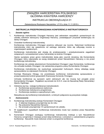 ZWIĄZEK HARCERSTWA POLSKIEGO GŁÓWNA KWATERA HARCERZY INSTRUKCJA OBOWIĄZUJĄCA 01 Zatwierdzona Rozkazem Naczelnika L7/15 z dnia 11.11.2015 r. INSTRUKCJA PRZEPROWADZANIA KONFERENCJI INSTRUKTORSKICH I. Zasada ogólna 1. Konferencja instruktorska Chorągwi Harcerzy jest zebraniem wszystkich uprawnionych do udziału członków starszyzny Organizacji Harcerzy, posiadających przydział ewidencyjny do danej Chorągwi. 2. Charakter konferencji instruktorskiej. Konferencja instruktorska Chorągwi powinna odbywać się rocznie. Natomiast konferencja instruktorska różni się zasadniczo od walnego zebrania, które się odbywają rocznie w organizacjach społecznych. Konferencja instruktorska jest okazją do przekazywania i przedyskutowania zagadnień związanych z prowadzeniem pracy harcerskiej na terenie Chorągwi. Opinie wyrażane przez grono instruktorskie służą jako czynnik doradczy dla Komendanta Chorągwi, który odpowiada za swoją działalność przed Naczelnikiem Harcerzy a nie przed konferencją instruktorską. Konferencja nie udziela absolutorium Komendantowi Chorągwi i jego Komendzie, konferencja nie uchwala budżetu Chorągwi i nie zatwierdza programu pracy Komendanta Choragwi. Konferencja instruktorska nie wysłuchuje sprawozdań hufcowych, którzy składają swoje sprawozdania na odprawach Komendy Chorągwi. Komisja Rewizyjna Okręgu nie przedstawia konferencji instruktorskiej sprawozdania z przeprowadzonej kontroli gospodarki finansowej Komendy Chorągwi. Uchwały konferencji są wyrazem opinii zebranych ale nie muszą być przyjęte przez Komendanta Chorągwi. Wyjątkiem są wnioski do G.K.H. oraz do Naczelnej Rady Harcerskiej i Zjazdu Ogólnego. 3. Odróżnia się trzy rodzaje konferencji instruktorskich: a. Konferencja sprawozdawczo-wyborcza, b. Konferencja metodyczno-programowa, c. Konferencja zwołana w specyficznym celu. Niewyklucza się konferencji instruktorskich, w których połączone są powyższe rodzaje. II. Zastosowanie 4. Konferencję instruktorską zwołuje Komendant Chorągwi: a. Z własnej inicjatywy przynajmniej raz do roku b. Na polecenie Naczelnika Harcerzy c. Na wniosek przynajmniej 1/3 uprawnionych do udziału. 5. W wyjątkowych wypadkach konferencja instruktorska może być zwołana przez Naczelnika Harcerzy. 6. Komendant Chorągwi zwołujący konferencję instruktorską melduje o tym Naczelnikowi Harcerzy conajmniej 2 miesiące przed datą konferencji z wnioskem o zatwierdzenie programu konferencji. Naczelnik może dokonać zmian w programie konferencji. G.K.H. Wydział Regulaminów 2015 r. Kierownik, hm Michał Nalewajko 7. Komendant Chorągwi informuje wszystkich uprawnionych do udziału w konferencji o terminie, miejscu oraz proponowanym programie konferencji conajmniej jeden miesiąc przed datą konferencji. 8. W konferencji instruktorskiej biorą udział czynni, zgodnie z Regulaminem Starszyzny: a. Harcmistrze, podharcmistrze, przewodnicy, działacze harcerscy w Organizacji Harcerzy oraz instruktorki zuchowe. b. P.o. hufcowi, nawet jeżeli nie należą do żadnej z powyższych grup. 9. Udział w konferencji instruktorskiej jest obowiązkowy. W wypadku niemożliwości wzięcia udziału obowiązuje przysłanie usprawiedliwienia na piśmie, które powinno dotrzeć do Komendanta Chorągwi przed rozpoczęciem konferencji. Komendant Chorągwi może zezwolić na udział w konferencji instruktorskiej za pomocą technologii telekonferencyjnej. 10. Konferencja instruktorska odbywa się bez względu na ilość obecnych. 11. Konferencji instruktorskiej sprawozdawczo-wyborczej przewodniczy uczestnik konferencji wybrany zwykłą większością głosów. Innym konferencjom przewodniczy Komendant Chorągwi lub instruktor wyznaczony przez Komendanta Chorągwi. 12. Przewodniczący przeprowadza konferencję według programu zatwierdzonego przez Naczelnika Harcerzy. Przewodniczący prosi jednego lub dwóch uczestników konferencji na funkcję sekretarza/y konferencji. 13. Komisja skrutacyjna. Na konferencjach, gdzie odbywają się wybory lub uchwalane będą wnioski, przewodniczący przeprowadza wybór komisji składającej się z kilku osób z pośród obecnych na konferencji, której zadaniem jest liczenie głosów. 14. Prawo głosowania oraz udział w wyborach kandydatów na Komendanta Chorągwi mają wszyscy uczestnicy konferencji, którzy posiadają czynne prawo wyborcze, zgodnie z Regulaminem Starszyzny Organizacji Harcerzy. 15. Instruktor mieszkający daleko od miejsca konferencji posiadający czynne prawo wyborcze ma prawo przekazania swego głosu instruktorowi jego wyboru obecnemu na konferencji, który ma czynne prawo wyborcze informując o tym Komendanta Chorągwi. Instruktor otrzymujący głos może mieć przekazane maksimum dwa głosy. 16. Uchwały zapadają większością głosów, przy czym liczą się jedynie głosy obecnych na konferencji oraz głosy przekazane (proxy) . 17. Po zakończeniu każdej konferencji, Komendant Chorągwi który ją zwołał jest zobowiązany przedstawić Naczelnikowi Harcerzy protokól konferencji, najpóźniej w ciągu jednego miesiąca od daty odbycia konferencji. III. Konferencja sprawozdawczo-wyborcza 18. Wybory kandydatów na Komendanta Chorągwi odbywają się w zasadzie co dwa lata. 19. Konferencja sprawozdawczo-wyborcza ma na celu: a. Wysłuchanie i przedyskutowanie sprawozdania Komendanta Chorągwi b. Przeprowadzenie wyborów kandydatów na Komendanta Chorągwi 20. Sprawozdanie powinno obejmować cały zakres działalności Komendanta Chorągwi w obecnej kadencji. Powinno zawierać zestawienie finansowe uwzględniając stan kasy i majątku Chorągwi na koniec kadencji potwierdzone przez Komisję Rewizyjną Okręgu. Potwierdzenie Komisji Rewizyjnej Okręgu istnieje jako zapis w książce kasowej chorągwi. 21. Konferencja wybiera dwóch kandydatów, do przedstawienia Naczelnikowi Harcerzy. W normalnym trybie, Naczelnik mianuje kandydata, który uzyskał najwięcej głosów na kolejnego Komendanta Chorągwi. Może