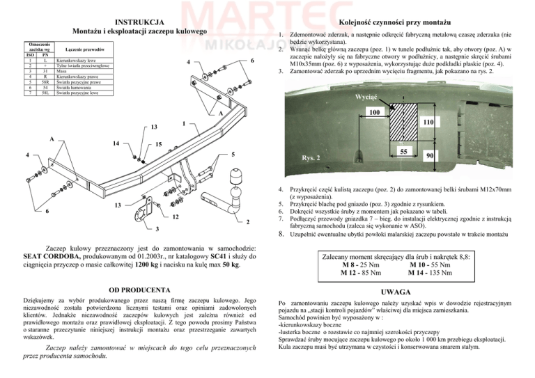 INSTRUKCJA MontaŜu i eksploatacji zaczepu kulowego Oznaczenie zacisku wg ISO PN 1 L 2 + 3 31 4 R 5 58R 6 54 7 58L Kolejność czynności przy montaŜu 1. 2. Łączenie przewodów Kierunkowskazy lewe Tylne światła przeciwmgłowe Masa Kierunkowskazy prawe Światła pozycyjne prawe Światła hamowania Światła pozycyjne lewe 6 4 3. Zdemontować zderzak, a następnie odkręcić fabryczną metalową czaszę zderzaka (nie będzie wykorzystana). Wsunąć belkę główną zaczepu (poz. 1) w tunele podłuŜnic tak, aby otwory (poz. A) w zaczepie nałoŜyły się na fabryczne otwory w podłuŜnicy, a następnie skręcić śrubami M10x35mm (poz. 6) z wyposaŜenia, wykorzystując duŜe podkładki płaskie (poz. 4). Zamontować zderzak po uprzednim wycięciu fragmentu, jak pokazano na rys. 2. Wyciąć 100 A A 14 110 1 13 15 5 4 Rys. 2 4. 13 6 12 2 3 Zaczep kulowy przeznaczony jest do zamontowania w samochodzie: SEAT CORDOBA, produkowanym od 01.2003r., nr katalogowy SC41 i słuŜy do ciągnięcia przyczep o masie całkowitej 1200 kg i nacisku na kulę max 50 kg. 5. 6. 7. 8. 55 90 Przykręcić część kulistą zaczepu (poz. 2) do zamontowanej belki śrubami M12x70mm (z wyposaŜenia). Przykręcić blachę pod gniazdo (poz. 3) zgodnie z rysunkiem. Dokręcić wszystkie śruby z momentem jak pokazano w tabeli. Podłączyć przewody gniazdka 7 – bieg. do instalacji elektrycznej zgodnie z instrukcją fabryczną samochodu (zaleca się wykonanie w ASO). Uzupełnić ewentualne ubytki powłoki malarskiej zaczepu powstałe w trakcie montaŜu Zalecany moment skręcający dla śrub i nakrętek 8,8: M 8 - 25 Nm M 10 - 55 Nm M 12 - 85 Nm M 14 - 135 Nm OD PRODUCENTA UWAGA Dziękujemy za wybór produkowanego przez naszą firmę zaczepu kulowego. Jego niezawodność została potwierdzona licznymi testami oraz opiniami zadowolonych klientów. JednakŜe niezawodność zaczepów kulowych jest zaleŜna równieŜ od prawidłowego montaŜu oraz prawidłowej eksploatacji. Z tego powodu prosimy Państwa o staranne przeczytanie niniejszej instrukcji montaŜu oraz przestrzeganie zawartych wskazówek. Po zamontowaniu zaczepu kulowego naleŜy uzyskać wpis w dowodzie rejestracyjnym pojazdu na „stacji kontroli pojazdów” właściwej dla miejsca zamieszkania. Samochód powinien być wyposaŜony w : -kierunkowskazy boczne -lusterka boczne o rozstawie co najmniej szerokości przyczepy Sprawdzać śruby mocujące zaczepu kulowego po około 1 000 km przebiegu eksploatacji. Kula zaczepu musi być utrzymana w czystości i konserwowana smarem stałym. Zaczep naleŜy zamontować w miejscach do tego celu przeznaczonych przez producenta samochodu. PPUH AUTO-HAK S.J. WyposaŜenie zaczepu: Produkcja Haków Holowniczych Henryk & Zbigniew Nejman 76-200 SŁUPSK ul. Słoneczna 16K tel/fax (059) 8-414-414; 8-414-413 E-mail: [email protected] www. autohak.com.pl Zaczep kulowy bez wyposaŜenia elektrycznego Nr kat. SC41 Dane techniczne: Przeznaczony do zamontowania w samochodzie: wartość siły D: 6,96 kN maksymalna masa przyczepy: 1200 kg Producent: SEAT maksymalny nacisk na kulę: 50 kg Model: CORDOBA Klasa: A50-X produkowanym od 01.2003r. Numer homologacji zgodnie z wytycznymi regulaminu EKG/ONZ 55.01: E20-55R-01 0799 KARTA GWARANCYJNA Producent udziela gwarancji niniejszą kartą gwarancyjną na okres 24 miesięcy licząc od dnia zakupu zaczepu kulowego do samochodu: SEAT CORDOBA produkowanego od 01.2003r. Data produkcji .............................. Data zakupu............................................. Zakres gwarancji obejmuje wyłącznie wady jakościowe wynikające z winy producenta. Gwarancja nie obejmuje natomiast uszkodzeń zawinionych przez nabywcę, wynikających z niewłaściwego montaŜu, uŜytkowania lub konserwacji, uszkodzeń mechanicznych, normalnego zuŜycia podczas eksploatacji itp. Gwarancja udzielona na zakupiony towar nie wyłącza, nie ogranicza ani nie zawiesza uprawnień kupującego wynikających z niezgodności towaru z umową. Reklamacje naleŜy zgłaszać w punkcie sprzedaŜy, składając jednocześnie kartę gwarancyjną. Usunięcie "wady" następuje po stwierdzeniu przez punkt sprzedaŜy wspólnie z producentem słuszności złoŜonej reklamacji. Reklamacja powinna być załatwiona w ciągu 14 dni od dnia uznania reklamacji. Karta gwarancyjna jest niewaŜna jeŜeli nie jest wypełniona i podpisana. Data zgłoszenia reklamacji: ................................................................... INFORMACJA WSTĘPNA Zaczep kulowy jest skonstruowany zgodnie z zasadami bezpieczeństwa ruchu drogowego. Zaczep kulowy jest elementem wpływającym na bezpieczeństwo jazdy i moŜe zostać zainstalowany wyłącznie przez personel wyspecjalizowany. Niedopuszczalne jest dokonywanie jakichkolwiek zmian w konstrukcji zaczepu. Powoduje to wygaśniecie dopuszczenia do stosowania. W przypadku obecności masy izolacyjnej lub osłony podwozia w miejscu przylegania zaczepu, naleŜy ją usunąć. Nieosłonięte miejsca karoserii oraz wywiercone otwory naleŜy pomalować farbą antykorozyjną. Informacjami wiąŜącymi odnośnie wartości obciąŜeń są dane podawane przez producenta samochodu, względnie wartości maksymalnej masy przyczepy oraz maksymalnego nacisku na kulę, przy czym wartości parametrów zaczepu kulowego nie mogą być przekroczone. Wzór do obliczania wartości siły D: Maks. masa przyczepy [kg] x Maks. masa samochodu [kg] Maks. masa przyczepy [kg] + Maks. masa samochodu [kg] X 9,81 = 1000 D [kN]