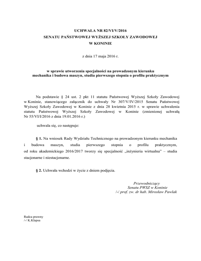 UCHWAŁA NR 82/VI/V/2016 SENATU PAŃSTWOWEJ WYŻSZEJ SZKOŁY ZAWODOWEJ W KONINIE z dnia 17 maja 2016 r. w sprawie utworzenia specjalności na prowadzonym kierunku mechanika i budowa maszyn, studia pierwszego stopnia o profilu praktycznym Na podstawie § 24 ust. 2 pkt 11 statutu Państwowej Wyższej Szkoły Zawodowej w Koninie, stanowiącego załącznik do uchwały Nr 307/V/IV/2015 Senatu Państwowej Wyższej Szkoły Zawodowej w Koninie z dnia 28 kwietnia 2015 r. w sprawie uchwalenia statutu Państwowej Wyższej Szkoły Zawodowej w Koninie (zmienionej uchwałą Nr 55/VI/I/2016 z dnia 19.01.2016 r.) uchwala się, co następuje: § 1. Na wniosek Rady Wydziału Technicznego na prowadzonym kierunku mechanika i budowa maszyn, studia pierwszego stopnia o profilu praktycznym, od roku akademickiego 2016/2017 tworzy się specjalność „inżynieria wirtualna” – studia stacjonarne i niestacjonarne. § 2. Uchwała wchodzi w życie z dniem podjęcia. Przewodniczący Senatu PWSZ w Koninie /-/ prof. zw. dr hab. Mirosław Pawlak Radca prawny /-/ K.Klapsa