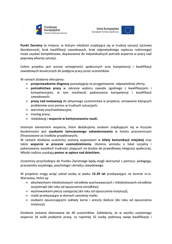 Punkt Zwrotny to miejsce, w którym młodzież znajdująca się w trudnej sytuacji życiowej (bezdomność, brak kwalifikacji zawodowych, brak odpowiedniego zaplecza rodzinnego) może uzyskać kompleksowe, dopasowane do indywidualnych potrzeb wsparcie w pracy nad poprawą własnej sytuacji. Celem projektu jest wzrost umiejętności społecznych oraz kompetencji i kwalifikacji zawodowych koniecznych do podjęcia pracy przez uczestników. W ramach działania oferujemy: • przeprowadzenie diagnozy pozwalającej na przygotowanie odpowiedniej oferty; • pośrednictwo pracy w zakresie wyboru zawodu zgodnego z kwalifikacjami i kompetencjami, w tym możliwość podnoszenia kompetencji i kwalifikacji zawodowych; • pracę nad motywacją do aktywnego uczestnictwa w projekcie, omawianie bieżących problemów oraz pomoc w trudnych sytuacjach; • warsztaty psychoedukacyjne; • trening pracy; • reedukację i wsparcie w kontynuowaniu nauki. Istotnym elementem wsparcia, które dedykujemy osobom znajdującym się w kryzysie bezdomności jest uzyskanie tymczasowego zakwaterowania w hotelu pracowniczym (finansowane ze środków projektowych). W ramach działania uczestnicy zostaną wyposażeni w bilety komunikacji miejskiej oraz także wsparcie w procesie usamodzielnienia, złożeniu wniosku o lokal socjalny i pokonywaniu wszelkich trudności stojących na drodze do prawidłowej integracji społecznej. Młodzi rodzice uzyskają pomoc w opiece nad dzieckiem. Uczestnicy przychodzący do Punktu Zwrotnego będą mogli skorzystać z pomocy: pedagoga, pracownika socjalnego, psychologa i doradcy zawodowego. W projekcie mogą wziąć udział osoby w wieku 15-29 lat przebywające na terenie m.st. Warszawy, które są: • absolwentami młodzieżowych ośrodków wychowawczych i młodzieżowych ośrodków socjoterapii (do roku od opuszczenia ośrodków); • wychowankami pieczy zastępczej (do roku od opuszczenia instytucji); • matki przebywające w domach samotnej matki; • osobami opuszczającymi zakłady karne i areszty śledcze (do roku od opuszczenia instytucji). Działanie zostanie skierowane do 40 uczestników. Zakładamy, że w wyniku uzyskanego wsparcia 16 osób podejmie pracę, co najmniej 32 osoby podniosą swoje kwalifikacje i umiejętności zawodowe lub uzupełnią wykształcenie i 40 osób podniesie swoje umiejętności społeczne. Projekt PUNKT ZWROTNY. Program aktywizacji zawodowej i edukacyjnej realizowany jest w partnerstwie zawartym pomiędzy Fundacją „Instytut Badań nad Demokracją i Przedsiębiorstwem Prywatnym” (która jest liderem projektu), Fundacją po DRUGIE oraz miastem stołecznym Warszawa. Wartość projektu: 688 062,50zł Wkład Funduszy Europejskich: 653 612,50zł Nr projektu: POWR.01.03.01-00-0013/15 Czas realizacji projektu: od: 01.09.2016 - 31.08.2018 PUNKT ZWROTNY: ul. Smulikowskiego 4a lok. 1 00-386 Warszawa tel. 601 405 598 e-mail: [email protected] godz. pracy: pon., śr.: 13:00 – 19:00 wt., czw., pt.: 8:00 – 16:00 BIURO PROJEKTU: Fundacja „Instytut Badań nad Demokracją i Przedsiębiorstwem Prywatnym“ ul. Trębacka 4 pok. 319 00-074 Warszawa tel. 22 630-96-21 e-mail: [email protected] godz. pracy: pon. – pt: 8:30 – 16:30
