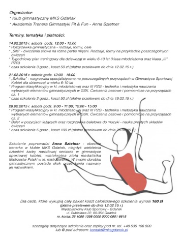 Organizator: * Klub gimnastyczny MKS Gdańsk * Akademia Trenera Gimnastyki Fit & Fun - Anna Sztetner Terminy, tematyka i płatności: 14.02.2015 r. sobota godz. 12:00 - 15:00 * Rozgrzewka gimnastyczna - rodzaje, formy, cele * „Siła” - ćwiczenia siłowe na różne partie mięśni. Rodzaje, formy na przykładzie poszczególnych ćwiczeń * Tygodniowy plan treningowy dla dziewcząt w wieku 6-10 lat (klasa młodzieżowa oraz klasa „III” PZG) * czas szkolenia 3 godz., koszt 50 zł (płatne przelewem do dnia 12.02.15 r.) 21.02.2015 r. sobota godz. 12:00 - 15:00 * „Szkółka” - rozgrzewka specjalistyczna na poszczególnych przyrządach w Gimnastyce Sportowej Kobiet dla dziewcząt w wieku 6-10 lat * Program klasyfikacyjny w kl. młodzieżowej oraz III PZG - technika i metodyka nauczania wybranych elementów gimnastycznych w GSK. Ćwiczenia bazowe i pomocnicze na przyrządach cz. 1 * czas szkolenia 3 godz., koszt 50 zł (płatne przelewem do dnia 19.02.15 r.) 28.02.2015 r. sobota godz. 9:00 - 11:00; 12:00 - 15:00 * Program klasyfikacyjny w kl. młodzieżowej oraz III PZG - technika i metodyka nauczania wybranych elementów gimnastycznych w GSK. Ćwiczenia bazowe i pomocnicze na przyrządach cz. 2 * Balet w pozycjach leżących oraz rozgrzewka baletowa do muzyki - nauka prostych układów ćwiczeń * czas szkolenia 5 godz., koszt 100 zł (płatne przelewem do dnia 26.02.15 r.) Szkolenie poprowadzi Anna Sztetner - obecnie trenerka w klubie MKS Gdańsk, niegdyś wieloletnia członkini kadry narodowej seniorek w gimnastyce sportowej kobiet, wielokrotna złota medalistka Mistrzostw Polski w kl. mistrzowskiej. W swoim dorobku gimnastycznym posiada skok przez konia nazwany jej nazwiskiem. Dla osób, które wykupią cały pakiet koszt całościowego szkolenia wynosi 160 zł (płatne przelewem do dnia 12.02.15 r.) Międzyszkolny Klub Sportowy – Gdańsk ul. Subisława 22, 80-354 Gdańsk nr. konta: 26 1090 1098 0000 0000 0901 6615 szczegóły dotyczące szkolenia oraz zapisy pod nr. tel. +48 535 106 500 lub @ pod adresem: [email protected]