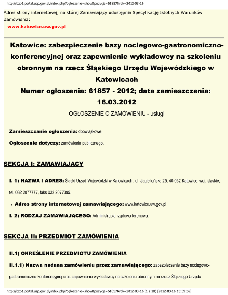 http://bzp1.portal.uzp.gov.pl/index.php?ogloszenie=show&pozycja=61857&rok=2012-03-16 Adres strony internetowej, na której Zamawiający udostępnia Specyfikację Istotnych Warunków Zamówienia: www.katowice.uw.gov.pl Katowice: zabezpieczenie bazy noclegowo-gastronomicznokonferencyjnej oraz zapewnienie wykładowcy na szkoleniu obronnym na rzecz Śląskiego Urzędu Wojewódzkiego w Katowicach Numer ogłoszenia: 61857 - 2012; data zamieszczenia: 16.03.2012 OGŁOSZENIE O ZAMÓWIENIU - usługi Zamieszczanie ogłoszenia: obowiązkowe. Ogłoszenie dotyczy: zamówienia publicznego. SEKCJA I: ZAMAWIAJĄCY I. 1) NAZWA I ADRES: Śląski Urząd Wojewódzki w Katowicach , ul. Jagiellońska 25, 40-032 Katowice, woj. śląskie, tel. 032 2077777, faks 032 2077395. ● Adres strony internetowej zamawiającego: www.katowice.uw.gov.pl I. 2) RODZAJ ZAMAWIAJĄCEGO: Administracja rządowa terenowa. SEKCJA II: PRZEDMIOT ZAMÓWIENIA II.1) OKREŚLENIE PRZEDMIOTU ZAMÓWIENIA II.1.1) Nazwa nadana zamówieniu przez zamawiającego: zabezpieczenie bazy noclegowogastronomiczno-konferencyjnej oraz zapewnienie wykładowcy na szkoleniu obronnym na rzecz Śląskiego Urzędu http://bzp1.portal.uzp.gov.pl/index.php?ogloszenie=show&pozycja=61857&rok=2012-03-16 (1 z 10) [2012-03-16 13:39:36] http://bzp1.portal.uzp.gov.pl/index.php?ogloszenie=show&pozycja=61857&rok=2012-03-16 Wojewódzkiego w Katowicach. II.1.2) Rodzaj zamówienia: usługi. II.1.3) Określenie przedmiotu oraz wielkości lub zakresu zamówienia: Zadanie częściowe nr 1 - kompleksowa usługa zapewnienia bazy noclegowo - konferencyjnej dla grup: a)ok. 40 osób. w terminie 19-20 kwietnia br. b)ok. 45 osób w terminie 17-18 maja br. oraz zapewnienie przeprowadzenia gry taktyczno - strzeleckiej w zamkniętym obiekcie na krytej strzelnicy położonej w Beskidzie Śląskim dla grupy 45 osób wraz z transportem do miejsca usytuowania strzelnicy i z powrotem (od godz. 18.00 do 22.00) c)ok.35 osób w terminie 21-22 czerwca br. oraz zapewnienie przeprowadzenia gry taktyczno - strzeleckiej w zamkniętym obiekcie na krytej strzelnicy położonej w Beskidzie Śląskim dla grupy 35 osób wraz z transportem do miejsca usytuowania strzelnicy i z powrotem (od godz. 18.00 do 22.00) d)k.30 osób w terminie 28-29 czerwca br. Zadanie częściowe nr 2 - zapewnienie wykładowcy,wykładowców do przygotowania i przeprowadzenia wykładu: a) 2 godz. w dniu 19 kwietnia nt.: Rola przedsiębiorcy w systemie bezpieczeństwa narodowego, systemie obrony państwa - funkcjonowanie i kierunki zmian b) 2 godz. w dniu 20 kwietnia nt. Militaryzacja jako szczególna forma realizacji zadań obronnych oraz zakres przygotowań organizacyjno - mobilizacyjnych realizowanych w jednostce przewidzianej do militaryzacji Dokładne godziny realizacji wykładów zostaną podane na 2 tygodnie przed realizacją przedmiotu zamówienia.. II.1.4) Czy przewiduje się udzielenie zamówień uzupełniających: nie. II.1.5) Wspólny Słownik Zamówień (CPV): 55.10.00.00-1, 55.30.00.00-3, 80.51.00.00-2. II.1.6) Czy dopuszcza się złożenie oferty częściowej: tak, liczba części: 2. II.1.7) Czy dopuszcza się złożenie oferty wariantowej: nie. II.2) CZAS TRWANIA ZAMÓWIENIA LUB TERMIN WYKONANIA: Zakończenie: 29.06.2012. SEKCJA III: INFORMACJE O CHARAKTERZE PRAWNYM, EKONOMICZNYM, FINANSOWYM I TECHNICZNYM http://bzp1.portal.uzp.gov.pl/index.php?ogloszenie=show&pozycja=61857&rok=2012-03-16 (2 z 10) [2012-03-16 13:39:36] http://bzp1.portal.uzp.gov.pl/index.php?ogloszenie=show&pozycja=61857&rok=2012-03-16 III.1) WADIUM Informacja na temat wadium: Zamawiający nie wymaga od Wykonawcy złożenia wadium. III.2) ZALICZKI ● Czy przewiduje się udzielenie zaliczek na poczet wykonania zamówienia: nie III.3) WARUNKI UDZIAŁU W POSTĘPOWANIU ORAZ OPIS SPOSOBU DOKONYWANIA OCENY SPEŁNIANIA TYCH WARUNKÓW ● III. 3.1) Uprawnienia do wykonywania określonej działalności lub czynności, jeżeli przepisy prawa nakładają obowiązek ich posiadania Opis sposobu dokonywania oceny spełniania tego warunku ❍ Wykonawca spełni warunek, jeżeli złoży oświadczenie z art. 22 ustawy Pzp w tym zakresie (zgodnie z załącznikiem nr 2 do SIWZ) ● III.3.2) Wiedza i doświadczenie Opis sposobu dokonywania oceny spełniania tego warunku ❍ dla zadania częściowego nr 1 - Wykonawca spełni warunek, jeżeli złoży oświadczenie z art. 22 ustawy Pzp w tym zakresie (zgodnie z załącznikiem nr 2 do SIWZ); dla zadania częściowego nr 2 - Wykonawca spełni warunek, jeżeli złoży oświadczenie w tym zakresie (zgodnie z załącznikiem nr 2 do SIWZ) oraz wykaże, że w okresie ostatnich trzech lat przed upływem terminu składania ofert, a jeżeli okres prowadzenie działalności jest krótszy - w tym okresie, wykonał należycie minimum co najmniej 2 usługi porównywalne z przedmiotem zamówienia - z zastrzeżeniem, że przez usługę porównywalną z przedmiotem zamówienia Zamawiający rozumie przeprowadzenie szkolenia, które obejmowało co najmniej jeden spośród następujących tematów: - system obronny Rzeczypospolitej Polskiej, - przygotowania obronne państwa w świetle obowiązujących kodyfikacji wojskowych, - aspekty prawne do wykonywania obowiązków na rzecz obronności państwa realizowanych przez przedsiębiorców, - jednostki organizacyjne podlegające militaryzacji i ich przygotowania do militaryzacji, - http://bzp1.portal.uzp.gov.pl/index.php?ogloszenie=show&pozycja=61857&rok=2012-03-16 (3 z 10) [2012-03-16 13:39:36] http://bzp1.portal.uzp.gov.pl/index.php?ogloszenie=show&pozycja=61857&rok=2012-03-16 przygotowania obronne jednostek organizacyjnych/przedsiębiorców w obszarze szczególnej ochrony obiektów ważnych dla bezpieczeństwa i obronności państwa. ● III.3.3) Potencjał techniczny Opis sposobu dokonywania oceny spełniania tego warunku ❍ Wykonawca spełni warunek, jeżeli złoży oświadczenie z art. 22 ustawy Pzp w tym zakresie (zgodnie z załącznikiem nr 2 do SIWZ) ● III.3.4) Osoby zdolne do wykonan