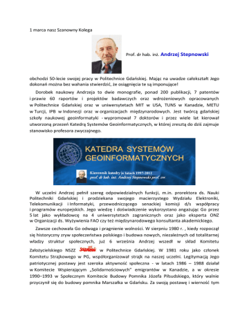 1 marca nasz Szanowny Kolega Prof. dr hab. inż. Andrzej Stepnowski obchodzi 50-lecie swojej pracy w Politechnice Gdańskiej. Mając na uwadze całokształt Jego dokonań można bez wahania stwierdzić, że osiągnięcia te są imponujące! Dorobek naukowy Andrzeja to dwie monografie, ponad 200 publikacji, 7 patentów i prawie 60 raportów i projektów badawczych oraz wdrożeniowych opracowanych w Politechnice Gdańskiej oraz w uniwersytetach MIT w USA, TUNS w Kanadzie, METU w Turcji, IPB w Indonezji oraz w organizacjach międzynarodowych. Jest twórcą gdańskiej szkoły naukowej geoinformatyki - wypromował 7 doktorów i przez wiele lat kierował utworzoną przezeń Katedrą Systemów Geoinformatycznych, w której zresztą do dziś zajmuje stanowisko profesora zwyczajnego. w latach 1997-2012 W uczelni Andrzej pełnił szereg odpowiedzialnych funkcji, m.in. prorektora ds. Nauki Politechniki Gdańskiej i prodziekana swojego macierzystego Wydziału Elektroniki, Telekomunikacji i Informatyki, przewodniczącego senackiej komisji d/s współpracy i programów europejskich. Jego wiedzę i doświadczenie wykorzystano angażując Go przez 5 lat jako wykładowcę na 4 uniwersytetach zagranicznych oraz jako eksperta ONZ w Organizacji ds. Wyżywienia FAO czy też międzynarodowego konsultanta akademickiego. Zawsze cechowała Go odwaga i pragnienie wolności. W sierpniu 1980 r. , kiedy rozpoczął się historyczny zryw społeczeństwa polskiego i budowa nowych, niezależnych od totalitarnej władzy struktur społecznych, już 6 września Andrzej wszedł w skład Komitetu Założycielskiego NSZZ w Politechnice Gdańskiej. W 1981 roku jako członek Komitetu Strajkowego w PG, współorganizował strajk na naszej uczelni. Legitymacją Jego patriotycznej postawy jest szeroka aktywność społeczna - w latach 1986 – 1988 działał w Komitecie Wspierającym „Solidarnościowych” emigrantów w Kanadzie, a w okresie 1990–1993 w Społecznym Komitecie Budowy Pomnika Józefa Piłsudskiego, który walnie przyczynił się do budowy pomnika Marszałka w Gdańsku. Za swoją postawę i wierność tym zasadom, z okazji XXX – lecia powstania NSZZ Kapituła Medalu „Niepokorni na Politechnice Gdańskiej 1945 – 1989” przyznała Andrzejowi to zaszczytne odznaczenie: Prze cały okres swojej pracy wspierał nas swoim doświadczeniem, cennymi inicjatywami i mądrym doradztwem. Andrzeju, liczymy na dalsze Twoje twórcze zaangażowanie dla dobra całej społeczności akademickiej Politechniki Gdańskiej.