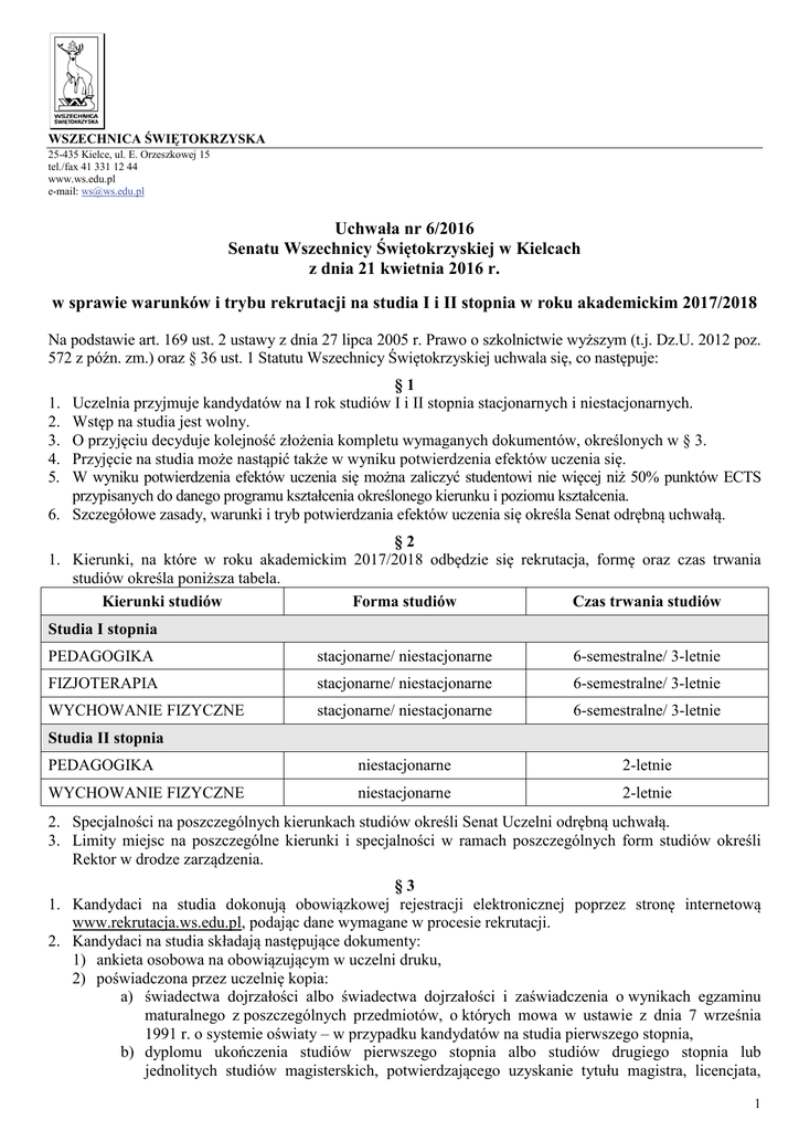 WSZECHNICA ŚWIĘTOKRZYSKA 25-435 Kielce, ul. E. Orzeszkowej 15 tel./fax 41 331 12 44 www.ws.edu.pl e-mail: [email protected] Uchwała nr 6/2016 Senatu Wszechnicy Świętokrzyskiej w Kielcach z dnia 21 kwietnia 2016 r. w sprawie warunków i trybu rekrutacji na studia I i II stopnia w roku akademickim 2017/2018 Na podstawie art. 169 ust. 2 ustawy z dnia 27 lipca 2005 r. Prawo o szkolnictwie wyższym (t.j. Dz.U. 2012 poz. 572 z późn. zm.) oraz § 36 ust. 1 Statutu Wszechnicy Świętokrzyskiej uchwala się, co następuje: 1. 2. 3. 4. 5. 6. §1 Uczelnia przyjmuje kandydatów na I rok studiów I i II stopnia stacjonarnych i niestacjonarnych. Wstęp na studia jest wolny. O przyjęciu decyduje kolejność złożenia kompletu wymaganych dokumentów, określonych w § 3. Przyjęcie na studia może nastąpić także w wyniku potwierdzenia efektów uczenia się. W wyniku potwierdzenia efektów uczenia się można zaliczyć studentowi nie więcej niż 50% punktów ECTS przypisanych do danego programu kształcenia określonego kierunku i poziomu kształcenia. Szczegółowe zasady, warunki i tryb potwierdzania efektów uczenia się określa Senat odrębną uchwałą. §2 1. Kierunki, na które w roku akademickim 2017/2018 odbędzie się rekrutacja, formę oraz czas trwania studiów określa poniższa tabela. Kierunki studiów Forma studiów Czas trwania studiów Studia I stopnia PEDAGOGIKA stacjonarne/ niestacjonarne 6-semestralne/ 3-letnie FIZJOTERAPIA stacjonarne/ niestacjonarne 6-semestralne/ 3-letnie WYCHOWANIE FIZYCZNE stacjonarne/ niestacjonarne 6-semestralne/ 3-letnie PEDAGOGIKA niestacjonarne 2-letnie WYCHOWANIE FIZYCZNE niestacjonarne 2-letnie Studia II stopnia 2. Specjalności na poszczególnych kierunkach studiów określi Senat Uczelni odrębną uchwałą. 3. Limity miejsc na poszczególne kierunki i specjalności w ramach poszczególnych form studiów określi Rektor w drodze zarządzenia. §3 1. Kandydaci na studia dokonują obowiązkowej rejestracji elektronicznej poprzez stronę internetową www.rekrutacja.ws.edu.pl, podając dane wymagane w procesie rekrutacji. 2. Kandydaci na studia składają następujące dokumenty: 1) ankieta osobowa na obowiązującym w uczelni druku, 2) poświadczona przez uczelnię kopia: a) świadectwa dojrzałości albo świadectwa dojrzałości i zaświadczenia o wynikach egzaminu maturalnego z poszczególnych przedmiotów, o których mowa w ustawie z dnia 7 września 1991 r. o systemie oświaty – w przypadku kandydatów na studia pierwszego stopnia, b) dyplomu ukończenia studiów pierwszego stopnia albo studiów drugiego stopnia lub jednolitych studiów magisterskich, potwierdzającego uzyskanie tytułu magistra, licencjata, 1 inżyniera lub równorzędnego, wraz z suplementem – w przypadku kandydatów na studia drugiego stopnia, 3) zaświadczenie lekarskie o wykonanych badaniach profilaktycznych, wydane przez lekarza medycyny pracy na podstawie skierowania z uczelni, określającego czynniki szkodliwe, uciążliwe lub niebezpieczne dla zdrowia, występujące w miejscu odbywania studiów oraz o braku przeciwwskazań do podjęcia nauki we Wszechnicy Świętokrzyskiej (dotyczy kandydatów na kierunki: wychowanie fizyczne oraz fizjoterapia), 4) 2 fotografie (zgodne z wymaganiami stosowanymi przy wydawaniu dowodów osobistych), 5) poświadczona przez uczelnię kopia dowodu osobistego lub innego dokumentu potwierdzającego tożsamość kandydata na studia w przypadku kandydatów będących cudzoziemcami. 3. Osoby ubiegające się o przyjęcie na studia wnoszą opłatę rekrutacyjną w wysokości ustalonej przez Rektora. 4. Osoby przyjęte na studia podpisują z uczelnią umowę o świadczeniu usług edukacyjnych. §4 Osoby niebędące obywatelami polskimi są przyjmowane na studia w języku polskim zgodnie z zasadami określonymi w rozporządzeniu Ministra Nauki i Szkolnictwa Wyższego z dnia 12 października 2006 r. w sprawie podejmowania i odbywania przez cudzoziemców studiów i szkoleń oraz ich uczestniczenia w badaniach naukowych i pracach rozwojowych (Dz. U. 2006 nr 190, poz. 1406 z późn. zm.), przy czym cudzoziemcy, o których mowa w art. 43 ust. 2 Ustawy, mogą podejmować studia na zasadach dotyczących obywateli polskich. §5 1. Świadectwo dojrzałości uzyskane za granicą może być uznane za równoważne z polskim świadectwem dojrzałości na podstawie odpowiedniej umowy międzynarodowej, a w przypadku braku umowy, w trybie uznania albo potwierdzenia wykształcenia lub uprawnień przeprowadzonym zgodnie z rozporządzeniem Ministra Edukacji Narodowej z dnia 25 marca 2015 r. w sprawie postępowania w celu uznania świadectwa lub innego dokumentu albo potwierdzenia wykształcenia lub uprawnień do kontynuacji nauki uzyskanych w zagranicznym systemie oświaty (Dz. U. 2015, poz. 447). 2. Dyplom ukończenia studiów wyższych lub tytuł zawodowy uzyskany za granicą mogą być uznane za równoważne odpowiedniemu polskiemu dyplomowi i tytułowi zawodowemu na podstawie umowy międzynarodowej określającej równoważność, a w przypadku jej braku w drodze nostryfikacji, zgodnie z rozporządzeniem Ministra Nauki i Szkolnictwa Wyższego z dnia 19 sierpnia 2015 r. w sprawie nostryfikacji dyplomów ukończenia studiów wyższych uzyskanych za granicą oraz w sprawie potwierdzenia ukończenia studiów wyższych na określonym poziomie kształcenia (Dz.U. 2015 poz. 1467). §6 1. Rejestracja elektroniczna kandydatów na studia I i II stopnia stacjonarne i niestacjonarne trwa od 14 kwietnia do 22 września 2017 r. 2. Osoby ubiegające się o przyjęcie na studia składają dokumenty w terminie od 5 maja do 25 września 2017 r. 3. W przypadku niewyczerpania limitów miejsc ogłoszona zostanie dodatkowa rekrutacja, termin zakończenia której określa rektor w drodze zarządzenia. §7 Dziekan nadzoruje całość procesu rekrutacji na wydziale i wydaje decyzje o przyjęciu na studia opatrzone własnym podpisem. §8 1. Od decyzji dziekana przysługuje odw
