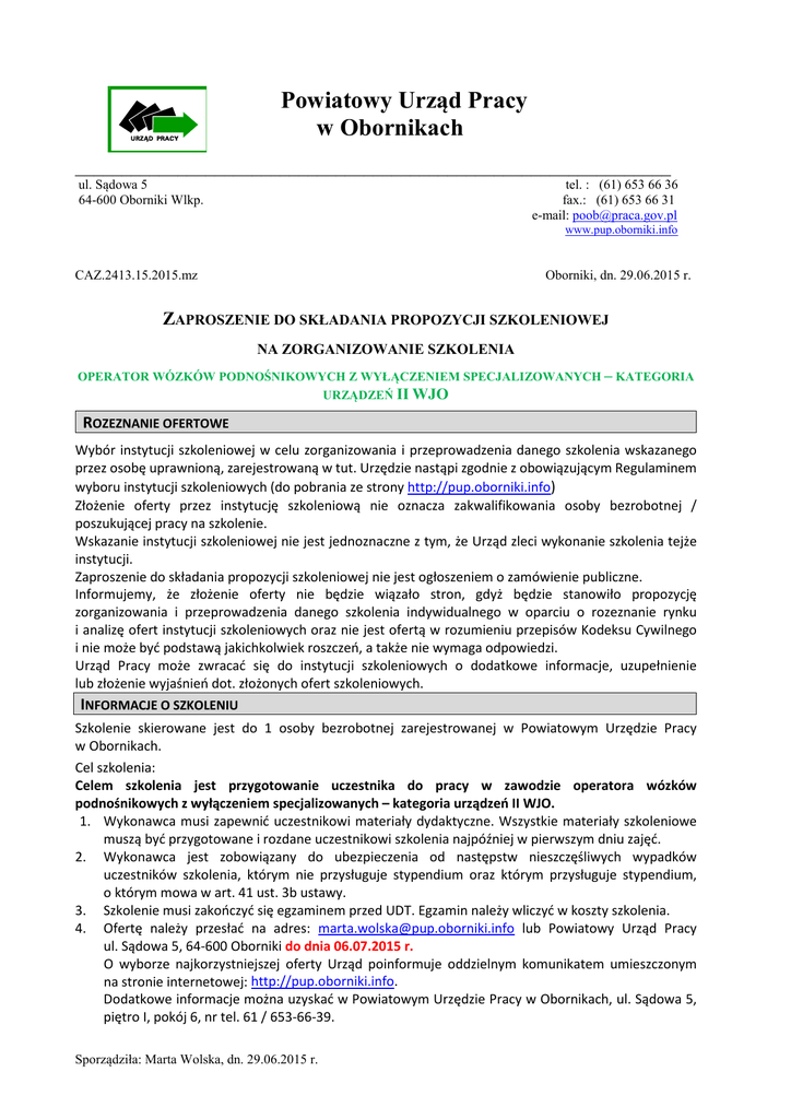 Powiatowy Urząd Pracy w Obornikach ________________________________________________________________ ul. Sądowa 5 64-600 Oborniki Wlkp. tel. : (61) 653 66 36 fax.: (61) 653 66 31 e-mail: [email protected] www.pup.oborniki.info CAZ.2413.15.2015.mz Oborniki, dn. 29.06.2015 r. ZAPROSZENIE DO SKŁADANIA PROPOZYCJI SZKOLENIOWEJ NA ZORGANIZOWANIE SZKOLENIA OPERATOR WÓZKÓW PODNOŚNIKOWYCH Z WYŁĄCZENIEM SPECJALIZOWANYCH – KATEGORIA URZĄDZEŃ II WJO ROZEZNANIE OFERTOWE Wybór instytucji szkoleniowej w celu zorganizowania i przeprowadzenia danego szkolenia wskazanego przez osobę uprawnioną, zarejestrowaną w tut. Urzędzie nastąpi zgodnie z obowiązującym Regulaminem wyboru instytucji szkoleniowych (do pobrania ze strony http://pup.oborniki.info) Złożenie oferty przez instytucję szkoleniową nie oznacza zakwalifikowania osoby bezrobotnej / poszukującej pracy na szkolenie. Wskazanie instytucji szkoleniowej nie jest jednoznaczne z tym, że Urząd zleci wykonanie szkolenia tejże instytucji. Zaproszenie do składania propozycji szkoleniowej nie jest ogłoszeniem o zamówienie publiczne. Informujemy, że złożenie oferty nie będzie wiązało stron, gdyż będzie stanowiło propozycję zorganizowania i przeprowadzenia danego szkolenia indywidualnego w oparciu o rozeznanie rynku i analizę ofert instytucji szkoleniowych oraz nie jest ofertą w rozumieniu przepisów Kodeksu Cywilnego i nie może być podstawą jakichkolwiek roszczeń, a także nie wymaga odpowiedzi. Urząd Pracy może zwracać się do instytucji szkoleniowych o dodatkowe informacje, uzupełnienie lub złożenie wyjaśnień dot. złożonych ofert szkoleniowych. INFORMACJE O SZKOLENIU Szkolenie skierowane jest do 1 osoby bezrobotnej zarejestrowanej w Powiatowym Urzędzie Pracy w Obornikach. Cel szkolenia: Celem szkolenia jest przygotowanie uczestnika do pracy w zawodzie operatora wózków podnośnikowych z wyłączeniem specjalizowanych – kategoria urządzeń II WJO. 1. Wykonawca musi zapewnić uczestnikowi materiały dydaktyczne. Wszystkie materiały szkoleniowe muszą być przygotowane i rozdane uczestnikowi szkolenia najpóźniej w pierwszym dniu zajęć. 2. Wykonawca jest zobowiązany do ubezpieczenia od następstw nieszczęśliwych wypadków uczestników szkolenia, którym nie przysługuje stypendium oraz którym przysługuje stypendium, o którym mowa w art. 41 ust. 3b ustawy. 3. Szkolenie musi zakończyć się egzaminem przed UDT. Egzamin należy wliczyć w koszty szkolenia. 4. Ofertę należy przesłać na adres: [email protected] lub Powiatowy Urząd Pracy ul. Sądowa 5, 64-600 Oborniki do dnia 06.07.2015 r. O wyborze najkorzystniejszej oferty Urząd poinformuje oddzielnym komunikatem umieszczonym na stronie internetowej: http://pup.oborniki.info. Dodatkowe informacje można uzyskać w Powiatowym Urzędzie Pracy w Obornikach, ul. Sądowa 5, piętro I, pokój 6, nr tel. 61 / 653-66-39. Sporządziła: Marta Wolska, dn. 29.06.2015 r. Załączniki: Formularz propozycji szkolenia. Program szkolenia. Harmonogram szkolenia. 2 FORMULARZ PROPOZYCJI SZKOLENIA DANE INSTYTUCJI SZKOLENIOWEJ 1. Nazwa firmy: …………………………………………….…………………………………… ………………………………………………………………………………………………… 2. Adres siedziby: …………………………………….…………………………………………. …………………………………………………….………………………….……………….. 3. Numer telefonu: ……………………………………………………………………………… 4. Fax: …………………………..………………………………………………………………. 5. E-mail: …………………...…………………………………………………………………… 6. NIP: ……………………………………………………...…………………………………… 7. REGON: …………………………………………EKD/PKD: ……………………………… 8. Nazwa banku i nr konta: ……………………………………………………………………… 9. Wpis do Rejestru Instytucji Szkoleniowych: WUP w ……………………...………………… nr: …………………………………….… aktualizacja na rok: ……………………………… 10. Osoba do kontaktu w sprawie Formularza propozycji szkolenia (imię i nazwisko, stanowisko): …………………………………………………………………………………........................ 11. Osoba(y) upoważniona(e) do podpisania umowy (imię i nazwisko, stanowisko): ………………………………………………………………………………………………… 12. Okres ważności propozycji szkolenia (minimum 3 miesiące): ………………….…………… INFORMACJE DOTYCZĄCE SZKOLENIA 1. Nazwa szkolenia: …………….……………………..……………………………………….. ………………………………………...……………………………………………………… 2. Miejsce szkolenia: − zajęcia teoretyczne: …………………………………………………………….………….. − zajęcia praktyczne: ………………………………………………………………………… 3. Czas trwania szkolenia: liczba godzin zajęć ogółem: …………………………...…… w tym: − liczba godzin teoretycznych: ……………………….…….... − liczba godzin praktycznych: ………………….….………… 4. Program szkolenia został opracowany z wykorzystaniem: − standardów kwalifikacji zawodowych i modułowych programów szkoleń zawodowych, dostępnych w bazach danych prowadzonych przez Ministra Pracy i Polityki Społecznej TAK / (www.standardyiszkolenia.praca.gov.pl) ∗ Odpowiednie zaznaczyć 3 NIE∗ 