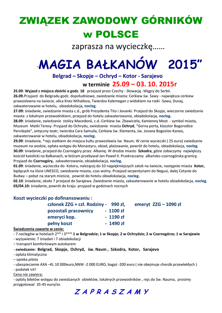 ZWIĄZEK ZAWODOWY GÓRNIKÓW w POLSCE zaprasza na wycieczkę…… MAGIA BAŁKANÓW 2015” '' Belgrad – Skopje – Ochryd – Kotor - Sarajevo w terminie 25.09 – 03. 10. 2015r 25.09: Wyjazd z miejsca zbiórki o godz. 18 przejazd przez Czechy - Słowację -Węgry do Serbii. 26.09.Przyjazd do Belgradu godz. dopołudniowe, zwiedzanie miasta: Cerkiew św. Sawy - największa cerkiew prawosławna na świecie, ulica Knez Mihailova, Twierdza Kalemegan z widokiem na rzeki -Sawa, Dunaj, zakwaterowanie w hotelu, obiadokolacja, nocleg. 27.09: śniadanie, zwiedzanie miasta c.d., grób Prezydenta Tito i Jovanki. Przejazd do Skopje, wieczorne zwiedzanie miasta z lokalnym przewodnikiem, przejazd do hotelu zakwaterowanie, obiadokolacja, nocleg. 28.09: śniadanie, zwiedzanie stolicy Macedonii, c.d.-Cerkiew św. Zbawiciela, Kamienny Most - symbol miasta, Muzeum Matki Teresy. Przyjazd do Ochrydu, zwiedzanie miasta Ochryd, "Gorna porta, klasztor Bogorodice Pervilepte", antyczny teatr, twierdza Cara Samuila, Cerkiew św. Klementa, św. Jovana Bogoslov-Kaneo, zakwaterowanie w hotelu, obiadokolacja, nocleg. 29.09: śniadanie, *rejs statkiem do miejsca kultu prawosławia św. Naum. W cenie wycieczki ( 25 euro) zwiedzanie muzeum na wodzie, opłata wstępu do Monastyru, obiad, plażowanie, powrót do hotelu, obiadokolacja, nocleg. 30.09: śniadanie, przejazd do Czarnogóry przez Albanię. W drodze miasto Szkodra, gdzie zobaczymy największy kościół katolicki na Bałkanach, w którym przebywał Jan Paweł II. Przekraczamy albańsko-czarnogórska granicę. Przyjazd do Czarnogóry, zakwaterowanie, obiadokolacja, nocleg. 01.09: śniadanie, wycieczka do Kotoru, należącej do 10 najpiękniejszych zatok na świecie, następnie miasta Kotor, będących na liście UNESCO, zwiedzanie miasta, czas wolny. Przejazd serpentynami do Negusi, dalej Cetynie do Budwy – pobyt na starym mieście, powrót do hotelu obiadokolacja, nocleg. 02.10: śniadanie, około 7 przejazd do Sarajewa. Zwiedzanie miasta, zakwaterowanie w hotelu obiadokolacja, nocleg. 03/04.10: śniadanie, powrót do kraju- przyjazd w godzinach nocnych Koszt wycieczki po dofinansowaniu : członek ZZG + czł. Rodziny pozostali pracownicy emeryci kop. pełny koszt - 990 zł, 1100 zł 1190 zł 1490 zł emeryt ZZG – 1090 zł Świadczenia zawarte w cenie: - 7 noclegów w hotelach 2** i 3*** 1 w Belgradzie; 1 w Skopje; 2 w Ochrydzie; 2 w Czarnogórze; 1 w Sarajewie - wyżywienie: 7 śniadań i 7 obiadokolacji – transport komfortowym autokarem - zwiedzanie: Belgrad, Skopje, Ochryd, św. Naum , Szkodra, Kotor, Sarajevo - opłata klimatyczna – opieka pilota - ubezpieczenie AXA –KL 10 000euro,NNW -2 000 EURO, bagaż -200 euro ( nie obejmuje chorób przewlekłych ) - podatek VAT Cena nie zawiera: - opłaty biletów wstępu do zwiedzanych obiektów, lokalnych przewodników , rejs do Sw. Nauma, prosimy przygotować 35-45 euro/os Z A P R A S Z A M Y