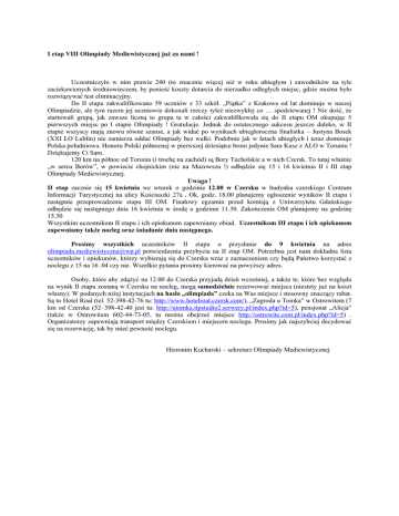 I etap VIII Olimpiady Mediewistycznej juŜ za nami ! Uczestniczyło w nim prawie 240 (to znacznie więcej niŜ w roku ubiegłym ) zawodników na tyle zaciekawionych średniowieczem, by ponieść koszty dotarcia do nierzadko odległych miejsc, gdzie moŜna było rozwiązywać test eliminacyjny. Do II etapu zakwalifikowano 59 uczniów z 33 szkół. „Piątka” z Krakowa od lat dominuje w naszej Olimpiadzie, ale tym razem jej uczniowie dokonali rzeczy tyleŜ niezwykłej co … spodziewanej ! Nie dość, Ŝe startowali grupą, jak zawsze liczną to grupa ta w całości zakwalifikowała się do II etapu OM okupując 5 pierwszych miejsc po I etapie Olimpiady ! Gratulacje. Jednak do ostatecznego sukcesu jeszcze daleko, w II etapie wszyscy mają znowu równe szanse, a jak widać po wynikach ubiegłoroczna finalistka – Justyna Bosek (XXI LO Lublin) nie zamierza oddać Olimpiady bez walki. Podobnie jak w latach ubiegłych i teraz dominuje Polska południowa. Honoru Polski północnej w pierwszej dziesiątce broni jedynie Sara Kusz z ALO w Toruniu ! Dziękujemy Ci Saro. 120 km na północ od Torunia (i trochę na zachód) są Bory Tucholskie a w nich Czersk. To tutaj właśnie „w sercu Borów”, w powiecie chojnickim (nie na Mazowszu !) odbędzie się 15 i 16 kwietnia II i III etap Olimpiady Mediewistycznej. Uwaga ! II etap zacznie się 15 kwietnia we wtorek o godzinie 12.00 w Czersku w budynku czerskiego Centrum Informacji Turystycznej na ulicy Kościuszki 27a . Ok. godz. 18.00 planujemy ogłoszenie wyników II etapu i następnie przeprowadzenie etapu III OM. Finałowy egzamin przed komisją z Uniwersytetu Gdańskiego odbędzie się następnego dnia 16 kwietnia w środę o godzinie 11.30. Zakończenie OM planujemy na godzinę 15.30 Wszystkim uczestnikom II etapu i ich opiekunom zapewniamy obiad. Uczestnikom III etapu i ich opiekunom zapewniamy takŜe nocleg oraz śniadanie dnia następnego. Prosimy wszystkich uczestników II etapu o przysłanie do 9 kwietnia na adres [email protected] potwierdzenia przybycia na II etap OM. Potrzebna jest nam dokładna lista uczestników i opiekunów, którzy wybierają się do Czerska wraz z zaznaczeniem czy będą Państwo korzystać z noclegu z 15 na 16 .04 czy nie. Wszelkie pytania prosimy kierować na powyŜszy adres. Osoby, które aby zdąŜyć na 12.00 do Czerska przyjadą dzień wcześniej, a takŜe te, które bez względu na wynik II etapu zostaną w Czersku na nocleg, mogą samodzielnie rezerwować miejsca (niestety juŜ na koszt własny). W podanych niŜej instytucjach na hasło „olimpiada” czeka na Was miejsce i stosowny znaczący rabat. Są to Hotel Roal (tel. 52-398-42-76 tu: http://www.hotelroal.czersk.com/), „Zagroda u Tomka” w Ostrowitem (7 km od Czerska (52–398-42-40 jest tu: http://utomka.itpstudio2.serwery.pl/index.php?id=5), pensjonat „Alicja” (takŜe w Ostrowitem 602-44-73-05, tu moŜna obejrzeć miejsce http://ostrowite.com.pl/index.php?id=5) . Organizatorzy zapewniają transport między Czerskiem i miejscem noclegu. Prosimy jak najszybciej decydować się na rezerwację, tak by mieć pewność noclegu. Hieronim Kucharski – sekretarz Olimpiady Mediewistycznej