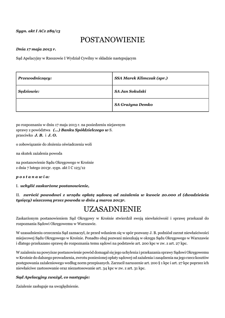 Sygn. akt I ACz 289/13 POSTANOWIENIE Dnia 17 maja 2013 r. Sąd Apelacyjny w Rzeszowie I Wydział Cywilny w składzie następującym Przewodniczący: SSA Marek Klimczak (spr.) Sędziowie: SA Jan Sokulski SA Grażyna Demko po rozpoznaniu w dniu 17 maja 2013 r. na posiedzeniu niejawnym sprawy z powództwa (...) Banku Spółdzielczego w S. przeciwko J. B. i J. O. o zobowiązanie do złożenia oświadczenia woli na skutek zażalenia powoda na postanowienie Sądu Okręgowego w Krośnie z dnia 7 lutego 2013r. sygn. akt I C 123/12 p o s t a n a w i a: I. uchylić zaskarżone postanowienie, II. zwrócić powodowi z urzędu opłatę sądową od zażalenia w kwocie 20.000 zł (dwadzieścia tysięcy) uiszczoną przez powoda w dniu 4 marca 2013r. UZASADNIENIE Zaskarżonym postanowieniem Sąd Okręgowy w Krośnie stwierdził swoją niewłaściwość i sprawę przekazał do rozpoznania Sądowi Okręgowemu w Warszawie. W uzasadnieniu orzeczenia Sąd zaznaczył, że przed wdaniem się w spór pozwany J. B. podniósł zarzut niewłaściwości miejscowej Sądu Okręgowego w Krośnie. Ponadto obaj pozwani mieszkają w okręgu Sądu Okręgowego w Warszawie i dlatego przekazano sprawę do rozpoznania temu sądowi na podstawie art. 200 kpc w zw. z art. 27 kpc. W zażaleniu na powyższe postanowienie powód domagał się jego uchylenia i przekazania sprawy Sądowi Okręgowemu w Krośnie do dalszego prowadzenia, zwrotu poniesionej opłaty sądowej od zażalenia i zasądzenia na jego rzecz kosztów postępowania zażaleniowego według norm przepisanych. Zarzucił naruszenie art. 200 § 1 kpc i art. 27 kpc poprzez ich niewłaściwe zastosowanie oraz niezastosowanie art. 34 kpc w zw. z art. 31 kpc. Sąd Apelacyjny zważył, co następuje: Zażalenie zasługuje na uwzględnienie. Sąd do którego wniesiono pozew zobowiązany jest w pierwszej kolejności do ustalenia – czy jest właściwy do rozpoznania sprawy. Art. 27 § 1 kpc stanowi, iż powództwo wytacza się przed Sąd I instancji, w którego okręgu pozwany ma miejsce zamieszkania (właściwość miejscowa ogólna). Art. 34 kpc mówi o tym, iż powództwo związane z umową wytoczyć można przed sąd miejsca jej wykonania. Przepis z art. 34 kpc mieści się w rozdziale 2, oddział 2 kpc regulującym właściwość przemienną, zatem powództwo w sprawach objętych przepisami oddziału 2 kpc można wytoczyć - bądź według przepisów o właściwości ogólnej, bądź przed sąd oznaczony w przepisach tego oddziału (art. 31 kpc). Istotne jest przy tym, iż wybór sądu został pozostawiony powodowi, który wytaczając powództwo przed sąd inny niż wyznaczony miejscem zamieszkania pozwanego, powinien w pozwie podać okoliczności uzasadniające właściwość sądu według przepisów o właściwości przemiennej (art. 187 § 1 pkt 2 kpc). Również w uchwale Sądu Najwyższego z dnia 9 czerwca 2005r., sygn. akt III CZP 28/05, OSNC 2006, nr 4, poz. 61, wskazano, iż właściwość przemienna sądu, do którego pozew został wniesiony, powinna wynikać z okoliczności wskazanych w pozwie. W niniejszej sprawie powód dokładnie i jednoznacznie uzasadnił w pozwie (w formie wyodrębnionej jednostki redakcyjnej - k. 5v) właściwość przemienną Sądu Okręgowego w Krośnie, wyjaśniając przy tym ponownie podstawę ustalenia miejsca wykonania umowy. Ponadto uszło uwadze Sądu Okręgowego, że o wyborze pomiędzy właściwością ogólną (art. 27 kpc) a właściwością przemienną (art. 34 kpc) decyduje powód, jako strona inicjująca postępowanie, nie zaś strona pozwana. W tej sytuacji, skoro powód dokonał wyboru właściwości przemiennej sądu i wybór ten uzasadnił w pozwie, to nie znajduje zastosowania art. 27 kpc. Dlatego też właściwym miejscowo do rozpoznania niniejszej sprawy jest Sąd Okręgowy w Krośnie. W tym stanie rzeczy Sąd Apelacyjny orzekł, jak w pkt. I sentencji postanowienia, na podstawie art. 386 § 1 kpc w zw. z art. 397 § 2 kpc. Na mocy art. 79 ust. 1 pkt 1 lit. e ustawy z dnia 28 lipca 2005r. o kosztach sądowych w sprawach cywilnych, rozstrzygnięto o zwrocie powodowi uiszczonej opłaty sądowej od zażalenia (pkt II sentencji). O kosztach zastępstwa procesowego niniejszego postępowania zażaleniowego Sąd rozstrzygnie w orzeczeniu kończącym postępowanie w sprawie, stosownie do treści art. 108 § 1 kpc.