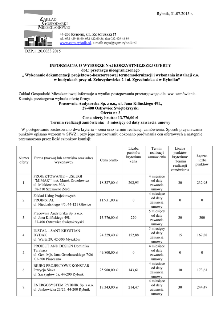 Rybnik, 31.07.2015 Rybnik, 06.12.2012 r. r. 44-200 RYBNIK, UL. KOŚCIUSZKI 17 tel.: 032 429 48 60, 032 422 60 36, fax: 032 429 48 89 www.zgm.rybnik.pl, e mail: [email protected] DZP.1120.0033.2015 INFORMACJA O WYBORZE NAJKORZYSTNIEJSZEJ OFERTY dot.: przetargu nieograniczonego ,, Wykonanie dokumentacji projektowo-kosztorysowej termomodernizacji i wykonania instalacji c.o. w budynkach przy ul. Zebrzydowicka 2 i ul. Zgrzebnioka 4 w Rybniku” Zakład Gospodarki Mieszkaniowej informuje o wyniku postępowania przetargowego dla ww. zamówienia. Komisja przetargowa wybrała ofertę firmy: Pracownia Audytorska Sp. z o.o., ul. Jana Kilińskiego 49L, 27-400 Ostrowiec Świętokrzyski Oferta nr 3 Cena oferty brutto: 13.776,00 zł Termin realizacji zamówienia: 5 miesięcy od daty zawarcia umowy W postępowaniu zastosowano dwa kryteria – cena oraz termin realizacji zamówienia. Sposób przyznawania punktów opisano wzorem w SIWZ i przy jego zastosowaniu dokonano porównania cen ofertowych a następnie przemnożono przez ilość członków komisji: Numer oferty Firma (nazwa) lub nazwisko oraz adres Wykonawcy Cena brutto Liczba punktów kryterium cena 1. PROJEKTOWANIE – USŁUGI ‘’MIMAR’’ inż. Marek Drozdowicz ul. Mickiewicza 30A 58-310 Szczawno Zdrój 18.327,00 zł 202,95 2. Zakład Usług Projektowych PROINSTAL ul. Niedbalskiego 4/5, 44-121 Gliwice 11.931,00 zł 0 3. Pracownia Audytorska Sp. z o.o. ul. Jana Kilińskiego 49L 27-400 Ostrowiec Świętokrzyski 13.776,00 zł 270 4. INSTAL – SANT KRYSTIAN DYDAK ul. Warta 29, 42-300 Myszków 24.329,40 zł 152,88 5. PROJECT AND DESIGN Dominika Tarabasz ul. Gen. Mjr. Jana Grochowskiego 7/26 05-500 Piaseczno 49.800,00 zł 0 6. BIURO PROJEKTOWE KONSTAR Patrycja Sinka ul. Szczygłów 5a, 44-200 Rybnik 25.900,00 zł 143,61 7. ENERGOSYSTEM RYBNIK Sp. z o.o. ul. Jankowicka 23/25, 44-200 Rybnik 17.343,00 zł 214,47 Termin realizacji zamówienia 4 miesiące od daty zawarcia umowy 4 miesiące od daty zawarcia umowy 5 miesięcy od daty zawarcia umowy 5 miesięcy od daty zawarcia umowy 4 miesiące od daty zawarcia umowy 4 miesiące od daty zawarcia umowy 4 miesiące od daty zawarcia umowy Liczba punktów kryterium: Termin realizacji zamówienia Łączna liczba punktów 30 232,95 0 0 30 300 15 167,88 0 0 30 173,61 30 244,47 8. FIRMA PROJEKTOWOBUDOWLANA ,,ARKON’’ Krzysztof Nowak ul. Wawelska 9/9, 44-217 Rybnik 23.370,00 zł 159,15 9. ,,ENEPROJEKT’’ Adam Dziamski ul. Unii Lubelskiej 3 lok. 413 61-249 Poznań 33.456,00 zł 111,18 10. Barysz Point Line Sp. z o.o. ul. Norwida 56, 43-100 Tychy 15.252,00 zł 0 4 miesiące od daty zawarcia umowy 5 miesięcy od daty zawarcia umowy 4 miesiące od daty zawarcia umowy 30 189,15 15 126,18 0 0