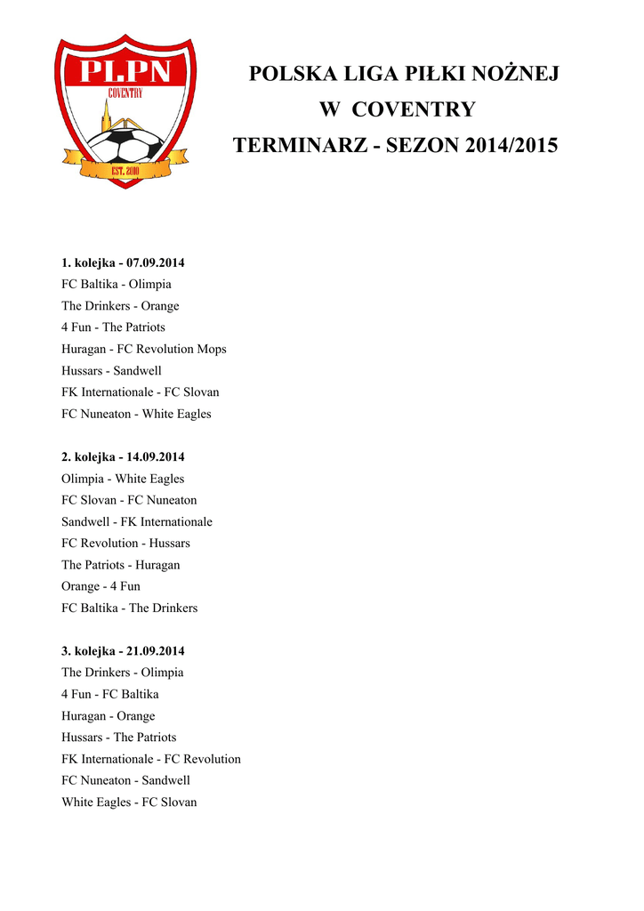 POLSKA LIGA PIŁKI NOŻNEJ W COVENTRY TERMINARZ - SEZON 2014/2015 1. kolejka - 07.09.2014 FC Baltika - Olimpia The Drinkers - Orange 4 Fun - The Patriots Huragan - FC Revolution Mops Hussars - Sandwell FK Internationale - FC Slovan FC Nuneaton - White Eagles 2. kolejka - 14.09.2014 Olimpia - White Eagles FC Slovan - FC Nuneaton Sandwell - FK Internationale FC Revolution - Hussars The Patriots - Huragan Orange - 4 Fun FC Baltika - The Drinkers 3. kolejka - 21.09.2014 The Drinkers - Olimpia 4 Fun - FC Baltika Huragan - Orange Hussars - The Patriots FK Internationale - FC Revolution FC Nuneaton - Sandwell White Eagles - FC Slovan 4. kolejka - 28.09.2014 Olimpia - FC Slovan Sandwell - White Eagles FC Revolution - FC Nuneaton The Patriots - FK Internationale Orange - Hussars FC Baltika - Huragan The Drinkers - 4 Fun 5. kolejka - 05.10.2014 4 Fun - Olimpia Huragan - The Drinkers Hussars - FC Baltika FK Internationale - Orange FC Nuneaton - The Patriots White Eagles - FC Revolution FC Slovan - Sandwell 6. kolejka - 12.10.2014 Olimpia - Sandwell FC Revolution - FC Slovan The Patriots - White Eagles Orange - FC Nuneaton FC Baltika - FK Internationale The Drinkers - Hussars 4 Fun - Huragan 7. kolejka - 19.10.2014 Huragan - Olimpia Hussars - 4 Fun FK Internationale - The Drinkers FC Nuneaton - FC Baltika White Eagles - Orange FC Slovan - The Patriots Sandwell - FC Revolution 8. kolejka - 26.10.2014 Olimpia - FC Revolution The Patriots - Sandwell Orange - FC Slovan FC Baltika - White Eagles The Drinkers - FC Nuneaton 4 Fun - FK nternationale Huragan - Hussars 9. kolejka - 02.11.2014 Hussars - Olimpia FK Internationale - Huragan FC Nuneaton - 4 Fun White Eagles - The Drinkers FC Slovan - FC Baltika Sandwell - Orange FC Revolution - The Patriots 10. kolejka - 09.11.2014 Olimpia - The Patriots Orange - FC Revolution FC Baltika - Sandwell The Drinkers - FC Slovan 4 Fun - White Eagles Huragan - FC Nuneaton Hussars - FK Internationale 11. kolejka - 16.11.2014 FK Internationale - Olimpia FC Nuneaton - Hussars White Eagles - Huragan FC Slovan - 4 Fun Sandwell - The Drinkers FC Revolution - FC Baltika The Patriots - Orange 12. kolejka - 23.11.2014 Olimpia - Orange FC Baltika - The Patriots The Drinkers - FC Revolution 4 Fun - Sandwell Huragan - FC Slovan Hussars - White Eagles FK Internationale - FC Nuneaton 13. kolejka - 30.11.2014 FC Nuneaton - Olimpia White Eagles - FK Internationale FC Slovan - Hussars Sandwell - Huragan FC Revolution - 4 Fun The Patriots - The Drinkers Orange - FC Baltika 14. kolejka - 07.12.2014 Olimpia - FC Baltika Orange - The Drinkers The Patriots - 4 Fun FC Revolution Mops - Huragan Sandwell - Hussars FC Slovan - FK Internationale White Eagles - FC Nuneaton