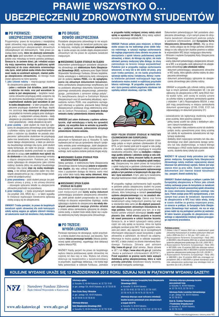 PRAWIE WSZYSTKO O… UBEZPIECZENIU ZDROWOTNYM STUDENTÓW n PO PIERWSZE: UBEZPIECZENIE ZDROWOTNE n PO DRUGIE: DOWÓD UBEZPIECZENIA Przypomnijmy: prawo do korzystania z nieodpłatnej opieki zdrowotnej mają osoby ubezpieczone, a więc objęte powszechnym ubezpieczeniem zdrowotnym (obowiązkowym lub dobrowolnym). Takie prawo posiadają także osoby, które nie ukończyły osiemnastego roku życia (pod warunkiem że mają obywatelstwo polskie oraz mieszkają na terenie państwa polskiego). Oznacza to, że zarówno dzieci, jak i młodzież ucząca się mają zapewniony dostęp do publicznej opieki medycznej aż do czasu ukończenia osiemnastego roku życia. Jeżeli jednak osoba młoda chce kontynuować naukę na uczelniach wyższych, również podlega ubezpieczeniu zdrowotnemu, do którego może zostać zgłoszona na różne sposoby: 1. jako członek rodziny – niepracującego studenta do ubezpieczenia zgłasza wtedy: - jeden z rodziców (lub dziadków, jeżeli żaden z rodziców nie może, oraz pod warunkiem że osoba ta jest ubezpieczona) – bezpłatne świadczenia zdrowotne przysługują wtedy uczącemu się do ukończenia dwudziestego szóstego roku życia - współmałżonek studenta (pod warunkiem że jest to osoba ubezpieczona) – w takim przypadku ubezpieczenie przysługuje studentowi tak długo, dopóki nie za ist nie je in ny obo wią zek ubez pie cze nia (na przykład do momentu podjęcia przez studiującego pracy – z wyłączeniem umowy-zlecenia – kiedy ubezpiecza go pracodawca lub rozpoczęcia działalności gospodarczej – wtedy ubezpiecza się sam) 2. przez uczelnię – jeżeli student nie może być zgłoszony do ubezpieczenia zdrowotnego przez żadnego z członków rodziny (czyli kiedy współmałżonek lub żaden z rodziców czy dziadków nie posiada ubezpieczenia i jednocześnie studentowi nie przysługują żadne inne świadczenia, które gwarantowałyby uzyskanie takiego ubezpieczenia), a także po ukończeniu dwudziestego szóstego roku życia, jeżeli student naukę kontynuuje, ale nadal nie pracuje – obowiązek ubezpieczenia studenta przechodzi na uczelnię, jednakże to uczący sam osobiście musi zgłosić się do dziekanatu w celu złożenia stosownego wniosku o ob ję cie ubez pie cze niem. Po dob nie jest, kie dy osoba zgłaszająca do ubezpieczenia (jako członka rodziny) studenta (który nie ukończył dwudziestego szóstego roku życia) staje się osobą nieubezpieczoną, a nie istnieje jednocześnie żaden inny obowiązek ubezpieczenia go (np. z tytułu innego świadczenia lub podjęcia pracy) 3. przez pracodawcę – jeżeli student pracuje (na podsta wie umo wy o pra cę, a nie umo wy-zle ce nia) – obowiązek opłacania składki na ubezpieczenie zdrowotne przechodzi na pracodawcę 4. przez instytucje – z tytułu przyznanych świadczeń (na przykład: ZUS, KRUS itp.) – w takim wypadku to instytucje wypłacające świadczenia zgłaszają osobę uczącą się do ubezpieczenia. Posiadanie ubezpieczenia zdrowotnego to nie wszystko. Aby uzyskać dostęp do świadczeń publicznej opieki medycznej, niezbędny jest dokument potwierdzający, iż osoba ucząca się została objęta ubezpieczeniem zdrowotnym lub ma prawo do uzyskania świadczeń medycznych. UWAGA!!! Trzeba pamiętać, że prawo do bezpłatnych świadczeń opieki zdrowotnej dla osób kończących szkołę wyższą wygasa po upływie czterech miesięcy od zakończenia nauki lub skreślenia z listy studentów. n MIESZKANIEC ŚLĄSKA STUDIUJE NA ŚLĄSKU Dokumentem potwierdzającym posiadanie ubezpieczenia zdrowotnego jest elektroniczna Karta Ubezpieczenia Zdrowotnego (KUZ), wydawana przez Śląski Oddział Wojewódzki Narodowego Funduszu Zdrowia bezpłatnie. Osoba wnioskująca o elektroniczną kartę zobowiązana jest do podania numeru PESEL oraz do wylegitymowa nia się ak tu al nym do ku men tem toż sa mo ści. Adres zamieszkania ubezpieczonego weryfikowany jest na podstawie aktualnego dokumentu tożsamości lub pisemnego oświadczenia ubezpieczonego, potwierdzającego „zamieszkanie z zamiarem stałego pobytu”. Po zwe ry fi ko wa niu da nych w Cen tral nym Wy ka zie Ubezpieczonych oraz ich ewentualnej aktualizacji, wprowadzeniu numeru PESEL oraz uzupełnieniu wymaganych informacji w systemie, pracownik Sekcji Obsługi Ubezpieczonych przekazuje drogą elektroniczną wniosek do Centrum Personalizacji, a następnie drukuje wniosek o kartę i potwierdzenia złożenia wniosku. w przypadku każdej następnej zmiany należy uiścić opłatę w wysokości 80 złotych, którą należy wpłacić na konto właściwego oddziału NFZ. UWAGA! Podczas pobytu poza miejscem, w którym osoba ucząca się ma wybranego przez siebie lekarza rodzinnego, w sytuacji nagłego zachorowania lub nagłego pogorszenia stanu zdrowia ma prawo do skorzystania z opieki lekarza podstawowej opieki zdrowotnej, a lekarz, do którego się zgłosi, nie może odmówić pomocy medycznej tylko dlatego, że chory za miesz ku je na te re nie in ne go wo je wódz twa! Podobnie jest w przypadku nagłego zachorowania wieczorem, w nocy lub w dni wolne od pracy, przy czym trzeba pamiętać, że nie każda przychodnia sprawuje opiekę nocną i świąteczną. Adresy i numery te le fo nów pal có wek re a li zu ją cych te go ty pu świadczenia można znaleźć w najbliższej przychodni lekarza rodzinnego. W przypadku zagrożenia zdrowia i życia pomocy udziela pogotowie ratunkowe lub szpitalny oddział ratunkowy, czyli tzw. SOR. WNIOSEK jest zatem drukowany z systemu automatycz nie, stąd wnio sku ją cy o kar tę ma spraw dzić jedynie, czy wszystkie dane na wniosku są prawidłowe, i pod pi sać wnio sek, jed no cześ nie otrzy mu je potwierdzenie złożenia wniosku. Jeżeli dokumenty składane są w Biurze Obsługi Ubezpieczonych w Katowicach przy ul. Kossutha 13, karta wydawana jest od razu po sprawdzeniu danych i podpisaniu wniosku przez wnioskującego. Jeżeli ubezpieczony korzysta z pozostałych sekcji ubezpieczenia zdrowotne