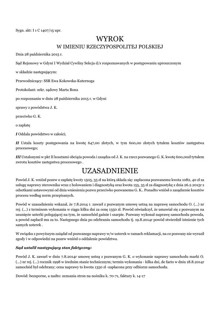 Sygn. akt: I 1 C 1407/15 upr. WYROK W IMIENIU RZECZYPOSPOLITEJ POLSKIEJ Dnia 28 października 2015 r. Sąd Rejonowy w Gdyni I Wydział Cywilny Sekcja d/s rozpoznawanych w postępowaniu uproszczonym w składzie następującym: Przewodniczący: SSR Ewa Kokowska-Kuternoga Protokolant: sekr. sądowy Marta Bona po rozpoznaniu w dniu 28 października 2015 r. w Gdyni sprawy z powództwa J. K. przeciwko G. K. o zapłatę I Oddala powództwo w całości; II Ustala koszty postępowania na kwotę 647,00 złotych, w tym 600,00 złotych tytułem kosztów zastępstwa procesowego; III Ustalonymi w pkt II kosztami obciąża powoda i zasądza od J. K. na rzecz pozwanego G. K. kwotę 600,00zł tytułem zwrotu kosztów zastępstwa procesowego . UZASADNIENIE Powód J. K. wniósł pozew o zapłatę kwoty 1505, 35 zł na którą składa się: zapłacona pozwanemu kwota 1082, 40 zł za usługę naprawy sterownika wraz z holowaniem i diagnostyką oraz kwota 155, 35 zł za diagnostykę z dnia 26.2.2015r z odsetkami ustawowymi od dnia wniesienia pozwu przeciwko pozwanemu G. K.. Ponadto wniósł o zasądzenie kosztów procesu według norm przepisanych. Powód w uzasadnieniu wskazał, że 7.8.2014 r. zawarł z pozwanym umowę ustną na naprawę samochodu O. (...) nr rej. (...) z terminem wykonania w ciągu kilku dni za cenę 1350 zł. Powód oświadczył, że umawiał się z pozwanym na usunięcie usterki polegającej na tym, że samochód gaśnie i szarpie. Pozwany wykonał naprawę samochodu powoda, a powód zapłacił mu za to. Następnego dnia po odebraniu samochodu tj. 19.8.2014r powód stwierdził istnienie tych samych usterek . W związku z powyższym zażądał od pozwanego naprawy w/w usterek w ramach reklamacji, na co pozwany nie wyraził zgody i w odpowiedzi na pozew wniósł o oddalenie powództwa. Sąd ustalił następujący stan faktyczny: Powód J. K. zawarł w dniu 7.8.2014r umowę ustną z pozwanym G. K. o wykonanie naprawy samochodu marki O. (...) nr rej. (...) rocznik 1998 w średnim stanie technicznym; termin wykonania - kilka dni, de facto w dniu 18.8.2014r samochód był odebrany; cena naprawy to kwota 1350 zł -zapłacona przy odbiorze samochodu. Dowód: bezsporne, a nadto: zeznania stron na nośniku k. 70-71, faktury k. 14-17 G. K. przetransportował samochód J. K. na lawecie do siedziby świadka T. K. celem zdiagnozowania usterki ; ustalono podczas diagnozy , że przyczyną gaśnięcia i rwania jest usterka sterownika pompy paliwowej . Świadek T. K. wystawił fakturę za swoją pracę. G. K. kazał więc wymontować sterownik pompy paliwowej w pojeździe J. K., następnie zawiózł tę część do warsztatu świadka K. S., który naprawił ten sterownik; wystawił fakturę za swoja pracę; następnie część została zamonowana z powrotem w samochodzie V. nr rej (...) Dowód: bezsporne, ponadto : zeznania świadka T. K. na nośniku - k.69-70, zeznania świadka K. S. k 68-69 na nośniku, zeznania stron k. 70-71 na nośniku, faktury k. 14-17 Po odebraniu w/w samochodu w dniu 19.8.2014r powód J. K. stwierdził, że mimo, iż wyjechał z warsztatu G. K. samodzielnie i samochód był sprawny, to zaczął gasnąć i rwać, jak przedtem ,wobec czego zgłosił reklamację i zażądał naprawy w ramach uiszczonej ceny. Pozwany odmówił. Powód zgłosił więc sprawę do Miejskiego Rzecznika Konsumentów w G. w dniu 18.9.2014r,a wobec nieuznania reklamacji przez G. K. - do Polubownego Sądu Konsumenckiego w G.. Na skutek korespondencji pozwanego z w/w rzecznikiem po zgłoszeniu sprawy przez powoda, pozwany nadal odmówił uznania reklamacji stwierdzając, że usterka aktualnie występująca w samochodzie J. K., chociaż podobna w objawach nie jest skutkiem wadliwej naprawy, ale kolejnej awarii innej części. Dowód: bezsporne, nadto zeznania świadka T. K. na nośniku - k.69-70, zeznania świadka K. S. k 68-69 zeznania stronk 96-9,zgłoszenie reklamacyjne (k.18-22, 24-28) Naprawa została wykonana przez pozwanego zgodnie z diagnozą wykonaną przez kooperantów pozwanego i naprawiona część jest sprawna do dziś. Powód wiedząc o tym nie zlecił G. K. naprawy samochodu w zakresie następnej usterki, tylko żądał naprawy tej nowej usterki w ramach zapłaconej wcześniej ceny. Dokonał zlecenia serwisowego w dniu 16.2.2015r do firmy (...) w S. celem zdiagnozowania usterki i zapłacił za to 155 , 35 zł. Ostatecznie w sierpniu 2015r J. K. sprzedał ten samochód, a nabywca , świadek Z. W. (1), wymienił tylko świece żarowe i zawór elektroniczny za ok. 80 zł i samochód był sprawny; Dowód: zeznania świadka Z. W., k. 72-3 na nośniku, zeznania stron, k. 70-71 na nośniku Sąd zważył co następuje: Po analizie akt sprawy i zebranego materiału dowodowego, roszczenie powoda uznać należy za niezasadne i nie zasługujące na uwzględnienie. Sąd stwierdził, że zebrane w sprawie dowody, zeznania świadków oraz stron, a także dokumenty, na podstawie których Sąd ustalił stan faktyczny, posiadają walor prawdziwości i wiarygodności. Sąd oparł przede wszystkim swoje stanowisko w sprawie na zeznaniach świadków oraz pozwanego i powoda. Wszystkie te zeznania są wyczerpujące, zawierają szczegółowy opis przebiegu zdarzeń i są ze sobą spójne ,logiczne, tworzą ustalony przez Sąd stan faktyczny. Sąd stwierdził, że zeznania świadków T. K., K. S., Z. W. (1) są potwierdzone stanowiskiem wyrażonym w zeznaniach przez pozwanego i powoda oraz dokumentami załączonymi do pozwu i odpowiedzi na pozew, a także zgodne z korespondencją stron z Rzecznikiem Konsumenta i Polubownym Sądem Konsumenckim. Zatem Sąd w pełni dał wiarę zeznaniom wszystkich świadków i stron. One stanowią w przeważającej mierze podstawę rozstrzygnięcia sporu. Sąd kierował się głównie tymi dowodami w zakresie ustalenia , czy nastąpiła wada w wykonaniu zamówionej naprawy samochodu. Sąd stwierdził, że zeznania stron pokrywają się ze sobą i z zeznaniami świadków. Zeznania powoda nie