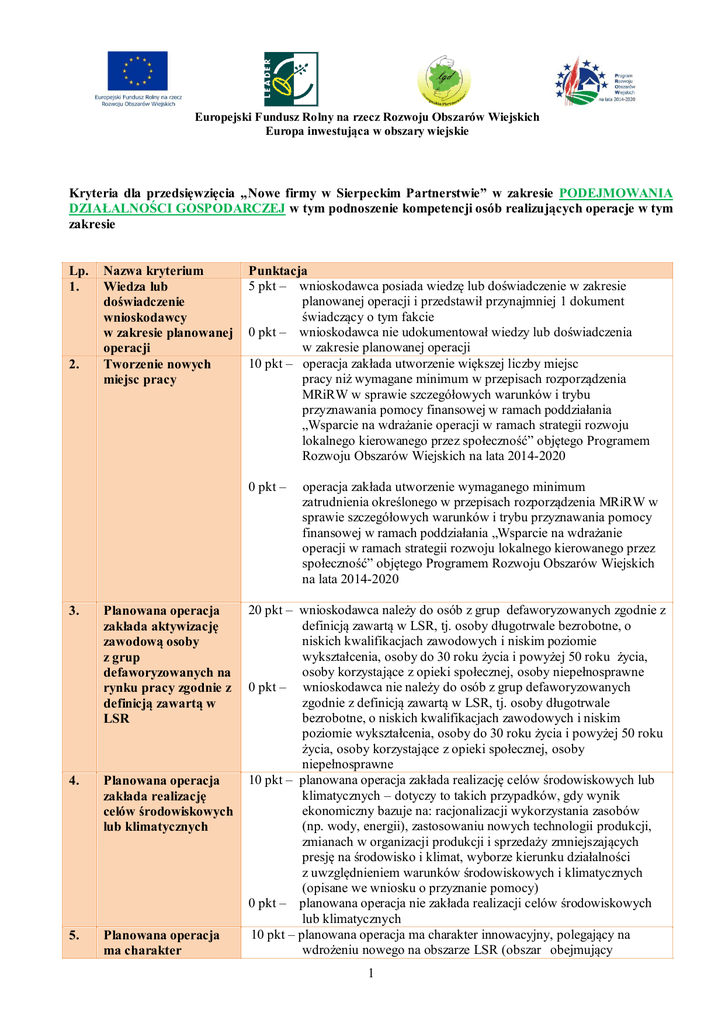 Europejski Fundusz Rolny na rzecz Rozwoju Obszarów Wiejskich Europa inwestująca w obszary wiejskie Kryteria dla przedsięwzięcia „Nowe firmy w Sierpeckim Partnerstwie” w zakresie PODEJMOWANIA DZIAŁALNOŚCI GOSPODARCZEJ w tym podnoszenie kompetencji osób realizujących operacje w tym zakresie Lp. 1. 2. Nazwa kryterium Wiedza lub doświadczenie wnioskodawcy w zakresie planowanej operacji Tworzenie nowych miejsc pracy Punktacja 5 pkt – wnioskodawca posiada wiedzę lub doświadczenie w zakresie planowanej operacji i przedstawił przynajmniej 1 dokument świadczący o tym fakcie 0 pkt – wnioskodawca nie udokumentował wiedzy lub doświadczenia w zakresie planowanej operacji 10 pkt – operacja zakłada utworzenie większej liczby miejsc pracy niż wymagane minimum w przepisach rozporządzenia MRiRW w sprawie szczegółowych warunków i trybu przyznawania pomocy finansowej w ramach poddziałania „Wsparcie na wdrażanie operacji w ramach strategii rozwoju lokalnego kierowanego przez społeczność” objętego Programem Rozwoju Obszarów Wiejskich na lata 2014-2020 0 pkt – 3. Planowana operacja zakłada aktywizację zawodową osoby z grup defaworyzowanych na rynku pracy zgodnie z definicją zawartą w LSR 4. Planowana operacja zakłada realizację celów środowiskowych lub klimatycznych 5. Planowana operacja ma charakter operacja zakłada utworzenie wymaganego minimum zatrudnienia określonego w przepisach rozporządzenia MRiRW w sprawie szczegółowych warunków i trybu przyznawania pomocy finansowej w ramach poddziałania „Wsparcie na wdrażanie operacji w ramach strategii rozwoju lokalnego kierowanego przez społeczność” objętego Programem Rozwoju Obszarów Wiejskich na lata 2014-2020 20 pkt – wnioskodawca należy do osób z grup defaworyzowanych zgodnie z definicją zawartą w LSR, tj. osoby długotrwale bezrobotne, o niskich kwalifikacjach zawodowych i niskim poziomie wykształcenia, osoby do 30 roku życia i powyżej 50 roku życia, osoby korzystające z opieki społecznej, osoby niepełnosprawne 0 pkt – wnioskodawca nie należy do osób z grup defaworyzowanych zgodnie z definicją zawartą w LSR, tj. osoby długotrwale bezrobotne, o niskich kwalifikacjach zawodowych i niskim poziomie wykształcenia, osoby do 30 roku życia i powyżej 50 roku życia, osoby korzystające z opieki społecznej, osoby niepełnosprawne 10 pkt – planowana operacja zakłada realizację celów środowiskowych lub klimatycznych – dotyczy to takich przypadków, gdy wynik ekonomiczny bazuje na: racjonalizacji wykorzystania zasobów (np. wody, energii), zastosowaniu nowych technologii produkcji, zmianach w organizacji produkcji i sprzedaży zmniejszających presję na środowisko i klimat, wyborze kierunku działalności z uwzględnieniem warunków środowiskowych i klimatycznych (opisane we wniosku o przyznanie pomocy) 0 pkt – planowana operacja nie zakłada realizacji celów środowiskowych lub klimatycznych 10 pkt – planowana operacja ma charakter innowacyjny, polegający na wdrożeniu nowego na obszarze LSR (obszar obejmujący 1 innowacyjny 6. Miejsce realizacji operacji 7. Operacja zakłada podnoszenie kompetencji osób podejmujących działalność lub zatrudnionych pracowników Konsultacja wniosku o dofinansowanie operacji z biurem LGD wszystkie gminy członkowskie LGD) lub znacząco udoskonalonego produktu, usługi, procesu, organizacji lub nowego sposobu wykorzystania lub zmobilizowania istniejących lokalnych zasobów przyrodniczych, historycznych, kulturowych czy społecznych 0 pkt – planowana operacja nie ma charakteru innowacyjnego 10 pkt – realizacja operacji na terenie gminy o poziomie udziału bezrobotnych zarejestrowanych w liczbie ludności w wieku produkcyjnym wyższym niż średnia na obszarze LSR (dane z GUS z 2 roku poprzedzającego rok złożenia wniosku) 0 pkt – realizacja operacji na terenie gminy o poziomie udziału bezrobotnych zarejestrowanych w liczbie ludności w wieku produkcyjnym równym lub niższym niż średnia na obszarze LSR (dane z GUS z 2 roku poprzedzającego rok złożenia wniosku podawane w ogłoszeniu LGD) Tak – 5 pkt Nie – 0 pkt Tak – 10 pkt – wniosek został skonsultowany w biurze LGD na minimum 5 dni roboczych przed końcem trwania naboru Nie – 0 pkt – na minimum 5 dni roboczych przed końcem trwania naboru, wniosek nie został skonsultowany w biurze LGD 9. Okres zamieszkiwania 10 pkt - wnioskodawca zamieszkuje na obszarze LSR przez co najmniej 3 miesiące przed złożeniem wniosku o przyznanie pomocy wnioskodawcy na 0 pkt - wnioskodawca nie zamieszkuje na obszarze LSR przez co najmniej obszarze LSR 3 miesiące przed złożeniem wniosku o przyznanie pomocy / informacja na podstawie zaświadczenia z właściwej ewidencji ludności o miejscu pobytu stałego lub czasowego Maksymalna liczba punktów: 90 pkt Minimalna liczba punktów: 55 pkt 8. 2