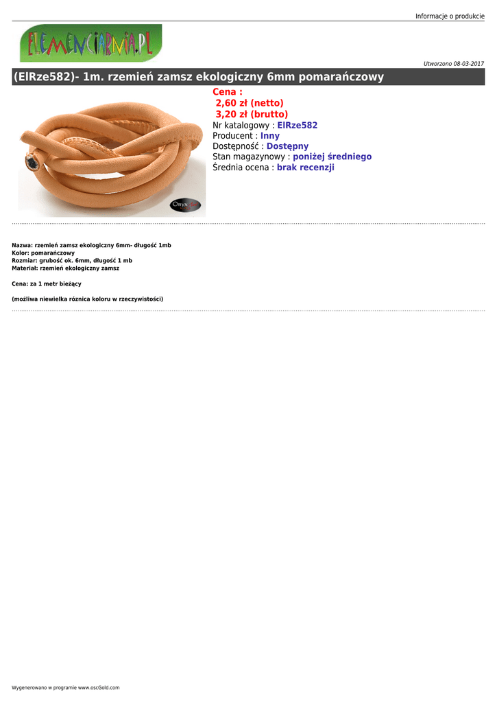 Informacje o produkcie Utworzono 08-03-2017 (ElRze582)- 1m. rzemień zamsz ekologiczny 6mm pomarańczowy Cena : 2,60 zł (netto) 3,20 zł (brutto) Nr katalogowy : ElRze582 Producent : Inny Dostępność : Dostępny Stan magazynowy : poniżej średniego Średnia ocena : brak recenzji Nazwa: rzemień zamsz ekologiczny 6mm- długość 1mb Kolor: pomarańczowy Rozmiar: grubość ok. 6mm, długość 1 mb Materiał: rzemień ekologiczny zamsz Cena: za 1 metr bieżący (możliwa niewielka róznica koloru w rzeczywistości) Wygenerowano w programie www.oscGold.com