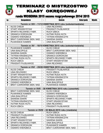 Lp Gospodarze 1 2 3 4 5 6 7 KŁOS CHEŁM START KRASNYSTAW SPARTA REJOWIEC FABR. GRANICA DOROHUSK OGNIWO WIERZBICA BRAT CUKROWNIK SIEN. NAD. PŁAWANICE KAMIEŃ 1 2 3 4 5 6 7 PŁAWANICE KAMIEŃ UNIA BIAŁOPOLE SAWENA SAWIN TATRAN KRAŚNICZYN HUTNIK RUDA HUTA RUCH IZBICA FRASSATI FAJSŁAWICE 1 2 3 4 5 6 7 KŁOS CHEŁM UNIA REJOWIEC START KRASNYSTAW SPARTA REJOWIEC FABR. GRANICA DOROHUSK OGNIWO WIERZBICA BRAT CUKROWNIK SIEN. NAD. 1 2 3 4 5 6 7 BRAT CUKROWNIK SIEN. NAD. PŁAWANICE KAMIEŃ UNIA BIAŁOPOLE SAWENA SAWIN TATRAN KRAŚNICZYN HUTNIK RUDA HUTA RUCH IZBICA 1 2 3 4 5 6 7 KŁOS CHEŁM FRASSATI FAJSŁAWICE UNIA REJOWIEC START KRASNYSTAW SPARTA REJOWIEC FABR. GRANICA DOROHUSK OGNIWO WIERZBICA - Goście Data/godz. Termin nr XIV – 11/12 KWIETNIA 2015 roku (sobota/niedziela) - UNIA REJOWIEC FRASSATI FAJSŁAWICE RUCH IZBICA HUTNIK RUDA HUTA TATRAN KRAŚNICZYN SAWENA SAWIN UNIA BIAŁOPOLE Termin nr XV - 18/19 KWIETNIA 2015 roku (sobota/niedziela) - KŁOS CHEŁM BRAT CUKROWNIK SIEN. NAD. OGNIWO WIERZBICA GRANICA DOROHUSK SPARTA REJOWIEC FABR. START KRASNYSTAW UNIA REJOWIEC Termin nr XVI - 25/26 KWIETNIA 2015 roku (sobota/niedziela) - FRASSATI FAJSŁAWICE RUCH IZBICA HUTNIK RUDA HUTA TATRAN KRAŚNICZYN SAWENA SAWIN UNIA BIAŁOPOLE PŁAWANICE KAMIEŃ Termin nr XVII - 30 KWIETNIA 2015 roku (czwartek) - KŁOS CHEŁM OGNIWO WIERZBICA GRANICA DOROHUSK SPARTA REJOWIEC FABR. START KRASNYSTAW UNIA REJOWIEC FRASSATI FAJSŁAWICE Termin nr XVIII - 03 MAJA 2015 roku (niedziela) - RUCH IZBICA HUTNIK RUDA HUTA TATRAN KRAŚNICZYN SAWENA SAWIN UNIA BIAŁOPOLE PŁAWANICE KAMIEŃ BRAT CUKROWNIK SIEN. NAD. Wynik: 1 2 3 4 5 6 7 Termin nr XIX 09/10 MAJA 2015 roku (sobota/niedziela) OGNIWO WIERZBICA KŁOS CHEŁM BRAT CUKROWNIK SIEN. NAD. GRANICA DOROHUSK PŁAWANICE KAMIEŃ SPARTA REJOWIEC FABR. UNIA BIAŁOPOLE START KRASNYSTAW SAWENA SAWIN UNIA REJOWIEC TATRAN KRAŚNICZYN FRASSATI FAJSŁAWICE HUTNIK RUDA HUTA RUCH IZBICA 1 2 3 4 5 6 7 Termin nr XX 16/17 MAJA 2015 roku (sobota/niedziela) KŁOS CHEŁM HUTNIK RUDA HUTA RUCH IZBICA TATRAN KRAŚNICZYN FRASSATI FAJSŁAWICE SAWENA SAWIN UNIA REJOWIEC UNIA BIAŁOPOLE START KRASNYSTAW PŁAWANICE KAMIEŃ SPARTA REJOWIEC FABR. BRAT CUKROWNIK SIEN. NAD. GRANICA DOROHUSK OGNIWO WIERZBICA 1 2 3 4 5 Termin nr XXI - 23/24 MAJA 2015 roku (sobota/niedziela) GRANICA DOROHUSK - KŁOS CHEŁM OGNIWO WIERZBICA - SPARTA REJOWIEC FABR. BRAT CUKROWNIK SIEN. NAD. - START KRASNYSTAW PŁAWANICE KAMIEŃ - UNIA REJOWIEC UNIA BIAŁOPOLE - FRASSATI FAJSŁAWICE 6 7 SAWENA SAWIN TATRAN KRAŚNICZYN 1 2 3 4 5 6 7 Termin nr XXII - 30/31 MAJA 2015 roku (sobota/niedziela) KŁOS CHEŁM - TATRAN KRAŚNICZYN HUTNIK RUDA HUTA - SAWENA SAWIN RUCH IZBICA - UNIA BIAŁOPOLE FRASSATI FAJSŁAWICE - PŁAWANICE KAMIEŃ UNIA REJOWIEC - BRAT CUKROWNIK SIEN. NAD START KRASNYSTAW - OGNIWO WIERZBICA SPARTA REJOWIEC FABR. - GRANICA DOROHUSK 1 2 3 4 5 6 7 Termin nr XXIII - 03 CZERWCA 2015 roku (środa) SPARTA REJOWIEC FABR. - KŁOS CHEŁM GRANICA DOROHUSK - START KRASNYSTAW OGNIWO WIERZBICA - UNIA REJOWIEC BRAT CUKROWNIK SIEN. NAD - FRASSATI FAJSŁAWICE PŁAWANICE KAMIEŃ - RUCH IZBICA UNIA BIAŁOPOLE - HUTNIK RUDA HUTA SAWENA SAWIN - TATRAN KRAŚNICZYN 1 2 3 4 5 6 7 Termin nr XXIV 06/07 CZERWCA 2015 roku (sobota/niedziela) KŁOS CHEŁM SAWENA SAWIN TATRAN KRAŚNICZYN UNIA BIAŁOPOLE HUTNIK RUDA HUTA PŁAWANICE KAMIEŃ RUCH IZBICA BRAT CUKROWNIK SIEN. NAD. FRASSATI FAJSŁAWICE OGNIWO WIERZBICA UNIA REJOWIEC GRANICA DOROHUSK START KRASNYSTAW SPARTA REJOWIEC FABR. - RUCH IZBICA HUTNIK RUDA HUTA 1 2 3 4 5 6 7 Termin nr XXV START KRASNYSTAW SPARTA REJOWIEC FABR. GRANICA DOROHUSK OGNIWO WIERZBICA BRAT CUKROWNIK SIEN. NAD. PŁAWANICE KAMIEŃ UNIA BIAŁOPOLE - 14 CZERWCA 2015 roku (niedziela) KŁOS CHEŁM UNIA REJOWIEC FRASSATI FAJSŁAWICE RUCH IZBICA HUTNIK RUDA HUTA TATRAN KRAŚNICZYN SAWENA SAWIN 1 2 3 4 5 6 7 Termin nr XXVI - 21 CZERWCA 2015 roku (niedziela) KŁOS CHEŁM UNIA BIAŁOPOLE SAWENA SAWIN PŁAWANICE KAMIEŃ TATRAN KRAŚNICZYN BRAT CUKROWNIK SIEN. NAD. HUTNIK RUDA HUTA OGNIWO WIERZBICA RUCH IZBICA GRANICA DOROHUSK FRASSATI FAJSŁAWICE SPARTA REJOWIEC FABR. UNIA REJOWIEC START KRASNYSTAW Uwagi do terminarza : 1. Na podstawie niniejszego terminarza – kluby pełniące rolę gospodarza zawodów zobowiązane są ustalić konkretne daty, godziny i miejsca rozpoczęcia zawodów w całej rundzie i przesłać na piśmie (listem poleconym, faksem lub e-mailem) – w terminie nie krótszym niż 14 dni przed rozpoczęciem rundy rozgrywkowej organowi prowadzącemu rozgrywki tj. ChOZPN. Otrzymane od klubów terminarze godzinowe ChOZPN uwzględni w terminarzach rozgrywek i opublikuje je na oficjalnej stronie Związku – www.chozpn.pl. Zmieszczone tam terminy rozgrywania meczów są wiążące dla obu zainteresowanych klubów. W przypadku, gdy gospodarz nie wyznaczy godzin rozegrania zawodów – zostaną one rozegrane w rundzie wiosennej w niedzielę zgodnie z terminarzem w następujących godzinach : juniorzy - godz. 14:00 seniorzy - godz. 16:15 2. W kolejkach rozgrywanych w środku tygodnia (XVII, XXIII kolejka) Wydział Gier ChOZPN ustala obligatoryjne godziny rozegrania zawodów – 15:00 - juniorzy i 17:15 – seniorzy 3. W rundzie wiosennej klub nie może wyznaczyć godziny rozegrania zawodów w niedziele nie później niż godzina 16:30. 4. Zmiana terminu zawodów w czasie krótszym niż 14 dni przed zawodami wymaga dodatkowych działań za strony klubu. Zmiana terminu w takim przypadku może być dokonana tylko na pisemną prośbę jednego z klubów, wniesioną do Wydziału Gier. Klub zwracający się o zmianę terminu, w czasie krótszym niż 14 dni przed zawodami wg ustalonego terminarza zobowiązany jest wskazać przyczynę zmiany oraz zaproponować nowy termin i godzinę rozegrania zawodów, a także uzyskać i przesłać zgodę drużyn przeciwnej na piśmie do Związku. Wystąpienie o zmianę terminu w czasie krótszym niż 14 dni przed zawodami bez zgody drużyny przeciwnej nie będzie rozpatrywane przez Wydział 