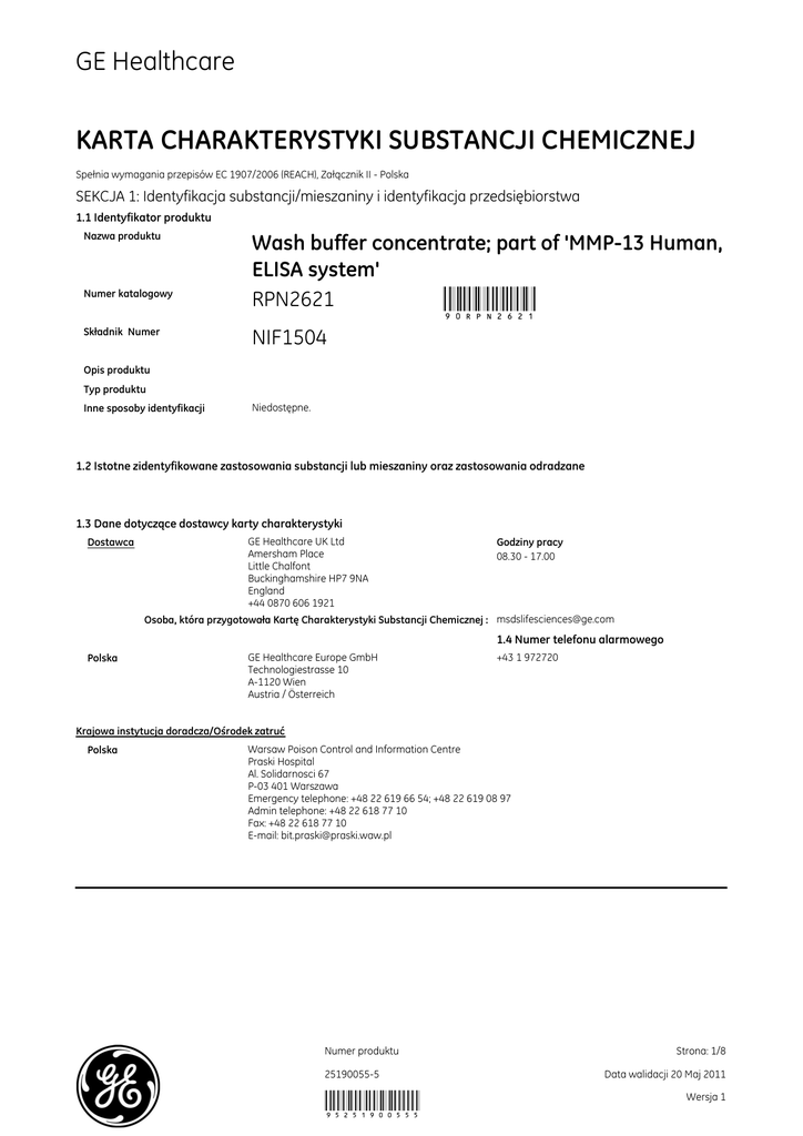 GE Healthcare KARTA CHARAKTERYSTYKI SUBSTANCJI CHEMICZNEJ Spełnia wymagania przepisów EC 1907/2006 (REACH), Załącznik II - Polska SEKCJA 1: Identyfikacja substancji/mieszaniny i identyfikacja przedsiębiorstwa 1.1 Identyfikator produktu Nazwa produktu Numer katalogowy Składnik Numer Wash buffer concentrate; part of 'MMP-13 Human, ELISA system' RPN2621 90RPN2621 NIF1504 Opis produktu Typ produktu Inne sposoby identyfikacji Niedostępne. 1.2 Istotne zidentyfikowane zastosowania substancji lub mieszaniny oraz zastosowania odradzane 1.3 Dane dotyczące dostawcy karty charakterystyki Dostawca GE Healthcare UK Ltd Amersham Place Little Chalfont Buckinghamshire HP7 9NA England +44 0870 606 1921 Godziny pracy 08.30 - 17.00 Osoba, która przygotowała Kartę Charakterystyki Substancji Chemicznej : [email protected] 1.4 Numer telefonu alarmowego Polska GE Healthcare Europe GmbH Technologiestrasse 10 A-1120 Wien Austria / Österreich +43 1 972720 Krajowa instytucja doradcza/Ośrodek zatruć Polska Warsaw Poison Control and Information Centre Praski Hospital Al. Solidarnosci 67 P-03 401 Warszawa Emergency telephone: +48 22 619 66 54; +48 22 619 08 97 Admin telephone: +48 22 618 77 10 Fax: +48 22 618 77 10 E-mail: [email protected] Numer produktu 25190055-5 95251900555 Strona: 1/8 Data walidacji 20 Maj 2011 Wersja 1 Spełnia wymagania przepisów EC 1907/2006 (REACH), Załącznik II - Polska Wash buffer concentrate; part of 'MMP-13 Human, ELISA system' RPN2621 SEKCJA 2: Identyfikacja zagrożeń 2.1 Klasyfikacja substancji lub mieszaniny Definicja produktu Pełny tekst powyższych zwrotów R lub uwag H podano w punkcie 16. Bardziej szczegółowe informacje dotyczące wpływu na stan zdrowia oraz ewentualnych objawów można znaleźć w rozdziale 11. 2.2 Elementy oznakowania Uzupełniające elementy etykiety Nie dotyczy. Specjalne wymagania dotyczące pakowania Nie dotyczy. Pojemniki powinny być wyposażone w zamknięcia uniemożliwiające otworzenie ich przez dzieci Dotykowe ostrzeżenia przed niebezpieczeństwem Nie dotyczy. 2.3 Inne zagrożenia Inne zagrożenia nie odzwierciedlone w klasyfikacji Niedostępne. SEKCJA 3: Skład/informacja o składnikach Substancja/Preparat SEKCJA 4: Środki pierwszej pomocy 4.1 Opis środków pierwszej pomocy Kontakt z okiem W przypadku kontaktu z oczami, bezzwłocznie przemyć dużą ilością wody. Zasięgnąć porady lekarskiej, jeśli pojawi się podrażnienie. Wdychanie Jeżeli wdychano substancję, wyjść na świeże powietrze. Jeśli pojawią się objawy, należy skorzystać z pomocy lekarskiej. Kontakt ze skórą Umyć mydłem i wodą. Jeśli pojawią się objawy, należy skorzystać z pomocy lekarskiej. Spożycie Nie spożywać. Jeśli pojawią się objawy, należy skorzystać z pomocy lekarskiej. Ochrona osób udzielających pierwszej pomocy Nie należy podejmować żadnych działań, które stwarzałyby ryzyko dla kogokolwiek chyba, że jest się odpowiednio przeszkolonym. 4.2 Najważniejsze ostre i opóźnione objawy oraz skutki narażenia Potencjalne ostre działanie na zdrowie Kontakt z okiem Brak doniesień o niepożądanych skutkach lub krytycznych zagrożeniach. Wdychanie Brak doniesień o niepożądanych skutkach lub krytycznych zagrożeniach. Kontakt ze skórą Brak doniesień o niepożądanych skutkach lub krytycznych zagrożeniach. Spożycie Brak doniesień o niepożądanych skutkach lub krytycznych zagrożeniach. Objawy wynikające z nadmiernej ekspozycji Kontakt z okiem Wdychanie Kontakt ze skórą Spożycie 4.3 Wskazania dotyczące wszelkiej natychmiastowej pomocy lekarskiej i szczególnego postępowania z poszkodowanym Informacje dla lekarza Szczególne sposoby leczenia Numer produktu 25190055-5 95251900555 Strona: 2/8 Data walidacji 20 Maj 2011 Wersja 1 Spełnia wymagania przepisów EC 1907/2006 (REACH), Załącznik II - Polska Wash buffer concentrate; part of 'MMP-13 Human, ELISA system' RPN2621 SEKCJA 5: Postępowanie w przypadku pożaru 5.1 Środki gaśnicze Stosowne środki gaśnicze Użyć środka gaśniczego, właściwego dla otaczającego ognia. Niewłaściwe środki gaśnicze Nie znane. 5.2 Szczególne zagrożenia związane z substancją lub mieszaniną Zagrożenia ze strony substancji lub mieszaniny Bez szczególnego niebezpieczeństwa. Niebezpieczne produkty spalania 5.3 Informacje dla straży pożarnej Szczególne środki zabezpieczające Niedostępne. dla straży pożarnej Specjalne wyposażenie ochronne dla strażaków Strażacy powinni nosić odpowiednie urządzenia ochronne oraz indywidualne aparaty oddechowe (SCBA) z maska zakrywającą całą twarz działająca przy dodatnim ciśnieniu. SEKCJA 6: Postępowanie w przypadku niezamierzonego uwolnienia do środowiska 6.1 Indywidualne środki ostrożności, wyposażenie ochronne i procedury w sytuacjach awaryjnych Dla personelu nie biorącego udziału w akcji ratowniczej Dla personelu biorącego udział w akcji ratowniczej 6.2 Środki ostrożności w zakresie Należy unikać rozprzestrzeniania się rozlanego materiału jego spływania do gleby lub kontaktu z glebą, ciekami wodnymi, drenami i kanalizacją. ochrony środowiska 6.3 Metody i materiały zapobiegające rozprzestrzenianiu się skażenia i służące do usuwania skażenia Małe rozlanie Duże rozlanie 6.4 Odniesienia do innych sekcji Jeżeli personel ratunkowy jest niedostępny, należy zebrać rozlany materiał. W przypadku niewielkiego rozlania należy dodać substancję absorbującą (przy braku odpowiedniej substancji można użyć ziemi), zebrać materiał i umieścić w szczelnym pojemniku, przeznaczonym do usunięcia. W razie wystąpienia dużych rozlań, należy otoczyć rozlany materiał wałem lub ograniczyć w inny sposób i nie dopuścić aby wyciek przedostał się do dróg wodnych. Umieścić rozlany materiał w odpowiednim pojemniku w celu likwidacji. Informacje dotyczące kontaktu w sytuacji awaryjnej podano w punkcie 1. Informacje dotyczące odpowiedniego sprzętu ochrony osobistej podano w punkcie