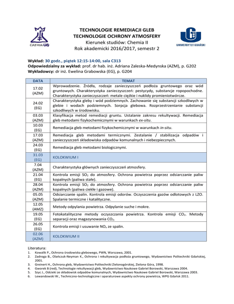 TECHNOLOGIE REMEDIACJI GLEB TECHNOLOGIE OCHRONY ATMOSFERY Kierunek studiów: Chemia II Rok akademicki 2016/2017, semestr 2 Wykład: 30 godz., piątek 12:15-14:00, sala C313 Odpowiedzialny za wykład: prof. dr hab. inż. Adriana Zaleska-Medynska (AZM), p. G202 Wykładowcy: dr inż. Ewelina Grabowska (EG), p. G204 DATA 17.02 (AZM) 24.02 (EG) 03.03 (AZM) 10.03 (EG) 17.03 (AZM) 24.03 (EG) 31.03 (EG) 7.04 (AZM) 21.04 (EG) 28.04 (AZM) 05.05 (AZM) 12.05 (AMZ) 19.05 (EG) 26.05 (EG) 02.06 (AZM) TEMAT Wprowadzenie. Źródła, rodzaje zanieczyszczeń podłoża gruntowego oraz wód gruntowych. Charakterystyka zanieczyszczeń: pestycydy, substancje ropopochodne. Charakterystyka zanieczyszczeń: metale ciężkie i nuklidy promieniotwórcze. Charakterystyka gleby i wód podziemnych. Zachowanie się substancji szkodliwych w glebie i wodach podziemnych. Sorpcja glebowa. Rozprzestrzenianie substancji szkodliwych w środowisku. Klasyfikacja metod remediacji gruntu. Ustalanie zakresu rekultywacji. Remediacja gleb metodami fizykochemicznymi w warunkach ex-situ. Remediacja gleb metodami fizykochemicznymi w warunkach in-situ. Remediacja gleb metodami termicznymi. Zestalanie / stabilizacja odpadów i zanieczyszczeń składowiska odpadów komunalnych i niebezpiecznych. Remediacja gleb metodami biologicznymi. KOLOKWIUM I Charakterystyka głównych zanieczyszczeń atmosfery. Kontrola emisji SO2 do atmosfery. Ochrona powietrza poprzez odsiarczanie paliw kopalnych (paliwa stałe). Kontrola emisji SO2 do atmosfery. Ochrona powietrza poprzez odsiarczanie paliw kopalnych (paliwa ciekłe i gazowe). Odsiarczanie spalin. Kontrola emisji odorów. Oczyszczenia gazów odlotowych z LZO. Spalanie termiczne i katalityczne. Metody odpylania powietrza. Odpylanie suche i mokre. Fotokatalityczne metody oczyszczania powietrza. Kontrola emisji CO2. Metody separacji oraz magazynowania CO2. Kontrola emisji i usuwanie NOx ze spalin. KOLOKWIUM II Literatura: 1. 2. 3. 4. 5. 6. Kowalik P., Ochrona środowiska glebowego, PWN, Warszawa, 2001. Zadroga B., Olańczuk-Neyman K., Ochrona i rekultywacja podłoża gruntowego, Wydawnictwo Politechniki Gdańskiej, 2001. Greinert H., Ochrona gleb, Wydawnictwo Politechniki Zielonogórskiej, Zielona Góra, 1998. Gworek B (red), Technologie rekultywacji gleb, Wydawnictwo Naukowe Gabriel Borowski, Warszawa 2004. Szyc J., Odcieki ze składowisk odpadów komunalnych, Wydawnictwo Naukowe Gabriel Borowski, Warszawa 2003. Lewandowski W., Techniczno-technologiczne i aparaturowe aspekty ochrony powietrza, WPG Gdańsk 2011.