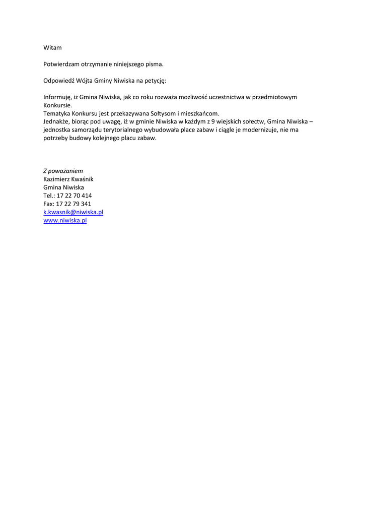 Witam Potwierdzam otrzymanie niniejszego pisma. Odpowiedź Wójta Gminy Niwiska na petycję: Informuję, iż Gmina Niwiska, jak co roku rozważa możliwość uczestnictwa w przedmiotowym Konkursie. Tematyka Konkursu jest przekazywana Sołtysom i mieszkańcom. Jednakże, biorąc pod uwagę, iż w gminie Niwiska w każdym z 9 wiejskich sołectw, Gmina Niwiska – jednostka samorządu terytorialnego wybudowała place zabaw i ciągle je modernizuje, nie ma potrzeby budowy kolejnego placu zabaw. Z poważaniem Kazimierz Kwaśnik Gmina Niwiska Tel.: 17 22 70 414 Fax: 17 22 79 341 [email protected] www.niwiska.pl