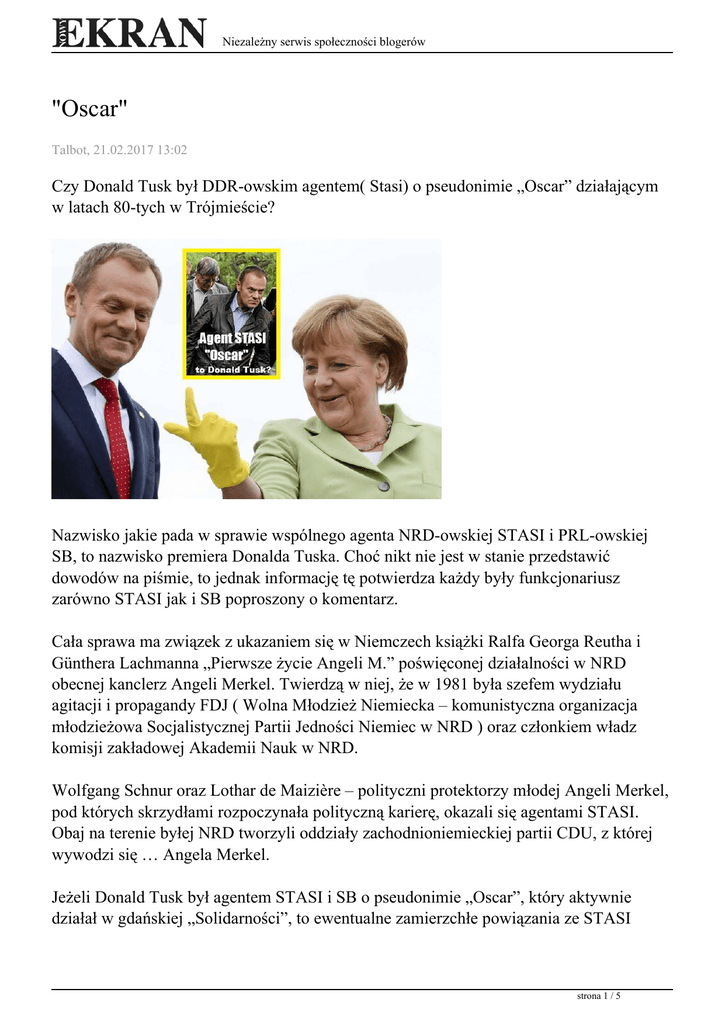 Niezależny serwis społeczności blogerów "Oscar" Talbot, 21.02.2017 13:02 Czy Donald Tusk był DDR-owskim agentem( Stasi) o pseudonimie „Oscar” działającym w latach 80-tych w Trójmieście? Nazwisko jakie pada w sprawie wspólnego agenta NRD-owskiej STASI i PRL-owskiej SB, to nazwisko premiera Donalda Tuska. Choć nikt nie jest w stanie przedstawić dowodów na piśmie, to jednak informację tę potwierdza każdy były funkcjonariusz zarówno STASI jak i SB poproszony o komentarz. Cała sprawa ma związek z ukazaniem się w Niemczech książki Ralfa Georga Reutha i Günthera Lachmanna „Pierwsze życie Angeli M.” poświęconej działalności w NRD obecnej kanclerz Angeli Merkel. Twierdzą w niej, że w 1981 była szefem wydziału agitacji i propagandy FDJ ( Wolna Młodzież Niemiecka – komunistyczna organizacja młodzieżowa Socjalistycznej Partii Jedności Niemiec w NRD ) oraz członkiem władz komisji zakładowej Akademii Nauk w NRD. Wolfgang Schnur oraz Lothar de Maizière – polityczni protektorzy młodej Angeli Merkel, pod których skrzydłami rozpoczynała polityczną karierę, okazali się agentami STASI. Obaj na terenie byłej NRD tworzyli oddziały zachodnioniemieckiej partii CDU, z której wywodzi się … Angela Merkel. Jeżeli Donald Tusk był agentem STASI i SB o pseudonimie „Oscar”, który aktywnie działał w gdańskiej „Solidarności”, to ewentualne zamierzchłe powiązania ze STASI strona 1 / 5 Niezależny serwis społeczności blogerów mogą rzucać zupełnie nowe światło na wzajemnie wsparcie i zażyłe stosunki w polityce międzynarodowej Donalda Tuska i Angeli Merkel. „Donald Tusk oznajmia „Henrykowi”, że wspólnie z dawnymi kolegami z Niezależnego Zrzeszenia Studentów chce podjąć niebezpieczną, ale dobrze płatną pracę, taką jak np. malowanie kominów. Z kolei w maju Tusk planuje wraz z żoną pojechać do Paryża, by odwiedzić redakcję „Kultury” Jerzego Giedroycia. Jedne i drugie plany udaje się zrealizować.” Autorzy Ralf Georg Reuth i Günther Lachmann .” w swojej książce „Pierwsze życie Angeli M.” zadają wiele pytań , które wymagają zastanowienia się. Jakże zasadne w świetle książki „ Pierwsze życie Angeli M.” wydają się słowa Jarosława Kaczyńskiego, że Angela Merkel została kanclerzem nieprzypadkowo. Agent STASI Oscar ciągle na posterunku Nieobecność „króla Europy” Donalda Tuska w Warszawie 10 kwietnia 2015 roku była nie tylko faktem haniebnym, ale także bardzo znamiennym. I stanowi kolejny dowód obciążający w procesie, który wytoczyła, na razie tylko Historia, człowiekowi, który oddał śledztwo smoleńskie w ręce sowieckich oprawców. W powszechnym dyskursie społecznym utarło się mówić, że milczenie oznacza zgodę. W tym wypadku, wielkie milczenie Donalda Tuska, który w sprawie 5. rocznicy, największej po II wojnie światowej, tragedii, która dotknęła Polskę, nie wydał jednego słowa oświadczenia z „dalekiej” Brukseli, nie pozostawia wiele wątpliwości, co do stanu i zawartości zakamarków duszy byłego premiera rządu III RP. W życiorysie politycznym Donalda Tuska, trudno znaleźć choćby jeden element, który wprost negowałby liczne domysły, że przed laty został zwerbowany przez wschodnio-niemiecką STASI i działał nad Wisłą pod pseudonimem Oscar. strona 2 / 5 Niezależny serwis społeczności blogerów Tylko pobieżny rzut oka na karierę polityczną Donalda Tuska każe powątpiewać w jego czyste, zgodne z polską racją stanu, intencje. Przykłady, takiego stanu rzeczy, są znane wszem i wobec: „nocna zmiana” rządu Olszewskiego, powołanie do życia Platformy Obywatelskiej, która, co dzisiaj widać jak na dłoni, z zimną krwią dokonuje demontażu Państwa Polskiego, wasalne stosunki z Angelą M. – kuriozalne ordery i europejskie apanaże, stocznie, Nord Stream, Smoleńsk i cały kontekst związany z zamachem i strach, wielki strach przed pułkownikiem Putinem. Od tego czasu kilka spraw uległo zmianie. Przede wszystkim Donald Tusk został powołany „przez Angelę Merkel”, bo chyba nikt nie ma, co do tego żadnych wątpliwości, na przewodniczącego Rady Europejskiej i czmychnął na sowicie opłacaną synekurę do Brukseli. I smoleńskie demony zostawił w kraju. Tylko, że od tych upiorów nie da się uciec. Wystarczy przeczytać relację Małgorzaty Wassermann zapisaną w książce „Zamach na prawdę” na temat kilku spotkań i rozmów rodzin smoleńskich z Tuskiem po 10 kwietnia 2010 roku. Przed naszymi oczami roztacza się obraz stronniczości, a właściwie służalczości, wobec Rosjan i himalaje kłamstwa suflowane cały czas Polakom pod cyniczna przykrywką zwykłej ludzkiej bezradności i zagubienia, która politykowi na tym stanowisku przecież nigdy nie przystoi. Dzisiaj natomiast widać, że już 10 kwietnia 2010 roku Donald Tusk prowadził rozgrywkę o przyszłe europejskie apanaże, żeby Putin i Merkel mogli powiedzieć: “Oto nasz człowiek w Brukseli”. Tajemnice STASI na temat Donalda Tuska muszą znać bezwzględnie dwie osoby: Angela Merkel i Władymir Putin. Oboje całkowicie przypadkowo. To oczywiście żart, bo wszyscy wiemy, nie tylko od Ralfa Georga Reutha i Günthera Lachmanna autorów książki pt. „Das erste leben der Angela M.” („Pierwsze życie Angeli M.”), że związki Angeli M. z FDJ, a więc i ze STASI nie były tylko incydentalne. O karierze kgb-owca Putina w NRD napisano, tu i ówdzie, też kilka słów. Donald Tusk, jak widać po latach, w tym niemiecko-rosyjskim tyglu czuł się właściwie jak ryba w wodzie. Angelę M. całował po rękach a z Władymirem Władymirowiczem wykonywał słynne żółwiki. W międzyczasie zaśmiewał się do rozpuku z kolegą Bronisławem K. czekając na smoleńskie trumny na lotnisku wojskowym w Warszawie. Kim był agent Oscar 10 kwietnia 2010 roku Jedni twierdzą, że zamachowcem (zob. celną analizę Łażącego Łazarza pt. „Gru