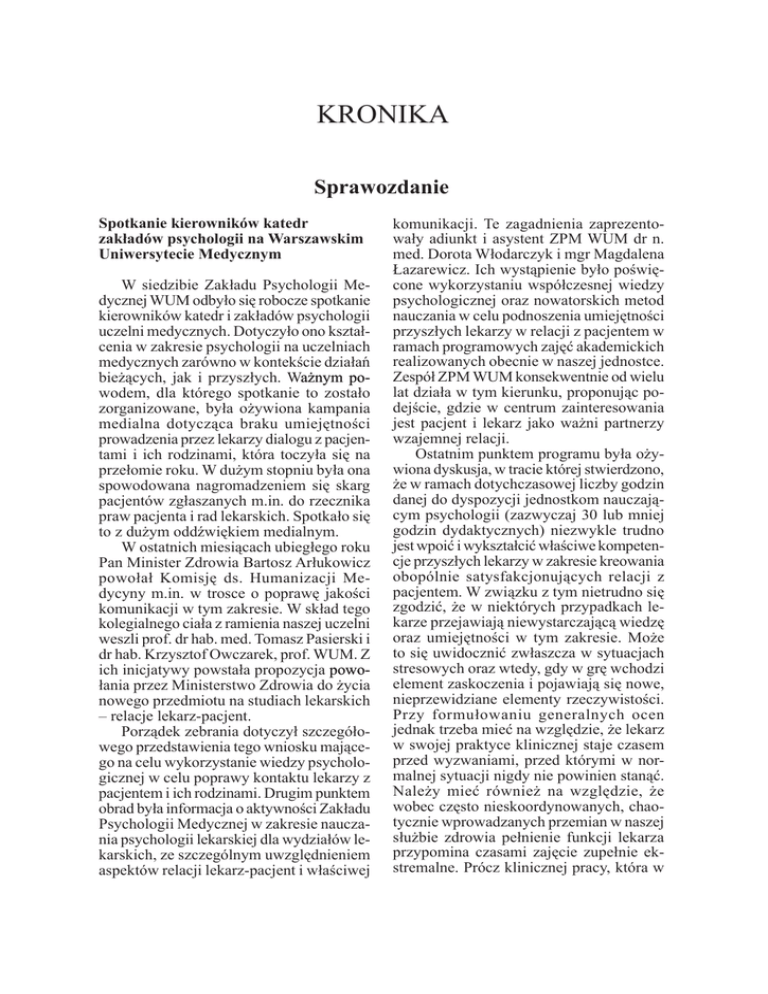 Kronika 1115 Kronika Sprawozdanie Spotkanie kierowników katedr zakładów psychologii na Warszawskim Uniwersytecie Medycznym W siedzibie Zakładu Psychologii Medycznej WUM odbyło się robocze spotkanie kierowników katedr i zakładów psychologii uczelni medycznych. Dotyczyło ono kształcenia w zakresie psychologii na uczelniach medycznych zarówno w kontekście działań bieżących, jak i przyszłych. W��������� ażnym powodem, dla którego spotkanie to zostało zorganizowane, była ożywiona kampania medialna dotycząca braku umiejętności prowadzenia przez lekarzy dialogu z pacjentami i ich rodzinami, która toczyła się na przełomie roku. W dużym stopniu była ona spowodowana nagromadzeniem się skarg pacjentów zgłaszanych m.in. do rzecznika praw pacjenta i rad lekarskich. Spotkało się to z dużym oddźwiękiem medialnym. W ostatnich miesiącach ubiegłego roku Pan Minister Zdrowia Bartosz Arłukowicz powołał Komisję ds. Humanizacji Medycyny m.in. w trosce o poprawę jakości komunikacji w tym zakresie. W skład tego kolegialnego ciała z ramienia naszej uczelni weszli prof. dr hab. med. Tomasz Pasierski i dr hab. Krzysztof Owczarek, prof. WUM. Z ich inicjatywy powstała propozycja ����� powołania przez Ministerstwo Zdrowia do życia nowego przedmiotu na studiach lekarskich – relacje lekarz-pacjent. Porządek zebrania dotyczył szczegółowego przedstawienia tego wniosku mającego na celu wykorzystanie wiedzy psychologicznej w celu poprawy kontaktu lekarzy z pacjentem i ich rodzinami. Drugim punktem obrad była informacja o aktywności Zakładu Psychologii Medycznej w zakresie nauczania psychologii lekarskiej dla wydziałów lekarskich, ze szczególnym uwzględnieniem aspektów relacji lekarz-pacjent i właściwej komunikacji. Te zagadnienia zaprezentowały adiunkt i asystent ZPM WUM dr n. med. Dorota Włodarczyk i mgr Magdalena Łazarewicz. Ich wystąpienie było poświęcone wykorzystaniu współczesnej wiedzy psychologicznej oraz nowatorskich metod nauczania w celu podnoszenia umiejętności przyszłych lekarzy w relacji z pacjentem w ramach programowych zajęć akademickich realizowanych obecnie w naszej jednostce. Zespół ZPM WUM konsekwentnie od wielu lat działa w tym kierunku, proponując podejście, gdzie w centrum zainteresowania jest pacjent i lekarz jako ważni partnerzy wzajemnej relacji. Ostatnim punktem programu była ożywiona dyskusja, w tracie której stwierdzono, że w ramach dotychczasowej liczby godzin danej do dyspozycji jednostkom nauczającym psychologii (zazwyczaj 30 lub mniej godzin dydaktycznych) niezwykle trudno jest wpoić i wykształcić właściwe kompetencje przyszłych lekarzy w zakresie kreowania obopólnie satysfakcjonujących relacji z pacjentem. W związku z tym nietrudno się zgodzić, że w niektórych przypadkach lekarze przejawiają niewystarczającą wiedzę oraz umiejętności w tym zakresie. Może to się uwidocznić zwłaszcza w sytuacjach stresowych oraz wtedy, gdy w grę wchodzi element zaskoczenia i pojawiają się nowe, nieprzewidziane elementy rzeczywistości. Przy formułowaniu generalnych ocen jednak trzeba mieć na względzie, że lekarz w swojej praktyce klinicznej staje czasem przed wyzwaniami, przed którymi w normalnej sytuacji nigdy nie powinien stanąć. Należy mieć również na względzie, że wobec często nieskoordynowanych, chaotycznie wprowadzanych przemian w naszej służbie zdrowia pełnienie funkcji lekarza przypomina czasami zajęcie zupełnie ekstremalne. Prócz klinicznej pracy, która w 1116 Kronika tym wszystkim wydaje się najłatwiejsza, biurokratyczna rzeczywistość często piętrzy przed lekarzami trudności i niespodzianki nie do zaakceptowania. Dużo prawdy zawiera opinia, że wszystko, co się robi, można robić lepiej, można się jeszcze bardziej starać. Należy jednak dać możliwość psychologom, w ramach prowadzonych zajęć na uniwersytetach i akademiach medycznych, nauczania umiejętności komunikowania się z pacjentem. W zakresie dotychczasowych możliwości robimy to, na co nam pozwalają bezwzględne i nieprzekraczalne ramy czasowe. Spoczywa na nas odpowiedzialność za przygotowanie przyszłych lekarzy do pracy, której niezwykle ważnym elementem jest komunikowanie się z pacjentem oraz z jego rodziną. Mając to na względzie, prof. T. Pasierski wraz z prof. K. Owczarkiem sformułowali propozycję – powołania do życia nowego przedmiotu relacje lekarzpacjent. W trakcie tego spotkania powołany został Zespół Roboczy ds. Nauczania Psychologii w Medycynie i wybrano prof. Krzysztofa Owczarka na jego przewodniczącego. Zespół zaproponował, aby przedmiot ten nazywał się psychologia relacji z pacjentem. Rekomendowany przez ww. Zespół Roboczy przedmiot powinien mieć następujący przebieg nauczania: – na III roku – przedmiot podstawy psychologii medycznej (co najmniej 30 godzin); – na V roku – psychologia relacji z pacjentem. Mamy nadzieję, że za pośrednictwem Ministerstwa Zdrowia uda się wdrożyć tę niezbędną inicjatywę do programu nauczania na studiach lekarskich i osiągnąć cel w postaci lepszego wykorzystania psychologów klinicznych i psychologów zdrowia w toku nauczania metod dotyczących kształtowania właściwych relacji lekarz-pacjent. Prof. Krzysztof Owczarek