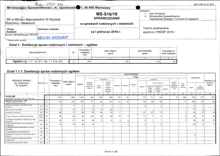 ĄcJm . - ¿~ ¡ 3 3 7 - 7-/96_______________ iM inisterstw o Spraw iedliw ości, Al. Ujazdows k i ^ 1 , 00-950 W arszaw a MS-S16R 07.07.2016 A Adresaci: 1. Sąd Okręgowy 2. Ministerstwo Sprawiedliwości Departam ent Strategii i Funduszy Europejskich M S -S 1 6 /1 8 SR w Mińsku M azowieckim R odzinny i Nieletnich SPR AW O ZD A NIE III W ydział w sprawach rodzinnych i nieletnich Okręg Apelacja Lubelska Siedlecki Numer identyfikacyjny REGON Termin przekazania: zgodnie z PBSSP 2016 r za I półrocze 2016 r. REGON 000324837 *’ Niepotrzebne skreślić. Dział 1. Ewidencja spraw rodzinnych i nieletnich - ogółem W yszczególnienie Lp Pozostało z ubiegłego roku W P ŁY N ĘŁO razem 1 2 0 O g ó łe m (d z . 1 .1 .1 w . 01 + dz. 1 .1 .2 Pozostało na okres następny 4 3 1.109 540 01 w . 01) ZAŁATW IO N O razem 521 1.128 D ział 1.1.1. Ewidencja spraw rodzinnych ogółem Z A Ł A T W IO N O z tego Odroczono umorzono orzeczono R O D ZA JE SPR AW wg re p e rto rió w P o z o s ta ło z Symbol Lp- lub w y k a z ó w (wiersze 02. 19, 46, 81, 82, 92, 94 do 95) S praw y procesow e - RC W PŁYNĘŁO ra z e m roku 0 OG ÓŁEM u b ie g łe g o 1 ra z e m 2 3 uwzględ niono W całości lub części liczba spraw 4 5 liczba małolet nich, których sprawa dotyczy oddalono 7 6 mediacji 10 11 12 13 14 1.008 1.033 548 389 583 62 34 113 41 44 15 59 35 18 212 257 141 94 131 31 001 03 7 11 11 8 7 7 1 Zaprzeczenie ojcostwa 002 04 9 18 21 19 18 22 1 Alimenty (orzeczenia) 003 05 66 77 98 39 34 52 11 003 z 003 o 06 38 48 64 i)33 30 38 14 003 w 07 32 37 42 25 5 12 4 18 19 20 16 1 1 1 006 08 O ustalenie bezskuteczności uznania ojcostwa 007 09 O rozwiązanie przysposobienia 008 10 021 11 • 077 12 080 13 O zaspokojenie potrzeb rodziny cofnięcie pozwu/ wniosku/ skargi 476 170 o pozbawienie tytułu wykonawczego wyko nalności o zwrot (zapłatę) wyegzekwowanego świadczenia 9 ogółem 01 02 O ustalenie wygaśnięcia obowiązku alim en tacyjnego O ustanowienie przez sąd rozdzielności majątkowej odrzuco no - Zmiana orzeczeń w zakresie alimentów zwrócono 8 Ustalenie ojcostwa i roszczenia z tym związane (razem wiersze 03 d o _ J 8 ^ _ zawarcia ugody przed sądem w wyniku braku przesłanek merytorycz nych w tym w wyniku 2 14 Inne zała twienia ogółem wlym publikację orzeczenia 15 16 17 18 262 530 137 451 11 202 57 125 15 4 7 2 15 5 6 41 27 11 7 64 17 45 4 11 7 2 2 52 14 22 9 2 1 1 2 29 14 27 1 3 24 3 17 1 2 3 Strona 1 z 32 Pozostało na okres na stępny MS-S16R 07.07.2016 Dział 1.1.fi Ewidencja spraw rodzinnych o g ó łe ^ [c .d .)______________________________ £ ____________________________ __________ ______ ZAŁATWIONO z tego RODZAJE*SPRAW wg repertoriów lub wykazów Symbol LP 0 081 14 0 zwolnienie zajętego przedmiotu spod egzekucji (art. 841 i 842 kpc) 020 15 0 ustalenie macierzyństwa 078 16 0 zaprzeczenie macierzyństwa 079 17 - 18 - 19 204 20 205 S praw y n iep ro cesow e - RNs (razem wiersze 20 do 22, 25 do 30,33, 41-45) Zezwolenie na zawarcie małżeństwa przez pełnomocnika Zwolnienie od obowiązku przedstawienia dokumentu potrzebnego do zawarcia małżeństwa WPŁYNĘŁO razem razem 3 2 1 0 roszczenie regresowe Inne bez symbolu i o symbolu wyżej niewymienionym Pozostało z ubiegłego roku Odroczono umorzono orzeczono uwzględ niono w całości lub części liczba spraw 4 5 liczba małolet nich, których sprawa dotyczy 6 zawarcia ugody przed sądem cofnięcie pozwu/ wniosku/ skargi mediacji w wyniku braku przesłanek merytorycz nych 11 12 13 14 w tym w wyniku oddalono zwrócono 8 7 odrzuco no 9 ogółem 10 Inne zała twienia ogółem w tym publikację orzeczenia 15 16 17 Pozostało na okres na stępny 18 1 1 88 148 150 106 21 2 3 3 3 16 4 20 12 4 84 21 86 7 2 2 - 22 9 30 26 26 6 13 210 23 8 27 25 25 4 10 210 z 24 1 3 1 1 2 3 Rozstrzygnięcie o istotnych sprawach rodziny (art. 24 k r. i op.) 211 25 Zastosowanie obowiązku poddania się leczeniu odwykowemu 228 26 30 39 34 a)28 5 5 5 4 1 razem (w. 23 + 24) Opieka nad osobą pełno letnią o ustanowienie opieki o zmianę opiekuna Zmiana orzeczenia o obowiązku leczenia odwykowego 228 z 27 2 Ustanie obowiązku leczenia odwykowego 228 w 28 1 Nakazanie wypłacenia wynagrodzenia za pracę do rąk drugiego małżonka albo innych należności przypadających jednemu małżon kowi (art. 28 §1 kr i op.) 230 29 Ustanowienie kurateli dla osoby częściowo ubezwłasnowol nionej - 30 3 231 31 1 o zmianę kuratora 231 z 32 razem (wiersze 34 do 40) osoby chorej psychicznie umiesz (art. 23 ustawy) czenie w osoby z zaburze szpitalu niami psychicznymi psychia (art 24 ustawy) trycznym osoby chorej bez psychicznie na zgody: wniosek (art. 29 ustawy) nakazanie wypisania ze szpitala psychiatrycznego umieszczenie w domu pomocy społecznej zmianę orzeczenia o przyjęciu do domu pomocy społecznej inne z ustawy o ochronie zdrowia psychicznego - 33 14 2 19 236 34 1 237 35 238 36 239 37 240 Spraw y z ustaw y o oc h ro n ie zdrow ia p s y c h ic z nego osó b p e łn o le t nich (RNs Psych.) razem (w. 31 ♦ 32) o ustanowienie kurateli 1 14 1 2 35 2 1 1 1 1 1 21 1 2 1 1 3 1 12 8 2 7 4 1 4 1 5 6 2 1 5 17 1 1 2 4 3 3 1 6 9 8 1 1 38 4 8 8 3 2 240z 39 3 1 3 1 2 2 241 40 1 1 1 1 Strona 2 z 32 2 8 1 _ MS-S16R 07.07.2016 • • Dział 1.1.1. Ewidencja spraw rodzinnych ogółem (c.d.)____________________________________________________________________________ _______ ZAŁATWIONO z tego RODZAJE SPRAW wg repertoriów lub wykazów 0 0 ustanowienie kurateli dla osoby nieobecnej Symbo LP Pozostało z WPŁYNĘŁO ubiegłego razem roku 1 209n 41 0 ustanowienie kurateli dla osoby niepełno- 209u 42 0 zezwolenie na dokonanie czynności przekraczającej zakres zwykłego zarządu majątkiem ubezwłasnowolnionego 253 43 Złożenie do depozytu sądowego 216 44 Inne bez symbolu i o symbolu wyżej niewyjT T ie n io n ^rr^_ Razem - Nsm (wiersze 47 do 52, 55 do 65, 73 do 79) 2 umorzono orzeczono razem 3 uwzględ niono w całości lub części liczba spraw liczba małolet nich, których sprawa