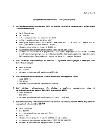 Załącznik nr 1 Opis przedmiotu zamówienia - rodzaj i wymagania 1. Olej silnikowy wielosezonowy typu SHPD do silników z zapłonem samoczynnym, wolnossących i turbodoładowanych ilość: 9.000 litrów SAE 15W40 API – klasa jakościowa nie niższa niż CH-4 / SL ACEA – klasa jakościowa nie niższa niż E7 wymagane dopuszczenia: MAN 3275-1, MB-APPROVAL 228.3, MTU DDC TYP-2, VOLVO VDS-2, CUMMINS 20076/7, RENAULT RD/RD2, okres wymiany oleju: nie mniej niż 40.000 km mieszalność oferowanego oleju z olejem TITAN TRUCK SAE 15W40 dostawa w opakowaniach o pojemności 1.000 litrów; dopuszczone opakowanie zwrotne z zastrzeżeniem, iż przy pierwszej dostawie produkt należy dostarczyć wraz z opakowaniem, które pozostanie u Zamawiającego i będzie zwrócone przy kolejnej dostawie 2. Olej silnikowy wielosezonowy do silników z zapłonem samoczynnym i iskrowym oraz turbodoładowanych ilość: 10 litrów SAE 50W40 dostawa w opakowaniach o pojemności 5 litrów 3. Olej silnikowy wielosezonowy do silników z zapłonem iskrowym SAE 5W40 ilość: 10 litrów SAE 5W40 dostawa w opakowaniach o pojemności 5 litrów 4. Olej silnikowy wielosezonowy do silników z zapłonem turbodoładowanych o lepkości SAE 5W30 (norma MAN 3377) ilość: 420 litrów SAE 5W30 dostawa w opakowaniach o pojemności od 200 do 210 litrów samoczynnym Euro 6, 5. Olej przekładniowy wielosezonowy wysokiej jakości zawierający dodatki MoS2 do przekładni manualnych o lepkości SAE 80W90 ilość: 615 litrów SAE 80W90 API – klasa jakościowa nie niższa niż GL-4 MIL-L-2105 D okres wymiany oleju: nie mniej niż 180.000 km lub co 3 lata mieszalność oferowanego oleju z olejem TITAN RENEP 8090 MC dostawa w opakowaniach o pojemności 205 litrów 6. Olej przekładniowy mineralny wielosezonowy do przekładni hydraulicznych i automatycznych skrzyń przekładniowych ilość: 2255 litrów wymagane dopuszczenia: MAN 339 V-1/ Z-1, MB-APPROVAL 236.1, wymagane dopuszczenia: ZF TE-ML 02F / 03D / 04/D / 14A / 17C – okres wymiany oleju nie mniej niż 30.000 km VOITH 55.6335.3X (G607) – okres wymiany oleju nie mniej niż 60.000 km mieszalność oferowanego oleju z olejem TITAN ATF 3000 dostawa w opakowaniach o pojemności 205 litrów 7. Wielofunkcyjny olej przekładniowy do przekładni samochodów ciężarowych i osobowych ilość: 40 litrów API – klasa jakościowa nie niższa niż GL-4 wymagane dopuszczenia: MAN 341 TYP E1/Z1, MB-APPROVAL 235.1,ZF TE-ML 02A / 17A okres wymiany oleju nie mniej niż 90.000 km mieszalność oferowanego oleju z olejem TITAN GEAR MP dostawa w opakowaniach o pojemności 20 litrów 8. Olej przekładniowy syntetyczny wielosezonowy do przekładni hydraulicznych i automatycznych skrzyń przekładniowych ilość: 205 litrów wymagane dopuszczenia: MB-APPROVAL 236.8, MAN 339 TYP V2 / Z2, VOITH 55.6336.3X (G1363), ZF TE-ML 04D / 09X / 14B / 16L mieszalność oferowanego oleju z olejem TITAN ATF 5000 dostawa w opakowaniu o pojemności 205 litrów 9. Olej sprężarkowy do stacjonarnych i przewoźnych sprężarek tłokowych i śrubowych ilość: 60 litrów DIN 51519 ISO VG 46 dostawa w opakowaniach o pojemności 20 litrów 10. Smar plastyczny – smar litowy do podwozi samochodowych, części wysokoobciążonych termicznie oraz mechanicznie ilość: 360 kg konsystencja klasy NLGI 2 środek zagęszczający – mydło litowe zakres temperatur pracy –20 oC do +130 oC dostawa w opakowaniach o pojemności 180 kg 11. Smar plastyczny do podwozi samochodowych do centralnych układów smarowania do wolnoporuszających elementów ślizgowych ilość: 35 kg konsystencja klasy NLGI 00/000 wymagane dopuszczenia: MAN 283 Li-P 00/000, MB-APPROVAL 264.0 środek zagęszczający – mydło litowo-wapniowe zakres temperatur pracy: -40 oC do + 110 oC dostawa w opakowaniach o pojemności 5 kg 12. Smar litowy do centralnego układu smarowania odporny na wodę ilość: 35 kg wymagane dopuszczenia: MB zgodnie z kartą 267 środek zagęszczający – mydło litowe zakres temperatur prac: -40 oC do + 120 oC dostawa w opakowaniach o pojemności 5 kg 13. Smar plastyczny litowy do układów pneumatycznych, do smarowania długookresowego odporny na wodę ilość: 10 kg konsystencja klasy NLGI 2 środek zagęszczający – mydło litowe zakres temperatur pracy: dolny (przy rozruchu) –40 oC wg DIN 51806 górny (temp. ciągła) + 140 oC wg DIN 51806 zdolność ochrony antykorozyjnej wobec stali oddziaływanie korozyjne na miedź- 1-1000 stopni korozji wg DIN 51811 dostawa w opakowaniach o pojemności 5 kg