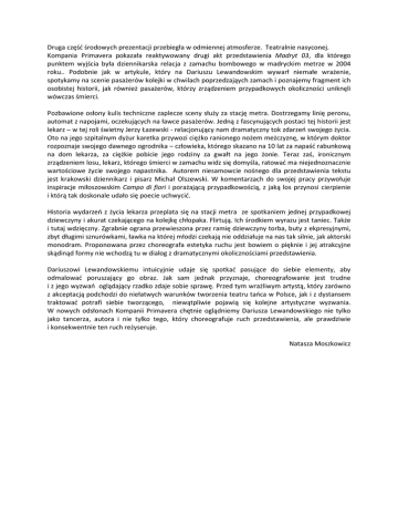 Druga część środowych prezentacji przebiegła w odmiennej atmosferze. Teatralnie nasyconej. Kompania Primavera pokazała reaktywowany drugi akt przedstawienia Madryt 03, dla którego punktem wyjścia była dziennikarska relacja z zamachu bombowego w madryckim metrze w 2004 roku.. Podobnie jak w artykule, który na Dariuszu Lewandowskim wywarł niemałe wrażenie, spotykamy na scenie pasażerów kolejki w chwilach poprzedzająych zamach i poznajemy fragment ich osobistej historii, jak również pasażerów, którzy zrządzeniem przypadkowych okoliczności uniknęli wówczas śmierci. Pozbawione osłony kulis techniczne zaplecze sceny służy za stację metra. Dostrzegamy linię peronu, automat z napojami, oczekujących na ławce pasażerów. Jedną z fascynujących postaci tej historii jest lekarz – w tej roli świetny Jerzy Łazewski - relacjonujący nam dramatyczny tok zdarzeń swojego życia. Oto na jego szpitalnym dyżur karetka przywozi ciężko ranionego nożem meżczyznę, w którym doktor rozpoznaje swojego dawnego ogrodnika – człowieka, którego skazano na 10 lat za napaść rabunkową na dom lekarza, za ciężkie pobicie jego rodziny za gwałt na jego żonie. Teraz zaś, ironicznym zrządzeniem losu, lekarz, którego śmierci w zamachu widz się domyśla, ratować ma niejednoznacznie wartościowe życie swojego napastnika. Autorem niesamowcie nośnego dla przedstawienia tekstu jest krakowski dziennikarz i pisarz Michał Olszewski. W komentarzach do swojej pracy przywołuje inspiracje miłoszowskim Campo di fiori i porażającą przypadkowością, z jaką los przynosi cierpienie i którą tak doskonale udało się poecie uchwycić. Historia wydarzeń z życia lekarza przeplata się na stacji metra ze spotkaniem jednej przypadkowej dziewczyny i akurat czekającego na kolejkę chłopaka. Flirtują. Ich środkiem wyrazu jest taniec. Także i tutaj wdzięczny. Zgrabnie ograna przewieszona przez ramię dziewczyny torba, buty z ekpresyjnymi, zbyt długimi sznurówkami, ławka na której młodzi czekają nie oddziałuje na nas tak silnie, jak aktorski monodram. Proponowana przez choreografa estetyka ruchu jest bowiem o pięknie i jej atrakcyjne skądinąd formy nie wchodzą tu w dialog z dramatycznymi okolicznościami przedstawienia. Dariuszowi Lewandowskiemu intuicyjnie udaje się spotkać pasujące do siebie elementy, aby odmalować poruszający go obraz. Jak sam jednak przyznaje, choreografowanie jest trudne i z jego wyzwań oglądający rzadko zdaje sobie sprawę. Przed tym wrażliwym artystą, który zarówno z akceptacją podchodzi do niełatwych warunków tworzenia teatru tańca w Polsce, jak i z dystansem traktować potrafi siebie tworzącego, niewątpliwie pojawią się kolejne artystyczne wyzwania. W nowych odsłonach Kompanii Primavera chętnie oglądniemy Dariusza Lewandowskiego nie tylko jako tancerza, autora i nie tylko tego, który choreografuje ruch przedstawienia, ale prawdziwie i konsekwentnie ten ruch reżyseruje. Natasza Moszkowicz