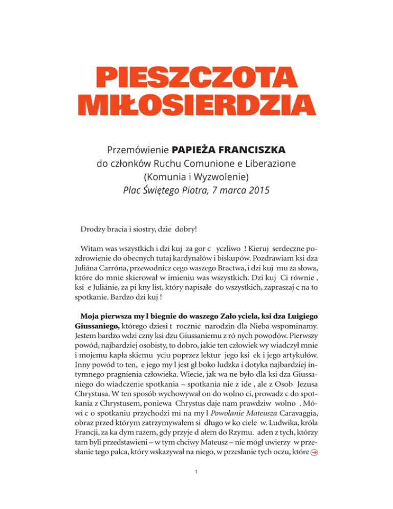 PIESZCZOTA MIŁOSIERDZIA Przemówienie PAPIEŻA FRANCISZKA do członków Ruchu Comunione e Liberazione (Komunia i Wyzwolenie) Plac Świętego Piotra, 7 marca 2015 Drodzy bracia i siostry, dzie dobry! Witam was wszystkich i dzi kuj za gor c yczliwo ! Kieruj serdeczne pozdrowienie do obecnych tutaj kardynałów i biskupów. Pozdrawiam ksi dza Juliána Carróna, przewodnicz cego waszego Bractwa, i dzi kuj mu za słowa, które do mnie skierował w imieniu was wszystkich. Dzi kuj Ci równie , ksi e Juliánie, za pi kny list, który napisałe do wszystkich, zapraszaj c na to spotkanie. Bardzo dzi kuj ! Moja pierwsza my l biegnie do waszego Zało yciela, ksi dza Luigiego Giussaniego, którego dziesi t rocznic narodzin dla Nieba wspominamy. Jestem bardzo wdzi czny ksi dzu Giussaniemu z ró nych powodów. Pierwszy powód, najbardziej osobisty, to dobro, jakie ten człowiek wy wiadczył mnie i mojemu kapła skiemu yciu poprzez lektur jego ksi ek i jego artykułów. Inny powód to ten, e jego my l jest gł boko ludzka i dotyka najbardziej intymnego pragnienia człowieka. Wiecie, jak wa ne było dla ksi dza Giussaniego do wiadczenie spotkania – spotkania nie z ide , ale z Osob Jezusa Chrystusa. W ten sposób wychowywał on do wolno ci, prowadz c do spotkania z Chrystusem, poniewa Chrystus daje nam prawdziw wolno . Mówi c o spotkaniu przychodzi mi na my l Powołanie Mateusza Caravaggia, obraz przed którym zatrzymywałem si długo w ko ciele w. Ludwika, króla Francji, za ka dym razem, gdy przyje d ałem do Rzymu. aden z tych, którzy tam byli przedstawieni – w tym chciwy Mateusz – nie mógł uwierzy w przesłanie tego palca, który wskazywał na niego, w przesłanie tych oczu, które 1 PIESZCZOTA MIŁOSIERDZIA patrzyły na niego z miłosierdziem i wzywały do pój cia za. Odczuwa zdumienie spotkania. Takie jest spotkanie z Chrystusem, który przychodzi i zaprasza nas. Wszystko w naszym yciu – dzi tak samo jak w czasach Jezusa – zaczyna si od spotkania. Spotkanie z tym Człowiekiem, cie l z Nazaretu, człowiekiem jak wszyscy, a jednocze nie tak innym. Pomy lmy o Ewangelii w. Jana, gdzie opowiada on o pierwszym spotkaniu uczniów z Jezusem (por. 1, 35-42). Andrzej, Jan, Szymon czuli, e On patrzy na nich a do gł bi, czuli si wewn trznie poznani i to budziło w nich zaskoczenie, zdumienie, tak e natychmiast poczuli si z Nim zwi zani… Albo kiedy po zmartwychwstaniu Jezus pyta Piotra: „Czy miłujesz mnie?” (J 21, 15), a Piotr odpowiada: „Tak”; to „tak” nie wynikało z siły woli, nie wynikało tylko z decyzji człowieka – Szymona; wynikało najpierw i przedtem z Łaski: było owym primerear, uprzedzaj cym działaniem Łaski. To było decyduj ce odkrycie dla wi tego Pawła, wi tego Augustyna i wielu innych wi tych: Jezus Chrystus zawsze jest pierwszy, uprzedza nas, czeka na nas, Jezus Chrystus jest zawsze przed nami; i kiedy my przybywamy, On ju na nas czeka. On jest jak kwiat drzewa migdałowego –rozkwita jako pierwszy i zapowiada wiosn . I nie mo na zrozumie tej dynamiki spotkania, która budzi zdumienie i prowadzi do przylgni cia, bez miłosierdzia. Tylko ten, kto został przytulony przez czuło miłosierdzia, tak naprawd zna Pana. Uprzywilejowanym miejscem spotkania jest pieszczota miłosierdzia Jezusa Chrystusa wobec mojego grzechu. I dlatego, wielokrotnie, słyszeli cie ode mnie, e uprzywilejowanym miejscem spotkania z Chrystusem jest mój grzech. To dzi ki temu u ciskowi miłosierdzia przychodzi pragnienie odpowiedzi i przemiany, i mo e równie wytrysn inne ycie. Moralno chrze cija ska nie jest tytanicznym, woluntarystycznym wysiłkiem kogo , kto decyduje si by spójny i udaje mu si to, nie jest jakim rodzajem samotnego stawiania czoła wiatu. Nie. To nie jest moralno chrze cija ska, to co innego. Moralno chrze cija ska jest odpowiedzi , odpowiedzi pełn wzruszenia wobec zaskakuj cego, nieprzewidywalnego, czy wr cz „niesprawiedliwego” według ludzkich kryteriów miłosierdzia Kogo , kto mnie zna, zna moje zdrady i pomimo tego kocha mnie tak samo, szanuje, przytula, wzywa mnie na nowo, pokłada we mnie nadziej , czego ode mnie oczekuje. Moralno chrze cija ska polega nie na tym, aby nigdy nie upa , ale na tym, aby ci gle powstawa dzi ki Jego dłoni, która nas podnosi. I droga Ko cioła jest tak e taka: pozwoli , aby ob- 2 PIESZCZOTA MIŁOSIERDZIA jawiło si wielkie miłosierdzie Boga. Mówiłem w ostatnich dniach do nowych kardynałów: „Droga Ko cioła polega na tym, aby nikogo nie pot pia na wieczno ; aby rozlewa miłosierdzie Bo e na wszystkie osoby, które o nie prosz szczerym sercem; droga Ko cioła jest drog wyj cia zza swojego ogrodzenia, aby poszukiwa zagubionych na «peryferiach» ycia; to droga całociowego przyjmowania Bo ej logiki (Homilia, 15 lutego 2015 r.). Tak e Ko ciół musi odczuwa radosny impuls, by stawa si kwiatem drzewa migdałowego, to znaczy wiosn jak Jezus, dla całej ludzko ci. Dzisiaj wspominacie tak e sze dziesi ciolecie pocz tków waszego Ruchu „zrodzonego w Ko ciele – jak mówił do was Benedykt XVI – nie z woli organizacyjnej hierarchii, lecz bior cego pocz tek z odnowionego spotkania z Chrystusem, a zatem mo emy powiedzie , z impulsu pochodz cego ostatecznie od Ducha wi tego” (Przemówienie do pielgrzymów wspólnoty Comunione e Liberazione, 24 marca 2007 r.: Insegnamenti III, 1 [2007], 557). Po sze dziesi ciu latach charyzmat zało ycielski nie zatracił swojej wie o ci i ywotno ci. Ale pami tajcie, e centrum nie stanowi charyzmat, centrum jest tylko jedno: Jezus, Jezus Chrystus! Kiedy w centrum stawiam moj metod duchow , moj drog duchowo ci, mój sposób wcielania jej w ycie, wówczas zbaczam z drogi. Cała duchowo , wszystkie charyzmaty w Ko ciele winny by „zdecentralizowane”. W centrum jest tylko Pan! Dlatego gdy wi ty Paweł w Pierwszym Li cie do Koryntian mówi o charyzmatach, o tej niezwykle pi knej rzeczywisto ci w Ko ciele, w Ciele Mistycznym, ko czy, mówi c o miło ci, czyli o czym , co pochodzi od Boga, a wł