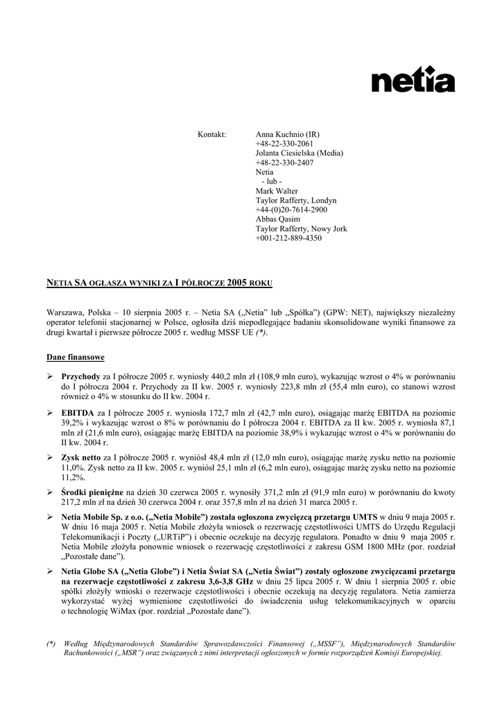 Kontakt: Anna Kuchnio (IR) +48-22-330-2061 Jolanta Ciesielska (Media) +48-22-330-2407 Netia - lub Mark Walter Taylor Rafferty, Londyn +44-(0)20-7614-2900 Abbas Qasim Taylor Rafferty, Nowy Jork +001-212-889-4350 NETIA SA OGŁASZA WYNIKI ZA I PÓŁROCZE 2005 ROKU Warszawa, Polska – 10 sierpnia 2005 r. – Netia SA („Netia” lub „Spółka”) (GPW: NET), największy niezależny operator telefonii stacjonarnej w Polsce, ogłosiła dziś niepodlegające badaniu skonsolidowane wyniki finansowe za drugi kwartał i pierwsze półrocze 2005 r. według MSSF UE (*). Dane finansowe Przychody za I półrocze 2005 r. wyniosły 440,2 mln zł (108,9 mln euro), wykazując wzrost o 4% w porównaniu do I półrocza 2004 r. Przychody za II kw. 2005 r. wyniosły 223,8 mln zł (55,4 mln euro), co stanowi wzrost również o 4% w stosunku do II kw. 2004 r. EBITDA za I półrocze 2005 r. wyniosła 172,7 mln zł (42,7 mln euro), osiągając marżę EBITDA na poziomie 39,2% i wykazując wzrost o 8% w porównaniu do I półrocza 2004 r. EBITDA za II kw. 2005 r. wyniosła 87,1 mln zł (21,6 mln euro), osiągając marżę EBITDA na poziomie 38,9% i wykazując wzrost o 4% w porównaniu do II kw. 2004 r. Zysk netto za I półrocze 2005 r. wyniósł 48,4 mln zł (12,0 mln euro), osiągając marżę zysku netto na poziomie 11,0%. Zysk netto za II kw. 2005 r. wyniósł 25,1 mln zł (6,2 mln euro), osiągając marżę zysku netto na poziomie 11,2%. Środki pieniężne na dzień 30 czerwca 2005 r. wynosiły 371,2 mln zł (91,9 mln euro) w porównaniu do kwoty 217,2 mln zł na dzień 30 czerwca 2004 r. oraz 357,8 mln zł na dzień 31 marca 2005 r. Netia Mobile Sp. z o.o. („Netia Mobile”) została ogłoszona zwycięzcą przetargu UMTS w dniu 9 maja 2005 r. W dniu 16 maja 2005 r. Netia Mobile złożyła wniosek o rezerwację częstotliwości UMTS do Urzędu Regulacji Telekomunikacji i Poczty („URTiP”) i obecnie oczekuje na decyzję regulatora. Ponadto w dniu 9 maja 2005 r. Netia Mobile złożyła ponownie wniosek o rezerwację częstotliwości z zakresu GSM 1800 MHz (por. rozdział „Pozostałe dane”). Netia Globe SA („Netia Globe”) i Netia Świat SA („Netia Świat”) zostały ogłoszone zwycięzcami przetargu na rezerwacje częstotliwości z zakresu 3,6-3,8 GHz w dniu 25 lipca 2005 r. W dniu 1 sierpnia 2005 r. obie spółki złożyły wnioski o rezerwacje częstotliwości i obecnie oczekują na decyzję regulatora. Netia zamierza wykorzystać wyżej wymienione częstotliwości do świadczenia usług telekomunikacyjnych w oparciu o technologię WiMax (por. rozdział „Pozostałe dane”). (*) Według Międzynarodowych Standardów Sprawozdawczości Finansowej („MSSF”), Międzynarodowych Standardów Rachunkowości („MSR”) oraz związanych z nimi interpretacji ogłoszonych w formie rozporządzeń Komisji Europejskiej. -2Dane operacyjne Przychody ze sprzedaży produktów telekomunikacyjnych innych niż tradycyjne, bezpośrednie usługi głosowe (takich jak pośrednie usługi głosowe, transmisja danych, rozliczenia międzyoperatorskie, usługi hurtowe, usługi sieci inteligentnej i pozostałe usługi telekomunikacyjne) zwiększyły swój udział w przychodach z działalności telekomunikacyjnej w II kw. 2005 r. do 44%, osiągając wartość 96,3 mln zł (23,8 mln euro), z poziomu 35% w II kw. 2004 r. Równocześnie udział przychodów ze sprzedaży powyższych produktów w przychodach z działalności telekomunikacyjnej wzrósł w I półroczu 2005 r. do poziomu 42% osiągając wartość 180,8 mln zł (44,7 mln USD), z poziomu 34% w I półroczu 2004 r. Przychody od klientów biznesowych stanowiły odpowiednio 74% i 73% przychodów z działalności telekomunikacyjnej w II kw. 2005 r. i I półroczu 2005 r. Liczba linii dzwoniących (po uwzględnieniu rezygnacji i odłączeń abonentów) wyniosła 423.678 na dzień 30 czerwca 2005 r. w porównaniu do 426.606 linii dzwoniących na dzień 30 czerwca 2004 r. oraz 424.585 na dzień 31 marca 2005 r. Liczba linii biznesowych wyniosła 149.093, wykazując wzrost o 4% w porównaniu do II kw. 2004 r. Udział linii biznesowych w stosunku do wszystkich linii dzwoniących wyniósł 35,2%. Liczba aktywnych portów ADSL wzrosła do 31.470 na dzień 30 czerwca 2005 r., osiągając 7% udział w liczbie linii dzwoniących ogółem. Średni miesięczny przychód na linię (w odniesieniu do bezpośrednich usług głosowych) zmniejszył się o 9% do kwoty 98 zł (24 euro) w II kw. 2005 r. w porównaniu do 108 zł w II kw. 2004 r. oraz o 3% w porównaniu do 101 zł w I kw. 2005 r., odzwierciedlając ogólny trend obniżki taryf w branży. Zatrudnienie w grupie Netia wyniosło 1.201 etatów na dzień 30 czerwca 2005 r. w porównaniu do 1.340 etatów na dzień 30 czerwca 2004 r. oraz do 1.204 etatów na dzień 31 marca 2005 r. Wojciech Mądalski, prezes zarządu Netii, stwierdził: - Netia po raz kolejny odnotowała w II kw. 2005 r. znaczący wzrost rentowności i wysoki poziom wolnych środków z przepływów pieniężnych. Motorem wzrostu przychodów w pierwszym półroczu 2005 r. był 28-procentowy wzrost sprzedaży produktów innych niż tradycyjne bezpośrednie usługi głosowe. Przychody z tego segmentu stanowiły 42 procent przychodów ogółem za pierwsze półrocze 2005 r., w porównaniu do 34 procent w tym samym okresie roku ubiegłego. Cieszy nas zwłaszcza rosnący udział przychodów z usług transmisji danych oraz postęp we wdrażaniu usług szerokopasmowego dostępu do Internetu w technologii ADSL, który przełożył się na ponad 30.000 aktywnych portów ADSL, osiągając 7-procentowy udział w ogólnej liczbie linii dzwoniących na koniec okresu. Wygrany przetarg na rezerwację częstotliwości UMTS pozwoli nam wykorzystać nowe możliwości poszerzenia oferty produktowej Netii, aby zapewnić pełen zakres usług telekomunikacyjnych, w tym usługi stacjonarne, komórkowe i konwergentne. Równocześnie zaangażowanie finansowe Netii w projekt UMTS zosta
