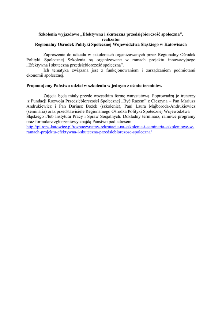 Szkolenia wyjazdowe „Efektywna i skuteczna przedsiębiorczość społeczna”. realizator Regionalny Ośrodek Polityki Społecznej Województwa Śląskiego w Katowicach Zaproszenie do udziału w szkoleniach organizowanych przez Regionalny Ośrodek Polityki Społecznej Szkolenia są organizowane w ramach projektu innowacyjnego „Efektywna i skuteczna przedsiębiorczość społeczna”. Ich tematyka związana jest z funkcjonowaniem i zarządzaniem podmiotami ekonomii społecznej. Proponujemy Państwu udział w szkoleniu w jednym z ośmiu terminów. Zajęcia będą miały przede wszystkim formę warsztatową. Poprowadzą je trenerzy z Fundacji Rozwoju Przedsiębiorczości Społecznej „Być Razem” z Cieszyna – Pan Mariusz Andrukiewicz i Pan Dariusz Bożek (szkolenie), Pani Laura Majboroda-Andrukiewicz (seminaria) oraz przedstawiciele Regionalnego Ośrodka Polityki Społecznej Województwa Śląskiego i/lub Instytutu Pracy i Spraw Socjalnych. Dokładny terminarz, ramowe programy oraz formularz zgłoszeniowy znajdą Państwo pod adresem: http://pi.rops-katowice.pl/rozpoczynamy-rekrutacje-na-szkolenia-i-seminaria-szkoleniowe-wramach-projektu-efektywna-i-skuteczna-przedsiebiorczosc-spoleczna/