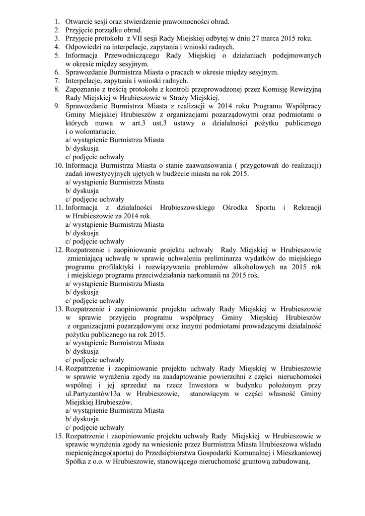Otwarcie sesji oraz stwierdzenie prawomocności obrad. Przyjęcie porządku obrad. Przyjęcie protokołu z VII sesji Rady Miejskiej odbytej w dniu 27 marca 2015 roku. Odpowiedzi na interpelacje, zapytania i wnioski radnych. Informacja Przewodniczącego Rady Miejskiej o działaniach podejmowanych w okresie między sesyjnym. 6. Sprawozdanie Burmistrza Miasta o pracach w okresie między sesyjnym. 7. Interpelacje, zapytania i wnioski radnych. 8. Zapoznanie z treścią protokołu z kontroli przeprowadzonej przez Komisję Rewizyjną Rady Miejskiej w Hrubieszowie w Straży Miejskiej. 9. Sprawozdanie Burmistrza Miasta z realizacji w 2014 roku Programu Współpracy Gminy Miejskiej Hrubieszów z organizacjami pozarządowymi oraz podmiotami o których mowa w art.3 ust.3 ustawy o działalności pożytku publicznego i o wolontariacie. a/ wystąpienie Burmistrza Miasta b/ dyskusja c/ podjęcie uchwały 10. Informacja Burmistrza Miasta o stanie zaawansowania ( przygotowań do realizacji) zadań inwestycyjnych ujętych w budżecie miasta na rok 2015. a/ wystąpienie Burmistrza Miasta b/ dyskusja c/ podjęcie uchwały 11. Informacja z działalności Hrubieszowskiego Ośrodka Sportu i Rekreacji w Hrubieszowie za 2014 rok. a/ wystąpienie Burmistrza Miasta b/ dyskusja c/ podjęcie uchwały 12. Rozpatrzenie i zaopiniowanie projektu uchwały Rady Miejskiej w Hrubieszowie zmieniającą uchwałę w sprawie uchwalenia preliminarza wydatków do miejskiego programu profilaktyki i rozwiązywania problemów alkoholowych na 2015 rok i miejskiego programu przeciwdziałania narkomanii na 2015 rok. a/ wystąpienie Burmistrza Miasta b/ dyskusja c/ podjęcie uchwały 13. Rozpatrzenie i zaopiniowanie projektu uchwały Rady Miejskiej w Hrubieszowie w sprawie przyjęcia programu współpracy Gminy Miejskiej Hrubieszów z organizacjami pozarządowymi oraz innymi podmiotami prowadzącymi działalność pożytku publicznego na rok 2015. a/ wystąpienie Burmistrza Miasta b/ dyskusja c/ podjęcie uchwały 14. Rozpatrzenie i zaopiniowanie projektu uchwały Rady Miejskiej w Hrubieszowie w sprawie wyrażenia zgody na zaadaptowanie powierzchni z części nieruchomości wspólnej i jej sprzedaż na rzecz Inwestora w budynku położonym przy ul.Partyzantów13a w Hrubieszowie, stanowiącym w części własność Gminy Miejskiej Hrubieszów. a/ wystąpienie Burmistrza Miasta b/ dyskusja c/ podjęcie uchwały 15. Rozpatrzenie i zaopiniowanie projektu uchwały Rady Miejskiej w Hrubieszowie w sprawie wyrażenia zgody na wniesienie przez Burmistrza Miasta Hrubieszowa wkładu niepieniężnego(aportu) do Przedsiębiorstwa Gospodarki Komunalnej i Mieszkaniowej Spółka z o.o. w Hrubieszowie, stanowiącego nieruchomość gruntową zabudowaną. 1. 2. 3. 4. 5. a/ wystąpienie Burmistrza Miasta b/ dyskusja c/ podjęcie uchwały 16. Rozpatrzenie i zaopiniowanie projektu uchwały Rady Miejskiej w Hrubieszowie w sprawie przyjęcia Strategii Rozwiązywania Problemów Społecznych Miasta Hrubieszowa na lata 2015 – 2020. a/ wystąpienie Burmistrza Miasta b/ dyskusja c/ podjęcie uchwały 17. Rozpatrzenie i zaopiniowanie projektu uchwały Rady Miejskiej w Hrubieszowie w sprawie przyjęcia Programu Wspierania Rodziny Miasta Hrubieszowa na lata 2015 – 2017. a/ wystąpienie Burmistrza Miasta b/ dyskusja c/ podjęcie uchwały 18. Rozpatrzenie i zaopiniowanie projektu uchwały Rady Miejskiej w Hrubieszowie w sprawie przyjęcia Programu Przeciwdziałania Przemocy w Rodzinie oraz Ochrony Ofiar Przemocy w Rodzinie Miasta Hrubieszowa na lata 2015 – 2017. a/ wystąpienie Burmistrza Miasta b/ dyskusja c/ podjęcie uchwały 19. Wolne wnioski. 20. Zakończenie sesji.