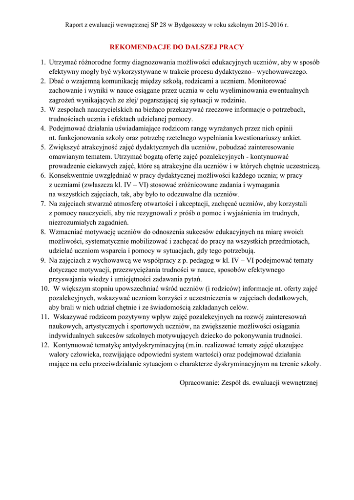 Raport z ewaluacji wewnętrznej SP 28 w Bydgoszczy w roku szkolnym 2015-2016 r. REKOMENDACJE DO DALSZEJ PRACY 1. Utrzymać różnorodne formy diagnozowania możliwości edukacyjnych uczniów, aby w sposób efektywny mogły być wykorzystywane w trakcie procesu dydaktyczno– wychowawczego. 2. Dbać o wzajemną komunikację między szkołą, rodzicami a uczniem. Monitorować zachowanie i wyniki w nauce osiągane przez ucznia w celu wyeliminowania ewentualnych zagrożeń wynikających ze złej/ pogarszającej się sytuacji w rodzinie. 3. W zespołach nauczycielskich na bieżąco przekazywać rzeczowe informacje o potrzebach, trudnościach ucznia i efektach udzielanej pomocy. 4. Podejmować działania uświadamiające rodzicom rangę wyrażanych przez nich opinii nt. funkcjonowania szkoły oraz potrzebę rzetelnego wypełniania kwestionariuszy ankiet. 5. Zwiększyć atrakcyjność zajęć dydaktycznych dla uczniów, pobudzać zainteresowanie omawianym tematem. Utrzymać bogatą ofertę zajęć pozalekcyjnych - kontynuować prowadzenie ciekawych zajęć, które są atrakcyjne dla uczniów i w których chętnie uczestniczą. 6. Konsekwentnie uwzględniać w pracy dydaktycznej możliwości każdego ucznia; w pracy z uczniami (zwłaszcza kl. IV – VI) stosować zróżnicowane zadania i wymagania na wszystkich zajęciach, tak, aby było to odczuwalne dla uczniów. 7. Na zajęciach stwarzać atmosferę otwartości i akceptacji, zachęcać uczniów, aby korzystali z pomocy nauczycieli, aby nie rezygnowali z próśb o pomoc i wyjaśnienia im trudnych, niezrozumiałych zagadnień. 8. Wzmacniać motywację uczniów do odnoszenia sukcesów edukacyjnych na miarę swoich możliwości, systematycznie mobilizować i zachęcać do pracy na wszystkich przedmiotach, udzielać uczniom wsparcia i pomocy w sytuacjach, gdy tego potrzebują. 9. Na zajęciach z wychowawcą we współpracy z p. pedagog w kl. IV – VI podejmować tematy dotyczące motywacji, przezwyciężania trudności w nauce, sposobów efektywnego przyswajania wiedzy i umiejętności zadawania pytań. 10. W większym stopniu upowszechniać wśród uczniów (i rodziców) informacje nt. oferty zajęć pozalekcyjnych, wskazywać uczniom korzyści z uczestniczenia w zajęciach dodatkowych, aby brali w nich udział chętnie i ze świadomością zakładanych celów. 11. Wskazywać rodzicom pozytywny wpływ zajęć pozalekcyjnych na rozwój zainteresowań naukowych, artystycznych i sportowych uczniów, na zwiększenie możliwości osiągania indywidualnych sukcesów szkolnych motywujących dziecko do pokonywania trudności. 12. Kontynuować tematykę antydyskryminacyjną (m.in. realizować tematy zajęć ukazujące walory człowieka, rozwijające odpowiedni system wartości) oraz podejmować działania mające na celu przeciwdziałanie sytuacjom o charakterze dyskryminacyjnym na terenie szkoły. Opracowanie: Zespół ds. ewaluacji wewnętrznej