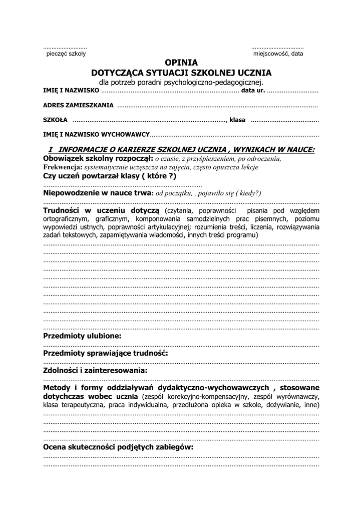 .......................... pieczęć szkoły ............................... miejscowość, data OPINIA DOTYCZĄCA SYTUACJI SZKOLNEJ UCZNIA dla potrzeb poradni psychologiczno-pedagogicznej. IMIĘ I NAZWISKO ........................................................................... data ur. ............................ ADRES ZAMIESZKANIA ............................................................................................................. SZKOŁA ..................................................................................., klasa ..................................... IMIĘ I NAZWISKO WYCHOWAWCY............................................................................................ I INFORMACJE O KARIERZE SZKOLNEJ UCZNIA , WYNIKACH W NAUCE: Obowiązek szkolny rozpoczął: o czasie, z przyśpieszeniem, po odroczeniu, Frekwencja: systematycznie uczęszcza na zajęcia, często opuszcza lekcje Czy uczeń powtarzał klasy ( które ?) ....................................................................................... Niepowodzenie w nauce trwa: od początku, , pojawiło się ( kiedy?) ....................................................................................................................................................... Trudności w uczeniu dotyczą (czytania, poprawności pisania pod względem ortograficznym, graficznym, komponowania samodzielnych prac pisemnych, poziomu wypowiedzi ustnych, poprawności artykulacyjnej; rozumienia treści, liczenia, rozwiązywania zadań tekstowych, zapamiętywania wiadomości, innych treści programu) ....................................................................................................................................................... ....................................................................................................................................................... ....................................................................................................................................................... ....................................................................................................................................................... ....................................................................................................................................................... ....................................................................................................................................................... ....................................................................................................................................................... ....................................................................................................................................................... ....................................................................................................................................................... ....................................................................................................................................................... ....................................................................................................................................................... Przedmioty ulubione: ....................................................................................................................................................... Przedmioty sprawiające trudność: ....................................................................................................................................................... Zdolności i zainteresowania: ....................................................................................................................................................... Metody i formy oddziaływań dydaktyczno-wychowawczych , stosowane dotychczas wobec ucznia (zespół korekcyjno-kompensacyjny, zespół wyrównawczy, klasa terapeutyczna, praca indywidualna, przedłużona opieka w szkole, dożywianie, inne) ....................................................................................................................................................... ....................................................................................................................................................... ....................................................................................................................................................... ....................................................................................................................................................... Ocena skuteczności podjętych zabiegów: ....................................................................................................................................................... ....................................................................................................................................................... II ZACHOWANIE SIĘ UCZNIA: Stosunek do obowiązków szkolnych (odrabianie prac pisemnych, nauka własna w domu, przygotowanie koniecznych podręczników, zeszytów, przyborów, materiałów zgodnie z poleceniem) ....................................................................................................................................................... ....................................................................................................................................................... ....................................................................................................................................................... ....................................................................................................................................................... Zachowanie się podczas lekcji: uczeń aktywny- bierny; samodzielny-niesamodzielny; zainteresowany- nie zainteresowany; szybki-wolny; wytrwały-niewytrwały; skoncentrowany trwale-