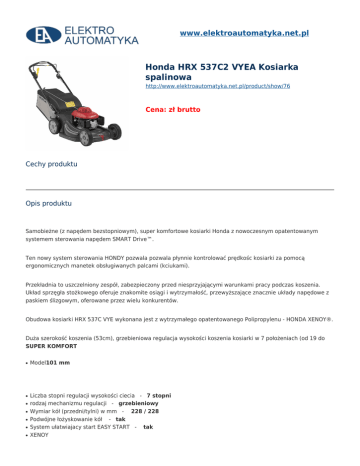 www.elektroautomatyka.net.pl Honda HRX 537C2 VYEA Kosiarka spalinowa http://www.elektroautomatyka.net.pl/product/show/76 Cena: zł brutto Cechy produktu Opis produktu Samobieżne (z napędem bezstopniowym), super komfortowe kosiarki Honda z nowoczesnym opatentowanym systemem sterowania napędem SMART Drive™. Ten nowy system sterowania HONDY pozwala pozwala płynnie kontrolować prędkośc kosiarki za pomocą ergonomicznych manetek obsługiwanych palcami (kciukami). Przekładnia to uszczelniony zespół, zabezpieczony przed niesprzyjającymi warunkami pracy podczas koszenia. Układ sprzęgła stożkowego oferuje znakomite osiągi i wytrzymałość, przewyższające znacznie układy napędowe z paskiem ślizgowym, oferowane przez wielu konkurentów. Obudowa kosiarki HRX 537C VYE wykonana jest z wytrzymałego opatentowanego Polipropylenu - HONDA XENOY®. Duża szerokość koszenia (53cm), grzebieniowa regulacja wysokości koszenia kosiarki w 7 położeniach (od 19 do SUPER KOMFORT ● ● ● ● ● ● ● Model101 mm Liczba stopni regulacji wysokości ciecia - 7 stopni rodzaj mechanizmu regulacji - grzebieniowy Wymiar kół (przedni/tylni) w mm - 228 / 228 Podwójne łożyskowanie kół - tak System ułatwiajacy start EASY START - tak XENOY ● ● ● ● ● ● ● Pojemność kosza - Dralon Maksymalne zużycie paliwa (l/godzinę) - 1,1 MasaHONDA ROTOSTOP® - tak HONDA VERSAMOW® tak Poziom hałasu dB(A) - 98 nowoczesny, opatentowany system sterowania napędem SMART Drive 1700 m2 ELEKTRO-AUTOMATYKA Sprzedaż elektronarzędzi, urządzeń spawalniczych, maszyn budowlanych, pneumatyki, narzędzi warsztatowych, firmowych ubrań roboczych oraz maszyn ogrodowo leśnych. Sklep Bochnia ul. Brzeska 50 32-700 Bochnia Sklep Brzesko ul. Szarych Szeregów 23 32-800 Brzesko Serwis, Magazyn ul. Św. Brata Alberta 4 32-800 Brzesko tel. 691 572 333 e-mail: [email protected] tel. 609 523 230 e-mail: [email protected] tel. 609 523 645 e-mail: [email protected]