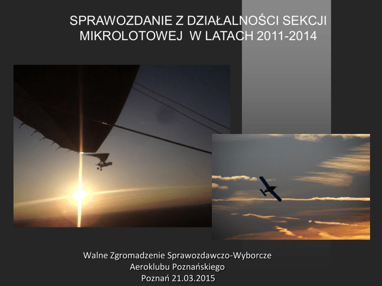 SPRAWOZDANIE Z DZIAŁALNOŚCI SEKCJI MIKROLOTOWEJ W LATACH 2011-2014 Walne Zgromadzenie Sprawozdawczo-Wyborcze Aeroklubu Poznańskiego Poznań 21.03.2015 Sekcja powstała 24 stycznia 1977r. Nazwa sekcji ewoluowała od "lotniowej" poprzez "ULM" by obecnie przybrać nazwę "mikrolotowa". Sekcja zrzesza grono ponad 35 pilotów i instruktorów. Wykorzystujemy lotnisko Kobylnica, a także lądowisko Słonawy OSL oraz wiele mniejszych lotnisk rozsianych po terenie całej Wielkopolski. Ogólnie w sezonach 2011 - 2014 na EPPK i OSL Słonawy członkowie sekcji wykonali 4718 lotów. Czas spędzony w powietrzu to 1709 godzin w tym samoloty ULM 806 godzin , motolotnie 903 godziny. Wyszkolono do PHGP – 7 pilotów Posiadany sprzęt: Samoloty UL – 10 Motolotnie -20 lotnie - 4 Posiadane uprawnienia : Instruktorzy: PHGP - 3 UAP - 2 Instruktorzy motolotni instr. pil. Romuald Ruks instr. pil. Mariusz Jarmuszczak instr. pil. Roman Wawrzyniak Instruktorzy samolotów UL instr. pil. Zbigniew Roszak instr. pil. Jerzy Siekierski W dniu 26. marca 2011 r. w siedzibie Aeroklubu Poznańskiego na lotnisku Kobylnica odbyło się zebranie wyborcze sekcji Mikrolotowej. Nowy skład rady sekcji Przewodniczącym został pil. Krzysztof Ciszewski Sekretarz Skarbnik Członek Członek Członek pil. Janusz Smólski pil. Jerzy Targowski instr.pil. Mariusz Jarmuszczak instr.pil. Romuald Ruks instr.pil. Roman Wawrzyniak X Międzynarodowe Mikrolotowe Zawody o Puchar Ziemi Obornickiej. W dniach 30.04-3.05. 2011 na lądowisku ObornikiSłonawy odbyły się X Mikrolotowe Zawody o Puchar Ziemi Obornickiej. Załogi startowały w klasach WL1,WL2,AL2. Zwycięzcami w poszczególnych klasach zostali: AL2- Dariusz Kędzierski/Mieczysław Szurgot (A.Szczeciński/ A. Włocławski) WL1- Adam Skowroński (OSL) WL2- Mariusz Jarmuszczak/Henryk Ruks (A.Poznański/OSL) 5 .05.2011 kolega pil. Krzysztof Pilawski brał udział w pokazie sprzętu lotniczego. Organizatorem było Gnieźnieńskie Stowarzyszenie Sportów Lotniczych W dniach 29. czerwca – 03. lipca 2011 roku na lotnisku Aeroklubu Włocławskiego w Kruszynie odbyły się 22. Mikrolotowe Mistrzostwa Polski. Mistrzostwa Polski rozgrywane były w klasach: motolotnie jedno- i dwumiejscowe (WL1, WL2) oraz dwumiejscowe samoloty ultralekkie (AL2). W zawodach udział wzięli reprezentanci Aeroklubu Poznańskiego: Roman Wawrzyniak zajął 2. miejsce w klasie WL1, a Andrzej Rybski 3. miejsce w klasie AL2. W dniach 20-21 sierpnia 2011r. odbył się XV Wielkopolski Rajd Mikrolotowy. Trasa Rajdu obejmowała lądowiska wokół Puszczy Noteckiej. Wylot z lotniska Kobylnica, zakończenie Rajdu na lądowisku w Trzebiczu Nowym podczas XXI Zlotu ULM. Dnia 10 września 2011 r. w pubie Dolot na lotnisku Kobylnica odbyło się spotkanie pilotów motolotniowych uczestników "XV Rajdu Wielkopolskiego wokół Puszczy Noteckiej". Tematem spotkania było omówienie i podsumowanie rajdu. Microlight World Cup 2011.Villamartin, Hiszpania. W dniach 12-16.10.2011r. w miejscowości Villamartin(Andaluzja) w Hiszpanii odbył się Mikrolotowy Puchar Świata. Zawody rozegrano w klasach motolotni jedno i dwumiejscowych(WL) oraz samolotów ultralekkich dwumiejscowych (AL2). Reprezentujący Aeroklub Poznański Mariusz Jarmuszczak i Romuald Ruks zajęli 4. miejsce (6195 pkt.). W klasie WL do miejsca na podium zabrakło im 5 pkt. Koledzy naszej sekcji latają również zimą na samolocikach ze zmodyfikowanym podwoziem i te loty nazywają potocznie „snow-fly” Pomysłodawcą tego sposobu latania jest nasz kolega Tadeusz Marcinkowski 24.03.2012 Koledzy naszej sekcji a także Gnieźnieńskiego Stowarzyszenia Sportów Lotniczych w ramach podnoszenia kwalifikacji uczestniczyli w kursie na radiooperatora stacji pokładowej. 22-24 czerwca 2012r. we Włocławku na lotnisku Kruszyn odbyły się Włocławskie Zawody Mikrolotowe. Roman Wawrzyniak zajął miejsce II, a Romuald Ruks III w klasie motolotni jednoosobowych. Mariusz Jarmuszczak uplasował się na IV miejscu w klasie samolotów dwuosobowych. W dniach 4-8 lipca 2012r. na terenie Aeroklubu Kamenica nad Cirochou odbyły się XII Otwarte Mikrolotowe Mistrzostwa Słowacji . Reprezentanci Aeroklubu Poznańskiego zajęli miejsca: 3. Roman Wawrzyniak i 6. Mariusz Jarmuszczak (w załodze z Robertem Hawrajem). W ramach Mistrzostw Słowacji rozegrano Mistrzostwa Polski. Roman Wawrzyniak zajął 1. miejsce w WL1 zdobywając jednocześnie tytuł Mistrza Polski, a Mariusz Jarmuszczak wywalczył w klasie WL2 miejsce 2. uzyskując jednocześnie tytuł wicemistrza Polski. 4.8.07.2012 kolega instruktor pilot Roman Wawrzyniak Zdobywa tytuł Mistrza Polski WL1 Kolega instruktor pilot Mariusz Jarmuszczak zdobywa tytuł wicemistrza Polski WL2 W dniach 7-18 sierpnia 2012r. w Marugan, w Hiszpanii odbyły się XIII Mikrolotowe Mistrzostwa Świata . W klasie motolotni dwuosobowych pilot Romuald Ruks z nawigatorem Mariuszem Jarmuszczakiem zajęli miejsce 13. W dniach 17-19 sierpnia 2012 roku w Trzebiczu Nowym odbył się XXII Zlot ULM, organizowany przez Elżbietę i Ryszarda Chwaliszów. 7-9.09.2012 koledzy z naszej sekcji brali udział w Międzynarodowym Rajdzie po Lotniskach Litwy 10.09.2012 sekcja spotkała się na pożegnaniu lata. W dniu 20 października 2012r. sekcja mikrolotowa wykonywała loty nocne. Loty sylwestrowe 2012 Częstochowa 23-25.05.2013 Kolega Andrzej Rybski biorąc udział XXV Mikrolotowych Mistrzostwach Polski zajął III miejsce w Klasie AL2 XXV Mikrolotowe Mistrzostwa Polski,(edycja motolotniowa) Słonawy W rozegranych na lotnisku w Słonawach w dniach 14-16 czerwca 2013r. XII Zawodach o Puchar Ziemi Obornickiej i XXV Mistrzostwach Polski (II część) Roman Wawrzyniak zajął miejsce 2. w klasie WL 1, Adam Skowroński 3, a Mariusz Jarmuszczak z nawigatorem 2. w klasie WL 2. Tytuły Mistrzów Polski wywalczyli Henryk Orwat (WL 1) i Dominika & Przemysław Jurkiewiczowie (WL 2). Załoga Janusz Smólski i Jerzy Targowski uplasowała się na 8 pozycji. Koledzy Roman Wawrzyniak, Janu