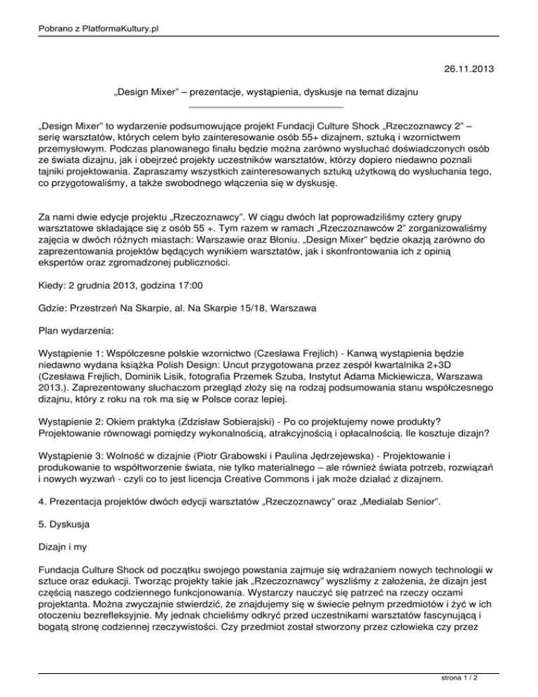 Pobrano z PlatformaKultury.pl 26.11.2013 „Design Mixer” – prezentacje, wystąpienia, dyskusje na temat dizajnu ____________________________ „Design Mixer” to wydarzenie podsumowujące projekt Fundacji Culture Shock „Rzeczoznawcy 2” – serię warsztatów, których celem było zainteresowanie osób 55+ dizajnem, sztuką i wzornictwem przemysłowym. Podczas planowanego finału będzie można zarówno wysłuchać doświadczonych osób ze świata dizajnu, jak i obejrzeć projekty uczestników warsztatów, którzy dopiero niedawno poznali tajniki projektowania. Zapraszamy wszystkich zainteresowanych sztuką użytkową do wysłuchania tego, co przygotowaliśmy, a także swobodnego włączenia się w dyskusję. Za nami dwie edycje projektu „Rzeczoznawcy”. W ciągu dwóch lat poprowadziliśmy cztery grupy warsztatowe składające się z osób 55 +. Tym razem w ramach „Rzeczoznawców 2” zorganizowaliśmy zajęcia w dwóch różnych miastach: Warszawie oraz Błoniu. „Design Mixer” będzie okazją zarówno do zaprezentowania projektów będących wynikiem warsztatów, jak i skonfrontowania ich z opinią ekspertów oraz zgromadzonej publiczności. Kiedy: 2 grudnia 2013, godzina 17:00 Gdzie: Przestrzeń Na Skarpie, al. Na Skarpie 15/18, Warszawa Plan wydarzenia: Wystąpienie 1: Współczesne polskie wzornictwo (Czesława Frejlich) - Kanwą wystąpienia będzie niedawno wydana książka Polish Design: Uncut przygotowana przez zespół kwartalnika 2+3D (Czesława Frejlich, Dominik Lisik, fotografia Przemek Szuba, Instytut Adama Mickiewicza, Warszawa 2013.). Zaprezentowany słuchaczom przegląd złoży się na rodzaj podsumowania stanu współczesnego dizajnu, który z roku na rok ma się w Polsce coraz lepiej. Wystąpienie 2: Okiem praktyka (Zdzisław Sobierajski) - Po co projektujemy nowe produkty? Projektowanie równowagi pomiędzy wykonalnością, atrakcyjnością i opłacalnością. Ile kosztuje dizajn? Wystąpienie 3: Wolność w dizajnie (Piotr Grabowski i Paulina Jędrzejewska) - Projektowanie i produkowanie to współtworzenie świata, nie tylko materialnego – ale również świata potrzeb, rozwiązań i nowych wyzwań - czyli co to jest licencja Creative Commons i jak może działać z dizajnem. 4. Prezentacja projektów dwóch edycji warsztatów „Rzeczoznawcy” oraz „Medialab Senior”. 5. Dyskusja Dizajn i my Fundacja Culture Shock od początku swojego powstania zajmuje się wdrażaniem nowych technologii w sztuce oraz edukacji. Tworząc projekty takie jak „Rzeczoznawcy” wyszliśmy z założenia, że dizajn jest częścią naszego codziennego funkcjonowania. Wystarczy nauczyć się patrzeć na rzeczy oczami projektanta. Można zwyczajnie stwierdzić, że znajdujemy się w świecie pełnym przedmiotów i żyć w ich otoczeniu bezrefleksyjnie. My jednak chcieliśmy odkryć przed uczestnikami warsztatów fascynującą i bogatą stronę codziennej rzeczywistości. Czy przedmiot został stworzony przez człowieka czy przez strona 1 / 2 Pobrano z PlatformaKultury.pl naturę? Po co ktoś go wyprodukował? Czy ułatwia nam życie, czy raczej je utrudnia? Czy użytkownicy go potrzebują? Czy dobrze działa? Czy można go ulepszyć? Czy jest ładny? Czy jakichś przedmiotów w naszym otoczeniu brakuje? W zetknięciu z pozornie szarą rzeczywistością możemy zadawać setki pytań! Dizajn i otwartość Ważnym elementem naszych działań jako fundacji jest też zapobieganie wykluczeniu. Projekty kierujemy do osób w różnym wieku i z różnych środowisk. Bliska nam jest również filozofia związana z Creative Commons. W dizajnie otwartość może wiązać się z projektowaniem uniwersalnym, które jest nastawione na rozwiązania przeznaczone dla jak największej liczby odbiorców, pamiętając o tym, jak bardzo mogą się od siebie różnić. Osoby, które wzięły udział w warsztatach „Rzeczoznawcy 2” uczyliśmy podstaw projektowania, staraliśmy rozwinąć ich umiejętności i pobudzić kreatywność, ale chcieliśmy też wyczulić je na pewne cechy naszego otoczenia, które mogą być przyczyną wykluczenia. Powstałe projekty nie wiążą się z narzuconą z góry tematyką, ale są przede wszystkim odpowiedzią na zauważone przez uczestników problemy i potrzeby. Zapraszamy wszystkich zainteresowanych dizajnem! Więcej informacji o projekcie oraz kontakt: „Design Mixer” - wydarzenie Fundacji Culture Shock tel: 788 821 824 [email protected] http://www.cultureshock.pl/projekty/rzeczoznawcy-2 Projekt "Rzeczoznawcy 2" dofinansowano ze środków Ministerstwa Kultury i Dziedzictwa Narodowego. Sylwetki zaproszonych gości Czesława Frejlich - profesorka w krakowskiej i warszawskiej Akademii Sztuk Pięknych. Redaktorka naczelna magazynu projektowego 2+3d. Autorka publikacji oraz kuratorka wystaw dotyczących wzornictwa. Zdzisław Sobierajski - przedsiębiorca z 25 letnim doświadczeniem. Od czterech lat prowadzący program stażowy dla młodych projektantów www.polyester-design.com. Od trzech lat pracuje z projektantami i przemysłem tworząc zespoły projektowo- wdrożeniowe. Piotr Grabowski i Paulina Jędrzejewska - twórcy Hedoco - pierwszej marki w Europie środkowo-wschodniej, która produkuje i sprzedaje wyłącznie open design, gdzie odbiorca – całkowicie legalnie – może stać się jednocześnie projektantem, producentem i nabywcą, opowiedzą o swojej działalności. strona 2 / 2