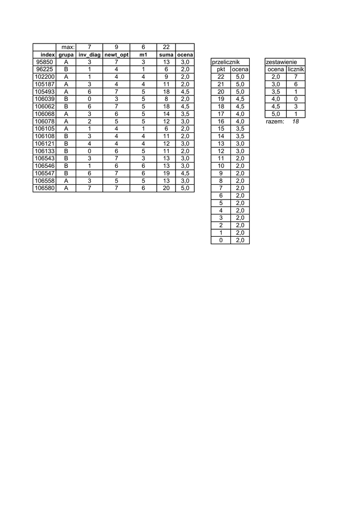 max: 7 9 index grupa inv_diag newt_opt 95850 96225 102200 105187 105493 106039 106062 106068 106078 106105 106108 106121 106133 106543 106546 106547 106558 106580 A B A A A B B A A A B B B B B B A A 3 1 1 3 6 0 6 3 2 1 3 4 0 3 1 6 3 7 7 4 4 4 7 3 7 6 5 4 4 4 6 7 6 7 5 7 6 m1 3 1 4 4 5 5 5 5 5 1 4 4 5 3 6 6 5 6 22 suma ocena 13 6 9 11 18 8 18 14 12 6 11 12 11 13 13 19 13 20 3,0 2,0 2,0 2,0 4,5 2,0 4,5 3,5 3,0 2,0 2,0 3,0 2,0 3,0 3,0 4,5 3,0 5,0 przelicznik pkt ocena 22 5,0 21 5,0 20 5,0 19 4,5 18 4,5 17 4,0 16 4,0 15 3,5 14 3,5 13 3,0 12 3,0 11 2,0 10 2,0 9 2,0 8 2,0 7 2,0 6 2,0 5 2,0 4 2,0 3 2,0 2 2,0 1 2,0 0 2,0 zestawienie ocena licznik 2,0 7 3,0 6 3,5 1 4,0 0 4,5 3 5,0 1 razem: 18