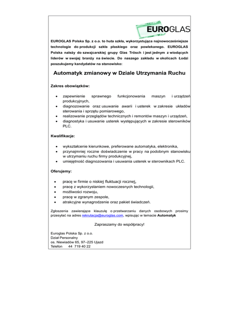 EUROGLAS Polska Sp. z o.o. to huta szkła, wykorzystująca najnowocześniejsze technologie do produkcji szkła płaskiego oraz powlekanego. EUROGLAS Polska należy do szwajcarskiej grupy Glas Trösch i jest jednym z wiodących liderów w swojej branży na świecie. Do naszego zakładu w okolicach Łodzi poszukujemy kandydatów na stanowisko: Automatyk zmianowy w Dziale Utrzymania Ruchu Zakres obowiązków: zapewnienie sprawnego funkcjonowania maszyn i urządzeń produkcyjnych, diagnozowanie oraz usuwanie awarii i usterek w zakresie układów sterowania i sprzętu pomiarowego, realizowanie przeglądów technicznych i remontów maszyn i urządzeń, diagnostyka i usuwanie usterek występujących w zakresie sterowników PLC. Kwalifikacje: wykształcenie kierunkowe, preferowane automatyka, elektronika, przynajmniej roczne doświadczenie w pracy na podobnym stanowisku w utrzymaniu ruchu firmy produkcyjnej, umiejętność diagnozowania i usuwania usterek w sterownikach PLC. Oferujemy: pracę w firmie o niskiej fluktuacji rocznej, pracę z wykorzystaniem nowoczesnych technologii, możliwości rozwoju, pracę w zgranym zespole, atrakcyjne wynagrodzenie oraz pakiet świadczeń. Zgłoszenia zawierające klauzulę o przetwarzaniu danych osobowych prosimy przesyłać na adres [email protected], wpisując w temacie Automatyk Zapraszamy do współpracy! Euroglas Polska Sp. z o.o. Dział Personalny os. Niewiadów 65, 97–225 Ujazd Telefon 44 719 40 22
