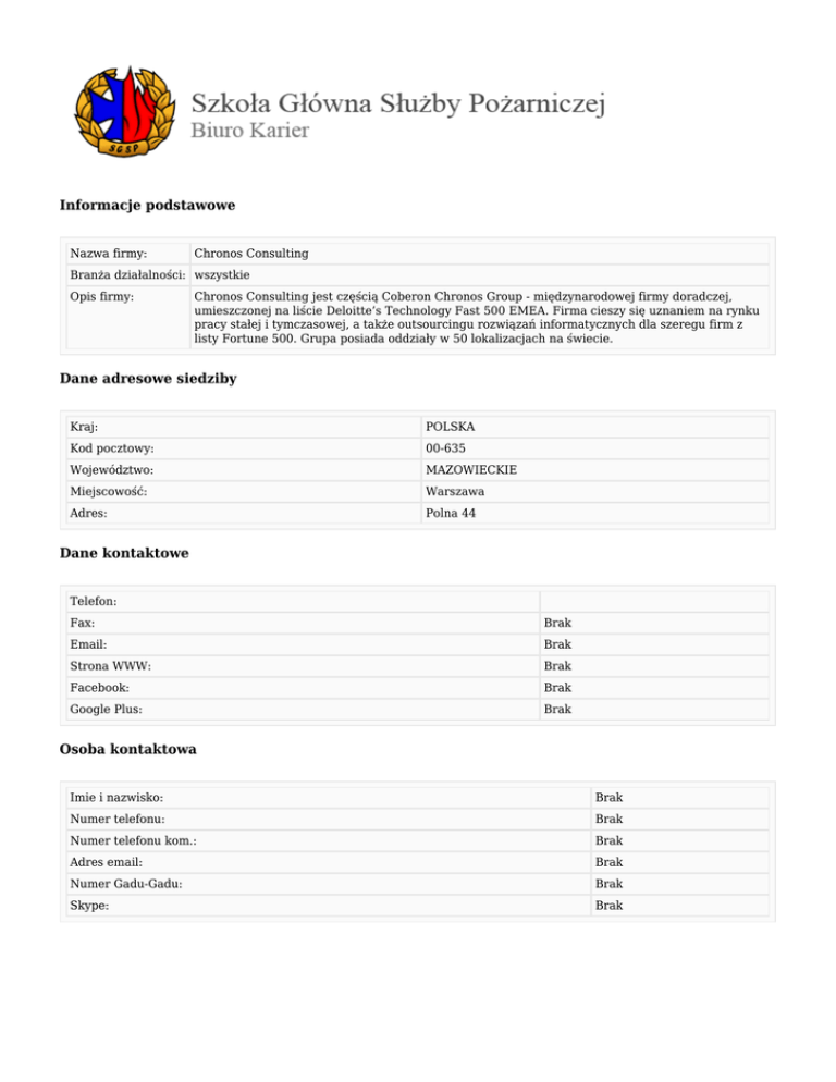 Informacje podstawowe Nazwa firmy: Chronos Consulting Branża działalności: wszystkie Opis firmy: Chronos Consulting jest częścią Coberon Chronos Group - międzynarodowej firmy doradczej, umieszczonej na liście Deloitte’s Technology Fast 500 EMEA. Firma cieszy się uznaniem na rynku pracy stałej i tymczasowej, a także outsourcingu rozwiązań informatycznych dla szeregu firm z listy Fortune 500. Grupa posiada oddziały w 50 lokalizacjach na świecie. Dane adresowe siedziby Kraj: POLSKA Kod pocztowy: 00-635 Województwo: MAZOWIECKIE Miejscowość: Warszawa Adres: Polna 44 Dane kontaktowe Telefon: Fax: Brak Email: Brak Strona WWW: Brak Facebook: Brak Google Plus: Brak Osoba kontaktowa Imie i nazwisko: Brak Numer telefonu: Brak Numer telefonu kom.: Brak Adres email: Brak Numer Gadu-Gadu: Brak Skype: Brak