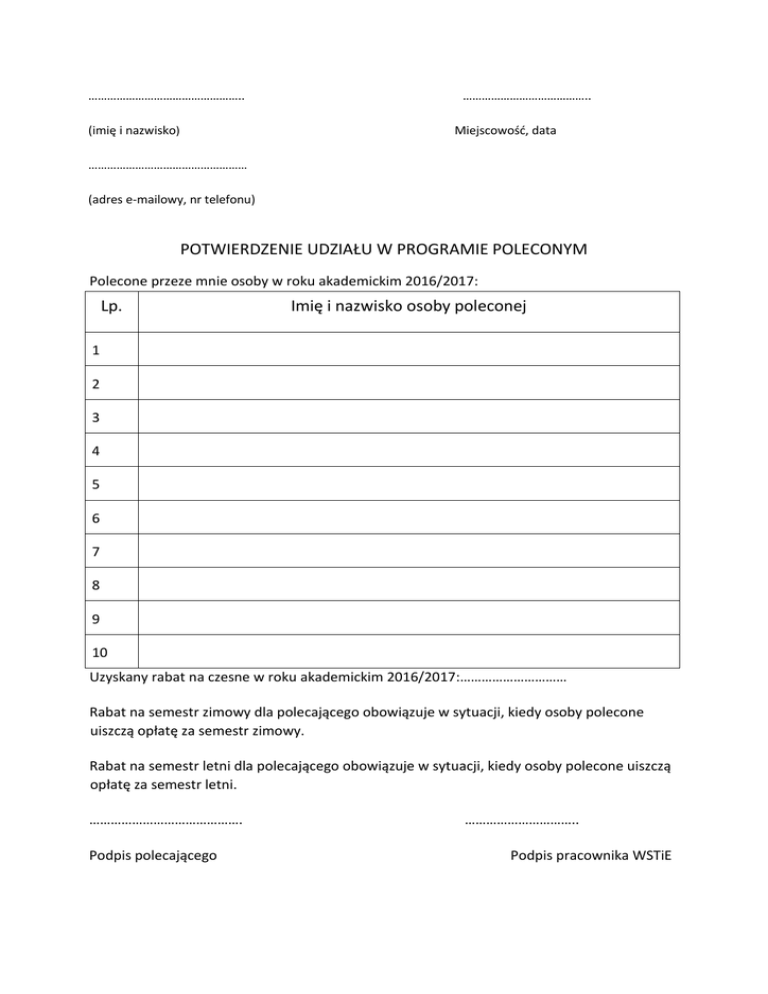 ………………………………………….. (imię i nazwisko) ………………………………….. Miejscowość, data …………………………………………… (adres e-mailowy, nr telefonu) POTWIERDZENIE UDZIAŁU W PROGRAMIE POLECONYM Polecone przeze mnie osoby w roku akademickim 2016/2017: Lp. Imię i nazwisko osoby poleconej 1 2 3 4 5 6 7 8 9 10 Uzyskany rabat na czesne w roku akademickim 2016/2017:………………………… Rabat na semestr zimowy dla polecającego obowiązuje w sytuacji, kiedy osoby polecone uiszczą opłatę za semestr zimowy. Rabat na semestr letni dla polecającego obowiązuje w sytuacji, kiedy osoby polecone uiszczą opłatę za semestr letni. ……………………………………. Podpis polecającego ………………………….. Podpis pracownika WSTiE