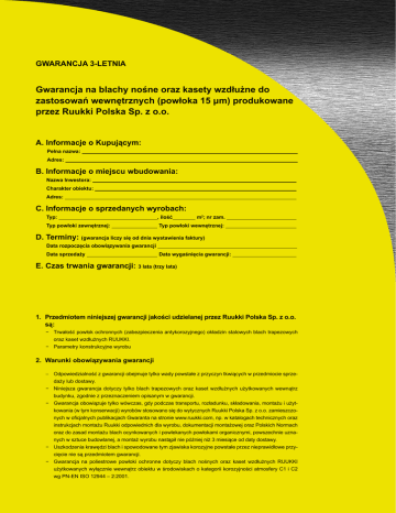GWARANCJA 3-LETNIA Gwarancja na blachy nośne oraz kasety wzdłużne do zastosowań wewnętrznych (powłoka 15 μm) produkowane przez Ruukki Polska Sp. z o.o. A. Informacje o Kupującym: Pełna nazwa: Adres: B. Informacje o miejscu wbudowania: Nazwa Inwestora: Charakter obiektu: Adres: C. Informacje o sprzedanych wyrobach: Typ: , ilość m2; nr zam. Typ powłoki zewnętrznej: Typ powłoki wewnętrznej: D. Terminy: (gwarancja liczy się od dnia wystawienia faktury) Data rozpoczęcia obowiązywania gwarancji Data sprzedaży Data wygaśnięcia gwarancji: E. Czas trwania gwarancji: 3 lata (trzy lata) 1. Przedmiotem niniejszej gwarancji jakości udzielanej przez Ruukki Polska Sp. z o.o. są: − Trwałość powłok ochronnych (zabezpieczenia antykorozyjnego) okładzin stalowych blach trapezowych oraz kaset wzdłużnych RUUKKI. − Parametry konstrukcyjne wyrobu 2. Warunki obowiązywania gwarancji − Odpowiedzialność z gwarancji obejmuje tylko wady powstałe z przyczyn tkwiących w przedmiocie sprzedaży lub dostawy. − Niniejsza gwarancja dotyczy tylko blach trapezowych oraz kaset wzdłużnych użytkowanych wewnątrz budynku, zgodnie z przeznaczeniem opisanym w gwarancji. − Gwarancja obowiązuje tylko wówczas, gdy podczas transportu, rozładunku, składowania, montażu i użytkowania (w tym konserwacji) wyrobów stosowano się do wytycznych Ruukki Polska Sp. z o.o. zamieszczonych w oficjalnych publikacjach Gwaranta na stronie www.ruukki.com, np. w katalogach technicznych oraz instrukcjach montażu Ruukki odpowiednich dla wyrobu, dokumentacji montażowej oraz Polskich Normach oraz do zasad montażu blach ocynkowanych i powlekanych powłokami organicznymi, powszechnie uznanych w sztuce budowlanej, a montaż wyrobu nastąpił nie później niż 3 miesiące od daty dostawy. − Uszkodzenia krawędzi blach i spowodowane tym zjawiska korozyjne powstałe przez nieprawidłowe przycięcie nie są przedmiotem gwarancji. − Gwarancja na poliestrowe powłoki ochronne dotyczy blach nośnych oraz kaset wzdłużnych RUUKKI użytkowanych wyłącznie wewnątrz obiektu w środowiskach o kategorii korozyjności atmosfery C1 i C2 wg PN-EN ISO 12944 – 2:2001. − Gwarancja nie obejmuje lakieru ochronnego strony niewidocznej blachy trapezowej lub kasety wzdłużnej (lub nieprzeznaczonej do kontaktu ze środowiskiem zewnętrznym), zarówno pod względem ewentualnych uszkodzeń, odbarwień koloru jak i przyczepności. − Warunek zabezpieczenia antykorozyjnego uważa się za spełniony, gdy ewentualne zjawiska korozyjne obejmują nie więcej niż 5% całkowitej powierzchni blach. Gwarancja nie obejmuje starzenia się powłok w postaci zmiany barwy (kredowanie) i połysku. − Gwarancja nie obejmuje uszkodzeń mechanicznych oraz szkód wywołanych długotrwałym, bezpośrednim kontaktem blach z zanieczyszczeniami organicznymi, długotrwałym pozostawaniem powłoki w stanie mokrym na skutek skraplania oparów spowodowanego niewłaściwą wentylacją wnętrza budynku, a także długotrwałym działaniem temperatury powyżej 60 ºC. − Gwarancja na poliestrowe powłoki ochronne blach nie obowiązuje w przypadku użytkowania blach niezgodnie z przeznaczeniem, a w szczególności zastosowania do czyszczenia ich powierzchni agresywnych, kwaśnych lub alkalicznych środków myjących i jeżeli wyrób został narażony nawet na krótkotrwały kontakt z agresywnymi środkami chemicznymi (np. opary siarki, amoniak, kwasy, tłuszcze itp.). − Do czyszczenia zabrudzonych powierzchni blach należy używać obojętnych lub lekko alkalicznych środków myjących, stosowanych w gospodarstwie domowym. Oczyszczana powierzchnia powinna zostać starannie spłukana wodą. Gwarancja nie obejmuje wad powstałych w wyniku stosowania rozpuszczalników organicznych i środków ściernych. − Gwarancja nie obowiązuje, jeżeli montaż materiału miał miejsce w bezpośredniej bliskości innego metalu powodującego różnicę w potencjale elektrycznym. − Gwarancja nie obejmuje wad powstałych w wyniku działania pozostawionych na powierzchni blach opiłków metalowych powstałych podczas cięcia, wiercenia lub przykręcania blach oraz wystawienia materiału na działanie wody morskiej lub mgły solnej. − Gwarancja nie obejmuje różnic odcieni blach powlekanych dotyczących wyrobów nowych i nie użytkowanych, a wynikających z dopuszczalnych tolerancji odcienia koloru RAL w odniesieniu do przedmiotowych wytycznych hut będących producentem blachy powlekanej lub wynikających z zastosowania innej technologii nanoszenia powłoki malarskiej. − Gwarancja nie obejmuje ewentualnych poprawek lakierniczych. − Gwarancją nie są objęte naprawy podjęte przez Kupującego we własnym zakresie i spowodowanych tym wad. − Gwarancja na powłoki ochronne obowiązuje tylko dla blach jednokrotnie montowanych do konstrukcji nośnej. Nie podlegają gwarancji blachy demontowane ani blachy narażone na korozję poprzez kontakt z produktami korozji innych elementów budowlanych jak łączniki, instalacje odgromowe itp. 3. Prawo do świadczeń gwarancyjnych − Gwarancja obejmuje wyłącznie wyroby wyprodukowane przez Gwaranta. − Na produkty (inne składniki systemu elewacyjnego lub dachowego) nie wyprodukowane przez Gwaranta obowiązują gwarancje ich producentów. − Za właściwy dobór i zastosowanie wyrobu zgodnie z Aprobatą Techniczną, Polskimi Normami lub innymi dokumentami odniesienia odpowiedzialność ponoszą osoby pełniące samodzielne funkcje techniczne w budownictwie, a nie Gwarant. − Odpowiedzialność Gwaranta jest zawsze ograniczona do wartości dostarczonego towaru i nie obejmuje wszelkich innych szkód wywołanych stwierdzonymi wadami. − Obowiązywanie postanowień niniejszej gwarancji, za wyjątkiem punktu 4, uzależnione jest od dokonania przez Kupującego pełnej płatności za dostarczony towar bez żadnych potrąceń. Kupującemu nie przysługują uprawnienia z tytułu rękojmi, nawet w przypadku, gdy pozosta