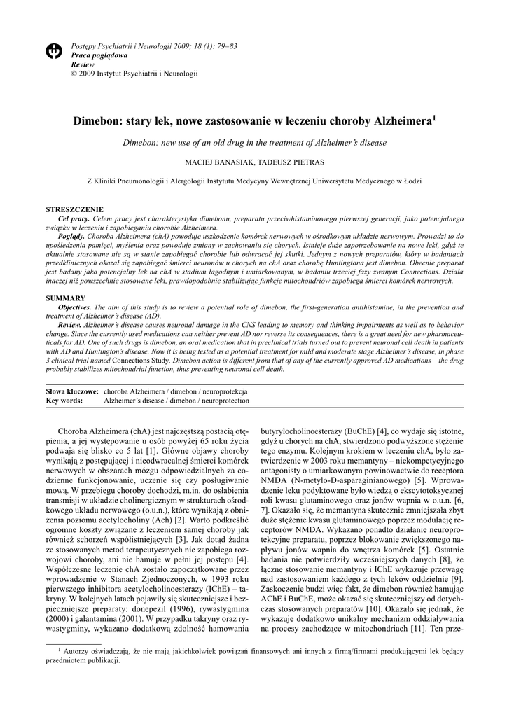 Postêpy Psychiatrii i Neurologii 2009; 18 (1): 7983 Praca pogl¹dowa Review © 2009 Instytut Psychiatrii i Neurologii Dimebon: stary lek, nowe zastosowanie w leczeniu choroby Alzheimera1 Dimebon: new use of an old drug in the treatment of Alzheimers disease MACIEJ BANASIAK, TADEUSZ PIETRAS Z Kliniki Pneumonologii i Alergologii Instytutu Medycyny Wewnêtrznej Uniwersytetu Medycznego w £odzi STRESZCZENIE Cel pracy. Celem pracy jest charakterystyka dimebonu, preparatu przeciwhistaminowego pierwszej generacji, jako potencjalnego zwi¹zku w leczeniu i zapobieganiu chorobie Alzheimera. Pogl¹dy. Choroba Alzheimera (chA) powoduje uszkodzenie komórek nerwowych w orodkowym uk³adzie nerwowym. Prowadzi to do upoledzenia pamiêci, mylenia oraz powoduje zmiany w zachowaniu siê chorych. Istnieje du¿e zapotrzebowanie na nowe leki, gdy¿ te aktualnie stosowane nie s¹ w stanie zapobiegaæ chorobie lub odwracaæ jej skutki. Jednym z nowych preparatów, który w badaniach przedklinicznych okaza³ siê zapobiegaæ mierci neuronów u chorych na chA oraz chorobê Huntingtona jest dimebon. Obecnie preparat jest badany jako potencjalny lek na chA w stadium ³agodnym i umiarkowanym, w badaniu trzeciej fazy zwanym Connections. Dzia³a inaczej ni¿ powszechnie stosowane leki, prawdopodobnie stabilizuj¹c funkcje mitochondriów zapobiega mierci komórek nerwowych. SUMMARY Objectives. The aim of this study is to review a potential role of dimebon, the first-generation antihistamine, in the prevention and treatment of Alzheimers disease (AD). Review. Alzheimers disease causes neuronal damage in the CNS leading to memory and thinking impairments as well as to behavior change. Since the currently used medications can neither prevent AD nor reverse its consequences, there is a great need for new pharmaceuticals for AD. One of such drugs is dimebon, an oral medication that in preclinical trials turned out to prevent neuronal cell death in patients with AD and Huntingtons disease. Now it is being tested as a potential treatment for mild and moderate stage Alzheimers disease, in phase 3 clinical trial named Connections Study. Dimebon action is different from that of any of the currently approved AD medications the drug probably stabilizes mitochondrial function, thus preventing neuronal cell death. S³owa kluczowe: choroba Alzheimera / dimebon / neuroprotekcja Key words: Alzheimers disease / dimebon / neuroprotection Choroba Alzheimera (chA) jest najczêstsz¹ postaci¹ otêpienia, a jej wystêpowanie u osób powy¿ej 65 roku ¿ycia podwaja siê blisko co 5 lat [1]. G³ówne objawy choroby wynikaj¹ z postêpuj¹cej i nieodwracalnej mierci komórek nerwowych w obszarach mózgu odpowiedzialnych za codzienne funkcjonowanie, uczenie siê czy pos³ugiwanie mow¹. W przebiegu choroby dochodzi, m.in. do os³abienia transmisji w uk³adzie cholinergicznym w strukturach orodkowego uk³adu nerwowego (o.u.n.), które wynikaj¹ z obni¿enia poziomu acetylocholiny (Ach) [2]. Warto podkreliæ ogromne koszty zwi¹zane z leczeniem samej choroby jak równie¿ schorzeñ wspó³istniej¹cych [3]. Jak dot¹d ¿adna ze stosowanych metod terapeutycznych nie zapobiega rozwojowi choroby, ani nie hamuje w pe³ni jej postêpu [4]. Wspó³czesne leczenie chA zosta³o zapocz¹tkowane przez wprowadzenie w Stanach Zjednoczonych, w 1993 roku pierwszego inhibitora acetylocholinoesterazy (IChE) takryny. W kolejnych latach pojawi³y siê skuteczniejsze i bezpieczniejsze preparaty: donepezil (1996), rywastygmina (2000) i galantamina (2001). W przypadku takryny oraz rywastygminy, wykazano dodatkow¹ zdolnoæ hamowania butyrylocholinoesterazy (BuChE) [4], co wydaje siê istotne, gdy¿ u chorych na chA, stwierdzono podwy¿szone stê¿enie tego enzymu. Kolejnym krokiem w leczeniu chA, by³o zatwierdzenie w 2003 roku memantyny niekompetycyjnego antagonisty o umiarkowanym powinowactwie do receptora NMDA (N-metylo-D-asparaginianowego) [5]. Wprowadzenie leku podyktowane by³o wiedz¹ o ekscytotoksycznej roli kwasu glutaminowego oraz jonów wapnia w o.u.n. [6, 7]. Okaza³o siê, ¿e memantyna skutecznie zmniejsza³a zbyt du¿e stê¿enie kwasu glutaminowego poprzez modulacjê receptorów NMDA. Wykazano ponadto dzia³anie neuroprotekcyjne preparatu, poprzez blokowanie zwiêkszonego nap³ywu jonów wapnia do wnêtrza komórek [5]. Ostatnie badania nie potwierdzi³y wczeniejszych danych [8], ¿e ³¹czne stosowanie memantyny i IChE wykazuje przewagê nad zastosowaniem ka¿dego z tych leków oddzielnie [9]. Zaskoczenie budzi wiêc fakt, ¿e dimebon równie¿ hamuj¹c AChE i BuChE, mo¿e okazaæ siê skuteczniejszy od dotychczas stosowanych preparatów [10]. Okaza³o siê jednak, ¿e wykazuje dodatkowo unikalny mechanizm oddzia³ywania na procesy zachodz¹ce w mitochondriach [11]. Ten prze- 1 Autorzy owiadczaj¹, ¿e nie maj¹ jakichkolwiek powi¹zañ finansowych ani innych z firm¹/firmami produkuj¹cymi lek bêd¹cy przedmiotem publikacji. 80 Maciej Banasiak, Tadeusz Pietras CH3 N N N H3C CH 3 Rycina 1. Struktura chemiczna dimebonu [2,8-dimethyl-5-[2-(6-methyl-3-pyridyl)ethyl]-3,4-dihydro-1H-pyrido[4,3-b]indole] Fig. 1. Chemical structure of dimebon. ciwalergiczny lek zastosowany po raz pierwszy dok³adnie przed 25 laty, nastêpnie zapomniany i ponownie w ostatnich latach odkryty wzbudzi³ du¿e zainteresowanie ze wzglêdu na po³¹czenie w swoim mechanizmie dzia³ania cech zarówno IChE jak i antagonisty NMDA [12]. CHARAKTERYSTYKA DIMEBONU Dimebon (2,3,4,5-tetrahydro-2,8-dimetylo-5-[2-(6-metylo-3-pirydynylo)etylo]-1H-pirydo[4,3-b] indol (ryc. 1), zosta³ po raz pierwszy dopuszczony do sprzeda¿y przez Ministerstwo Zdrowia by³ego Zwi¹zku Radzieckiego w 1983 roku jako lek przeciwalergiczny stosowany na alergiczny nie¿yt nosa i atopowe zapalenie skóry [13]. Sprzedawany by³ w postaci tabletek doustnych jako lek OTC (over-the-counter) przez niemal 20 lat [12]. Przez okres ten sprzedano oko³o 28 milionów tabletek. Poniewa¿ znany wówczas mechanizm jego dzia³