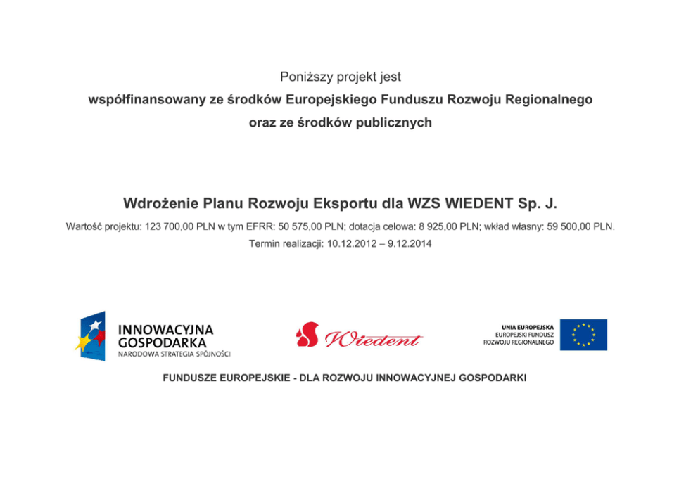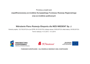 Poniższy projekt jest współfinansowany ze środków Europejskiego Funduszu Rozwoju Regionalnego oraz ze środków publicznych Wdrożenie Planu Rozwoju Eksportu dla WZS WIEDENT Sp. J. Wartość projektu: 123 700,00 PLN w tym EFRR: 50 575,00 PLN; dotacja celowa: 8 925,00 PLN; wkład własny: 59 500,00 PLN. Termin realizacji: 10.12.2012 – 9.12.2014 FUNDUSZE EUROPEJSKIE - DLA ROZWOJU INNOWACYJNEJ GOSPODARKI Poniższe projekty były współfinansowane przez Unię Europejską z Europejskiego Funduszu Rozwoju Regionalnego oraz ze środków publicznych Udział w targach IDS 2009 i IDS 2011 jako wystawca FUNDUSZE EUROPEJSKIE DLA ROZWOJU REGIONU ŁÓDZKIEGO Przygotowanie Planu Rozwoju Eksportu dla WZS WIEDENT Sp. J. Wartość projektu: 12 500,00 PLN w tym EFRR: 8 500,00 PLN; dotacja celowa: 1 500,00 PLN; wkład własny: 2 500,00 PLN. Termin realizacji: 21.03.2011 – 30.06.2011 FUNDUSZE EUROPEJSKIE - DLA ROZWOJU INNOWACYJNEJ GOSPODARKI